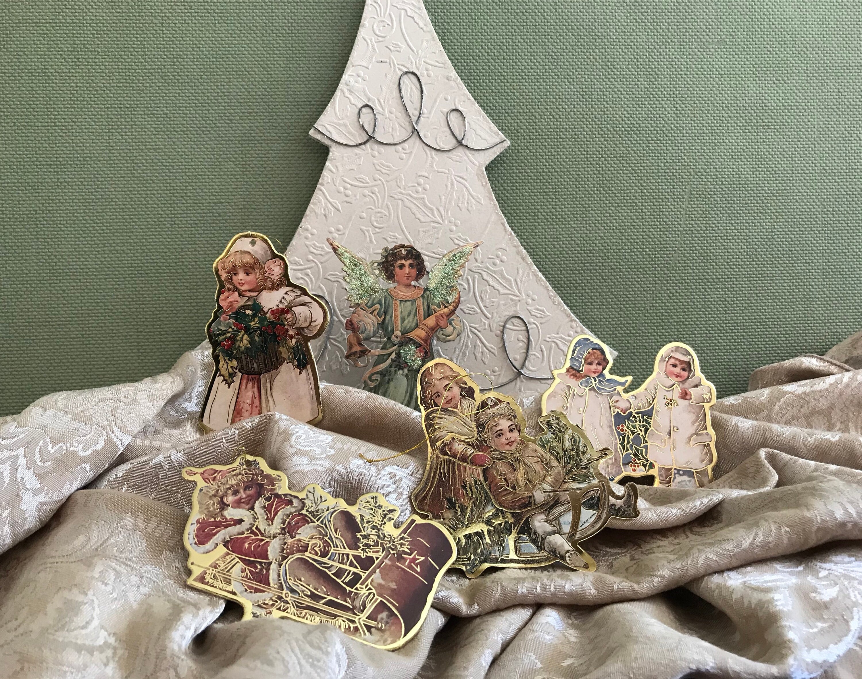 This is a set of 5 Vintage Victorian Christmas Ornaments. The ornaments are in soft shades blush pink, pastel green and blue with gold outlines. Made of printed pasteboard the ornaments are die cut to outline the shape of the images.