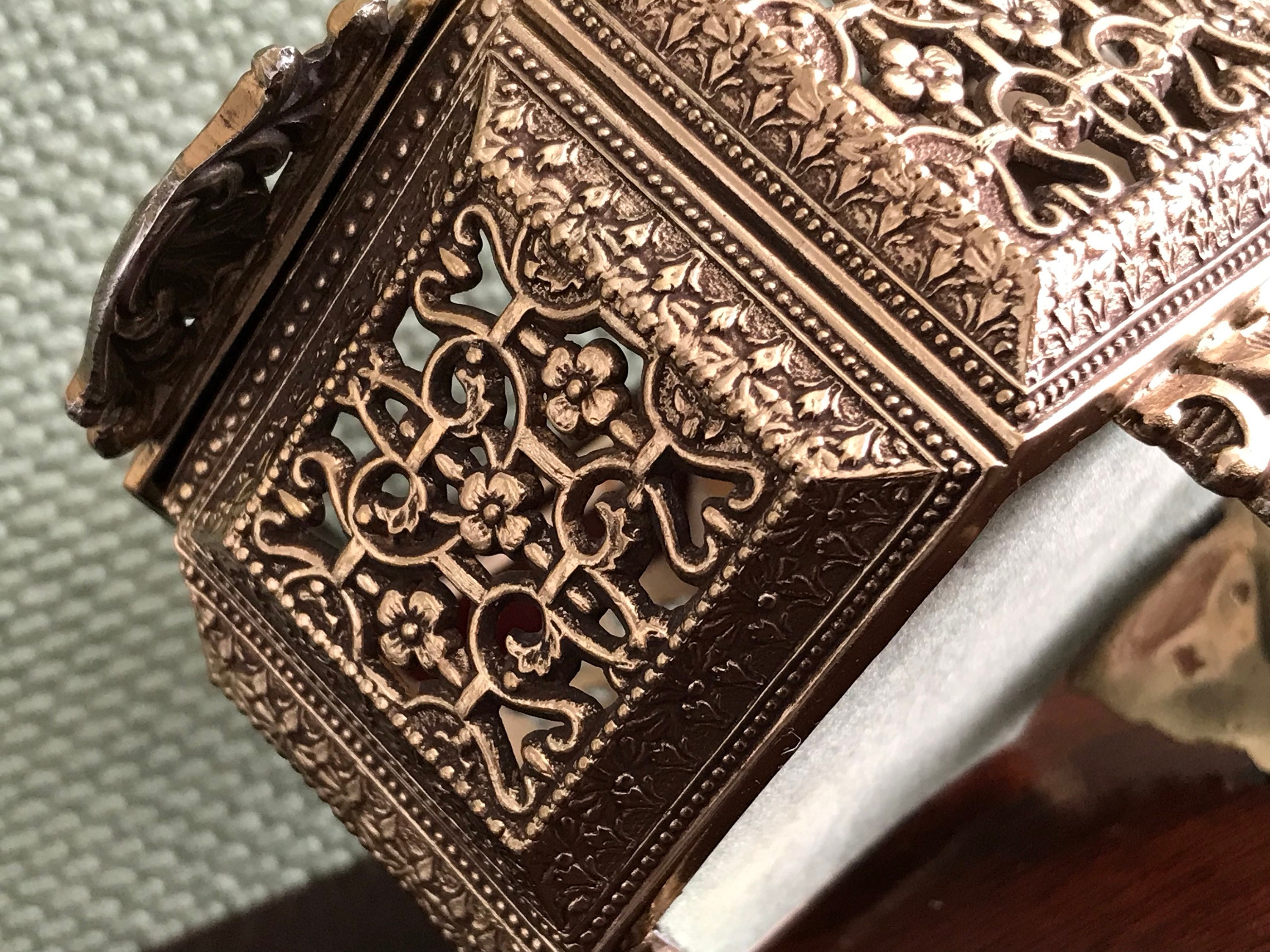 The floral design is in delicate gold plated filigree. A gorgeous accent to a dressing table. This round box has a glass viewing window. Inside of the box is a cushion of Romantic Ruby Red colored velvet.