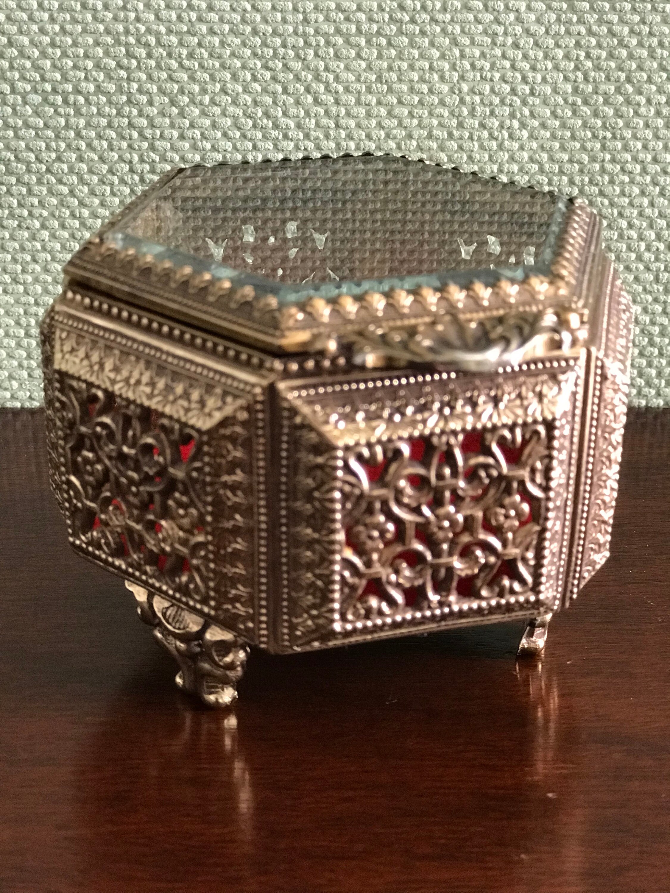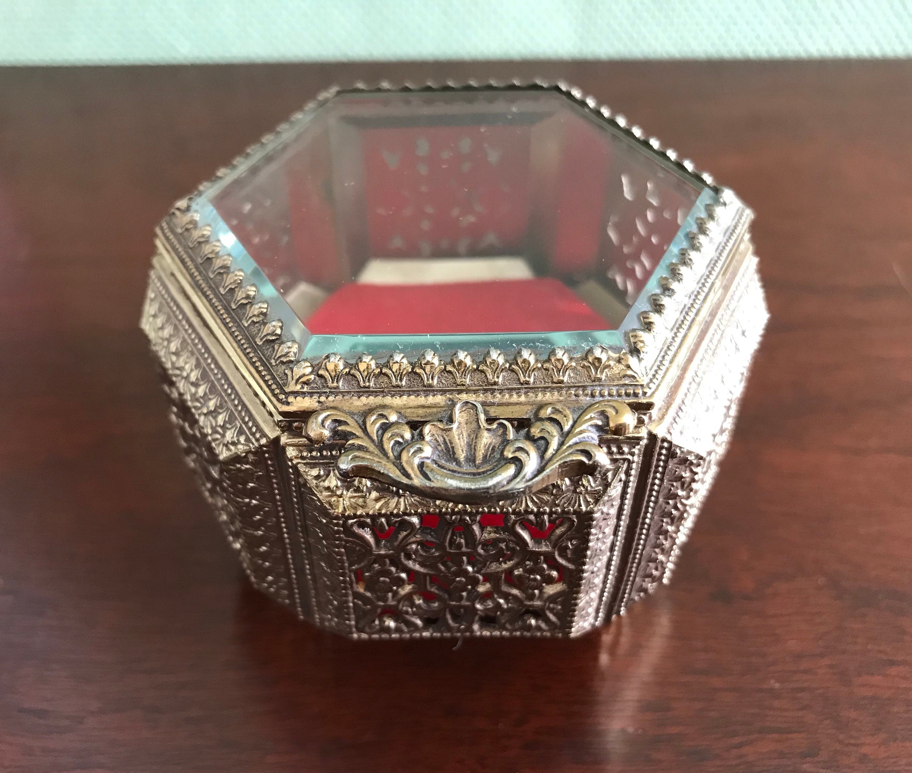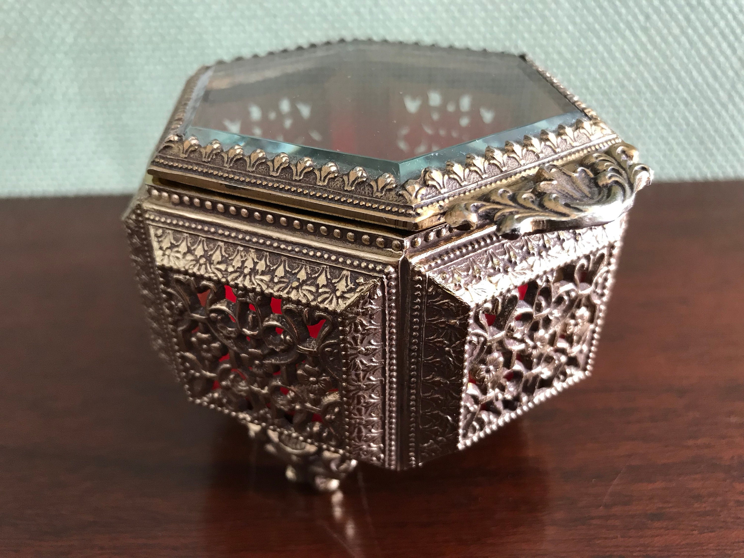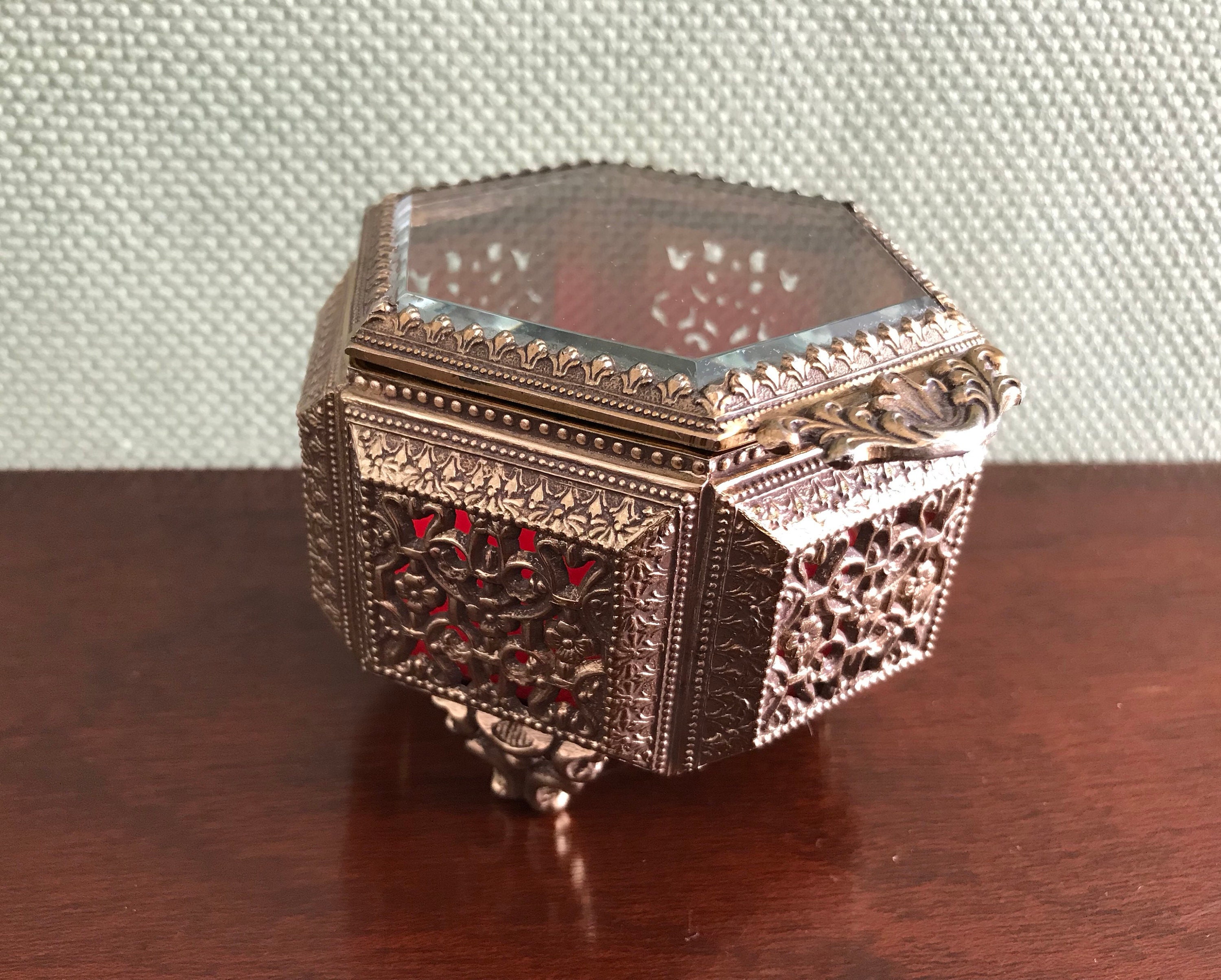 Beautiful vintage Gold Tone Footed Jewelry Casket or trinket box with Beveled glass lid. In a unique Octagon shape with six extending filigreed panels. The lid sits firmly on top.