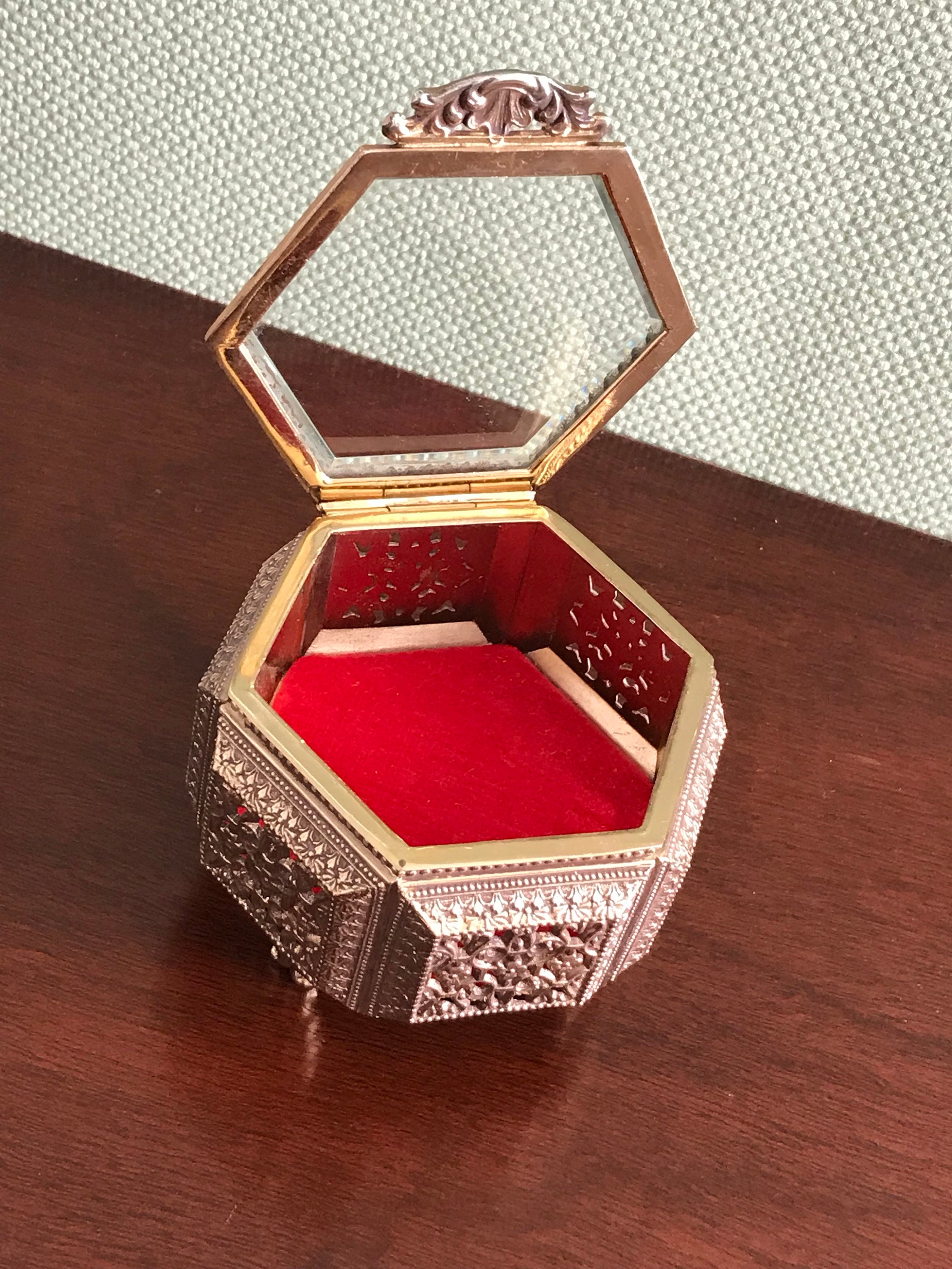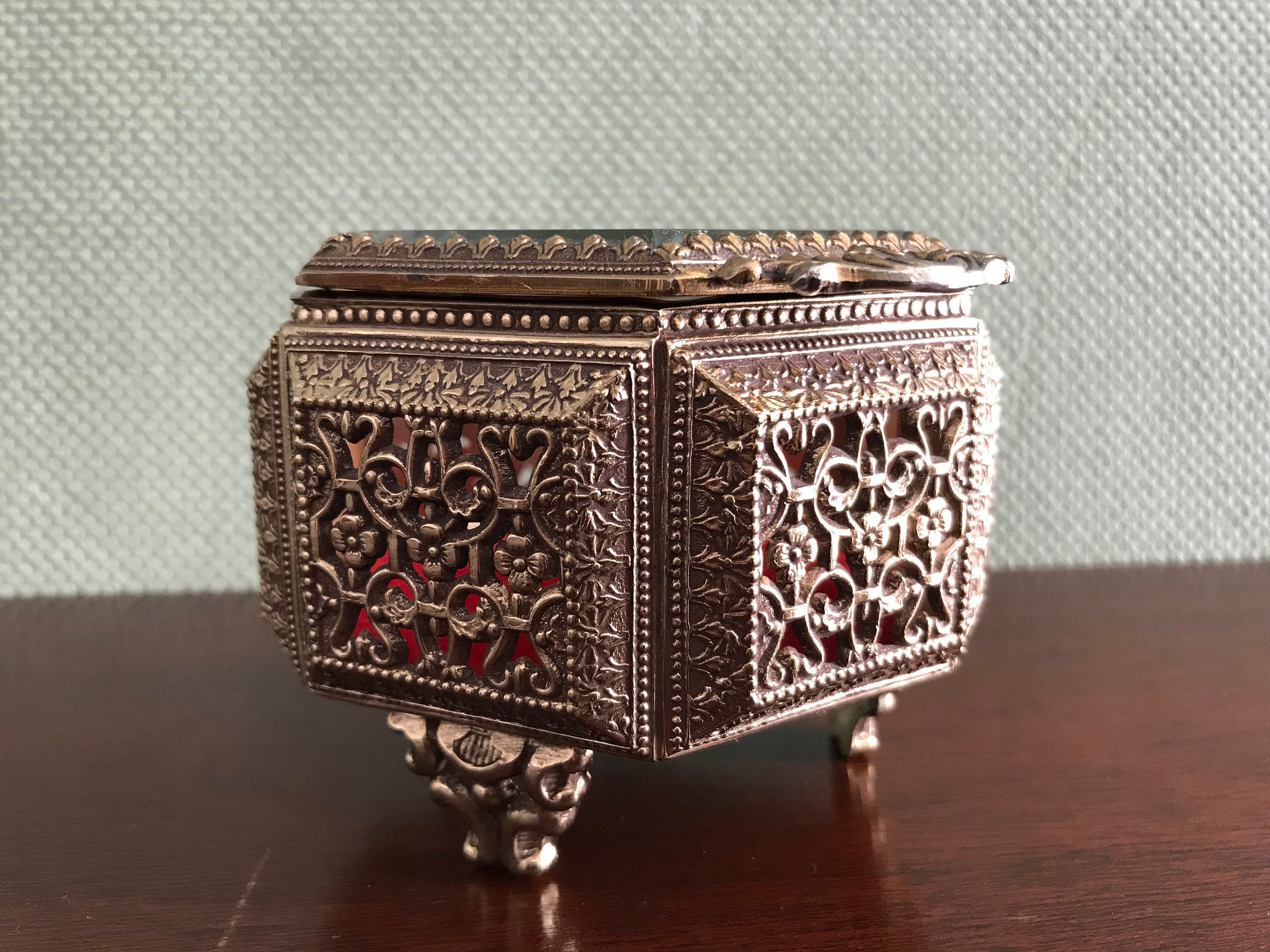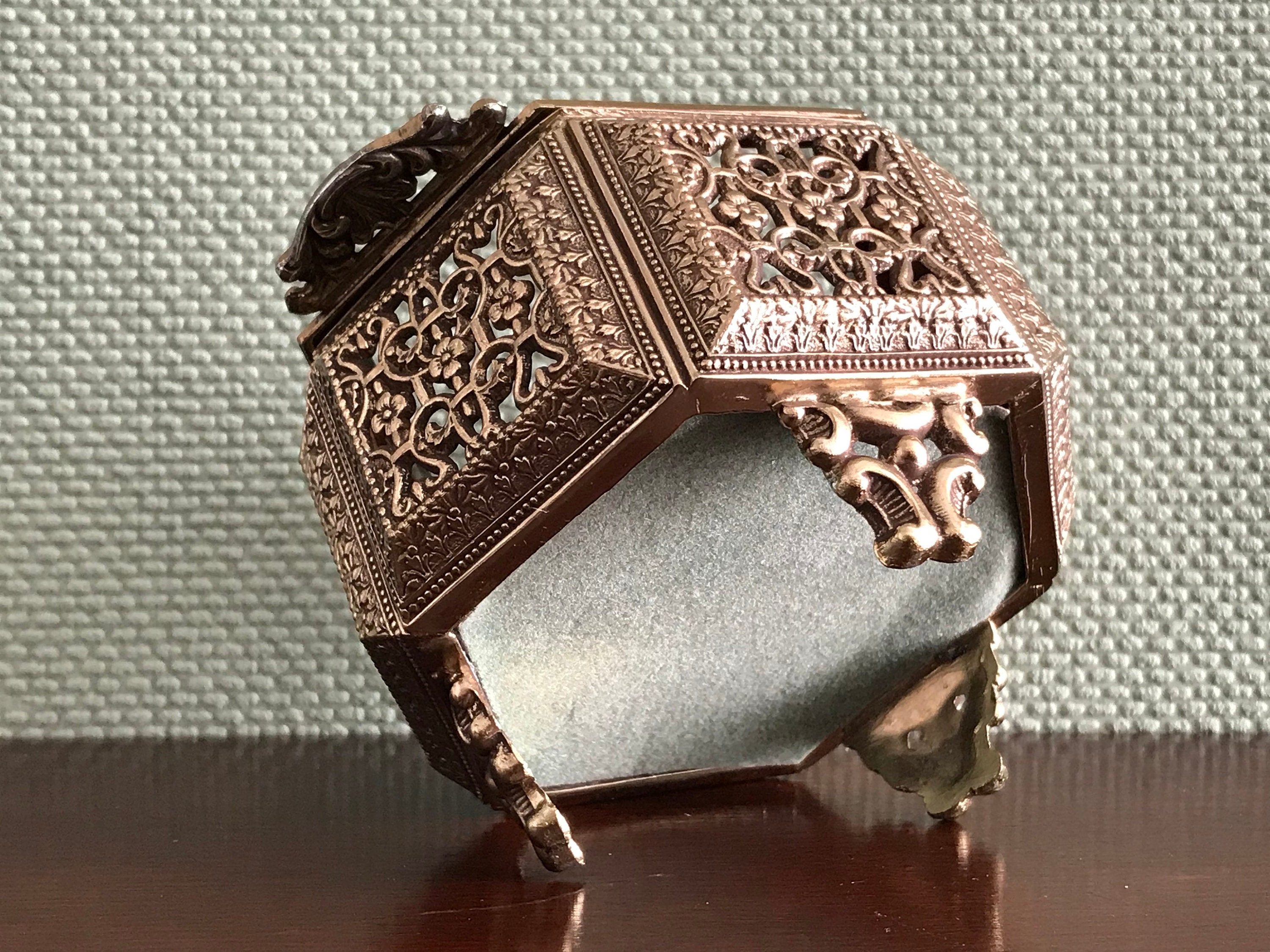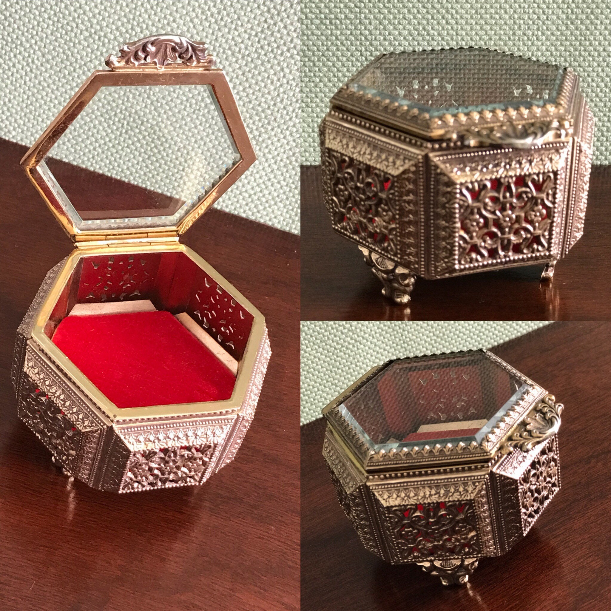 Beautiful vintage Gold Tone Footed Jewelry Casket or trinket box with Beveled glass lid. In a unique Octagon shape with six extending filigreed panels. The lid sits firmly on top.