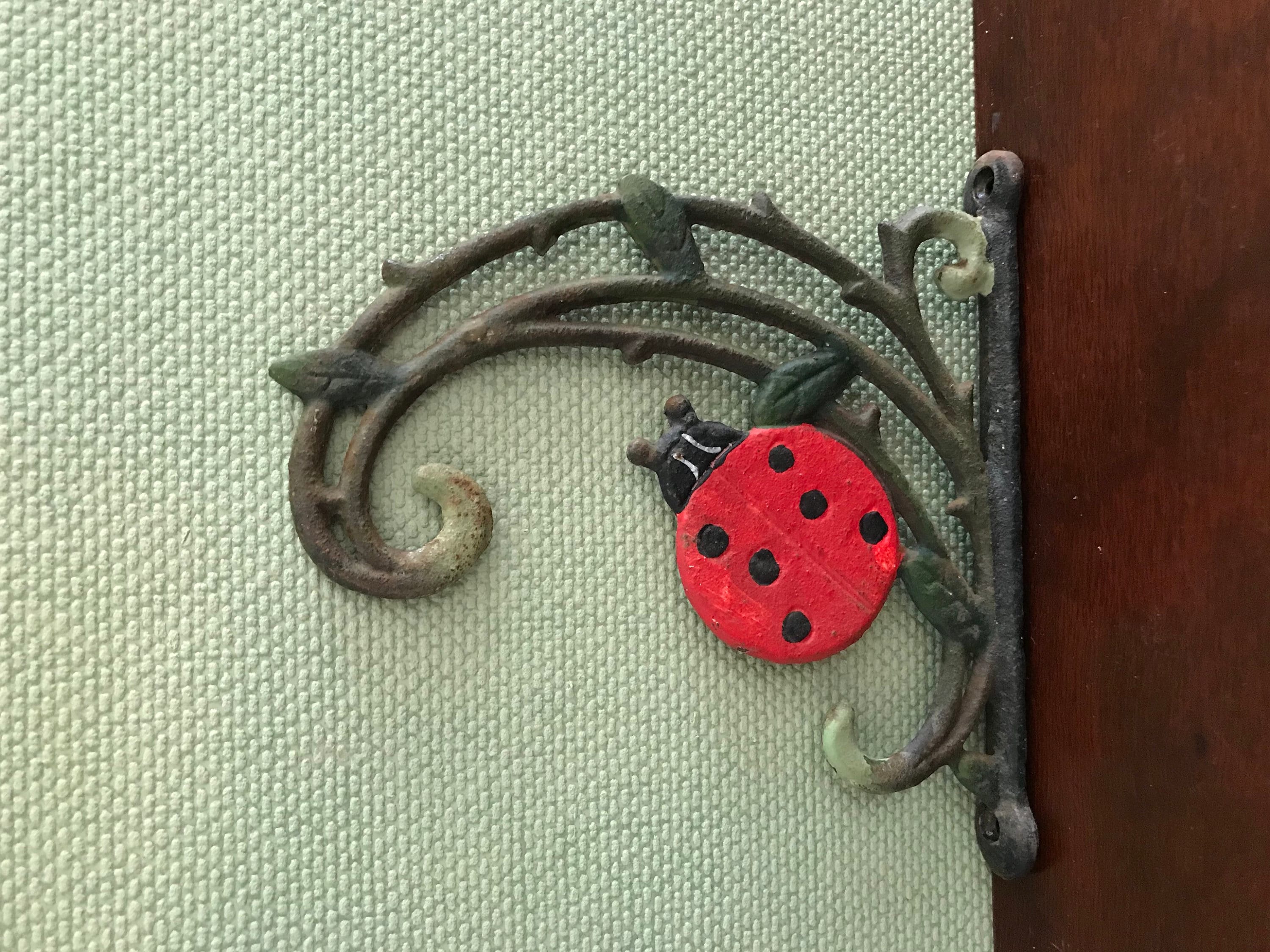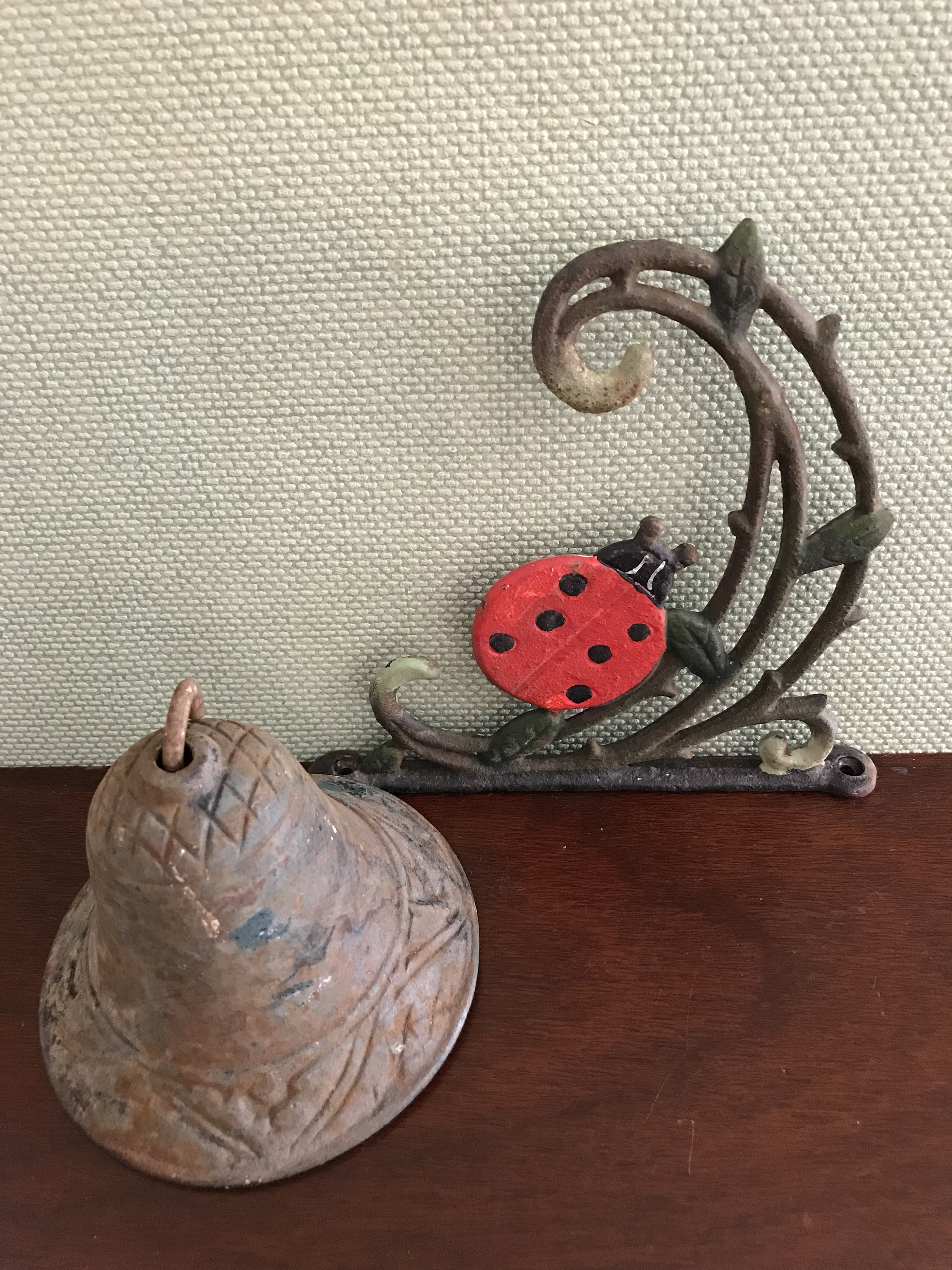 Vintage Decorative Gate or Door Bell made in Rustic cast iron. It has a Wonderful Patina full of history. This Charming Bell is designed with lovely scroll work, and a cute Red Ladybug. It is rusty and rustic it would be sweet on a garden shed door or outdoor cabin.