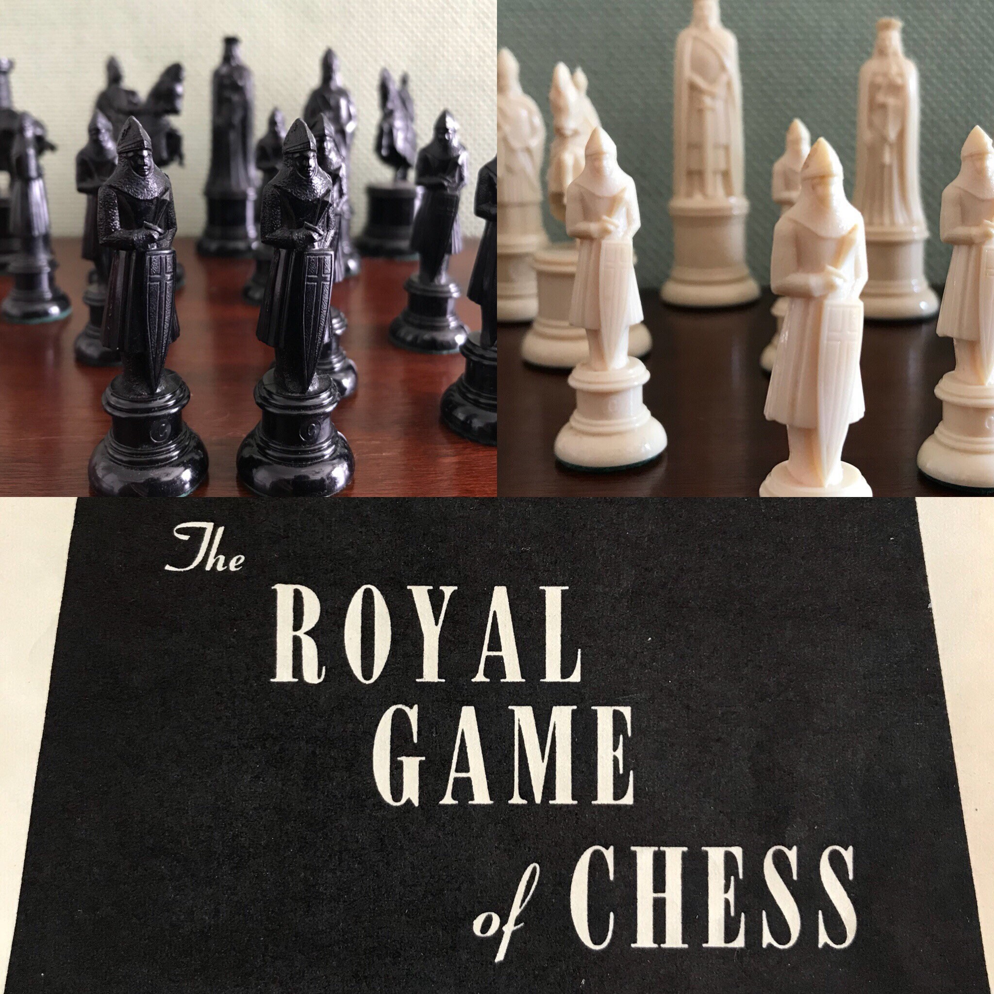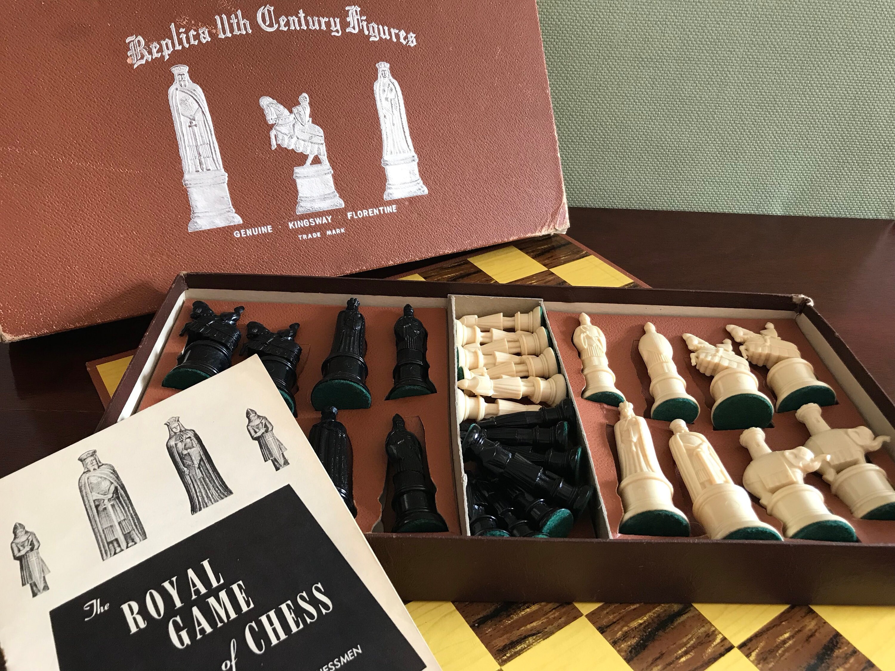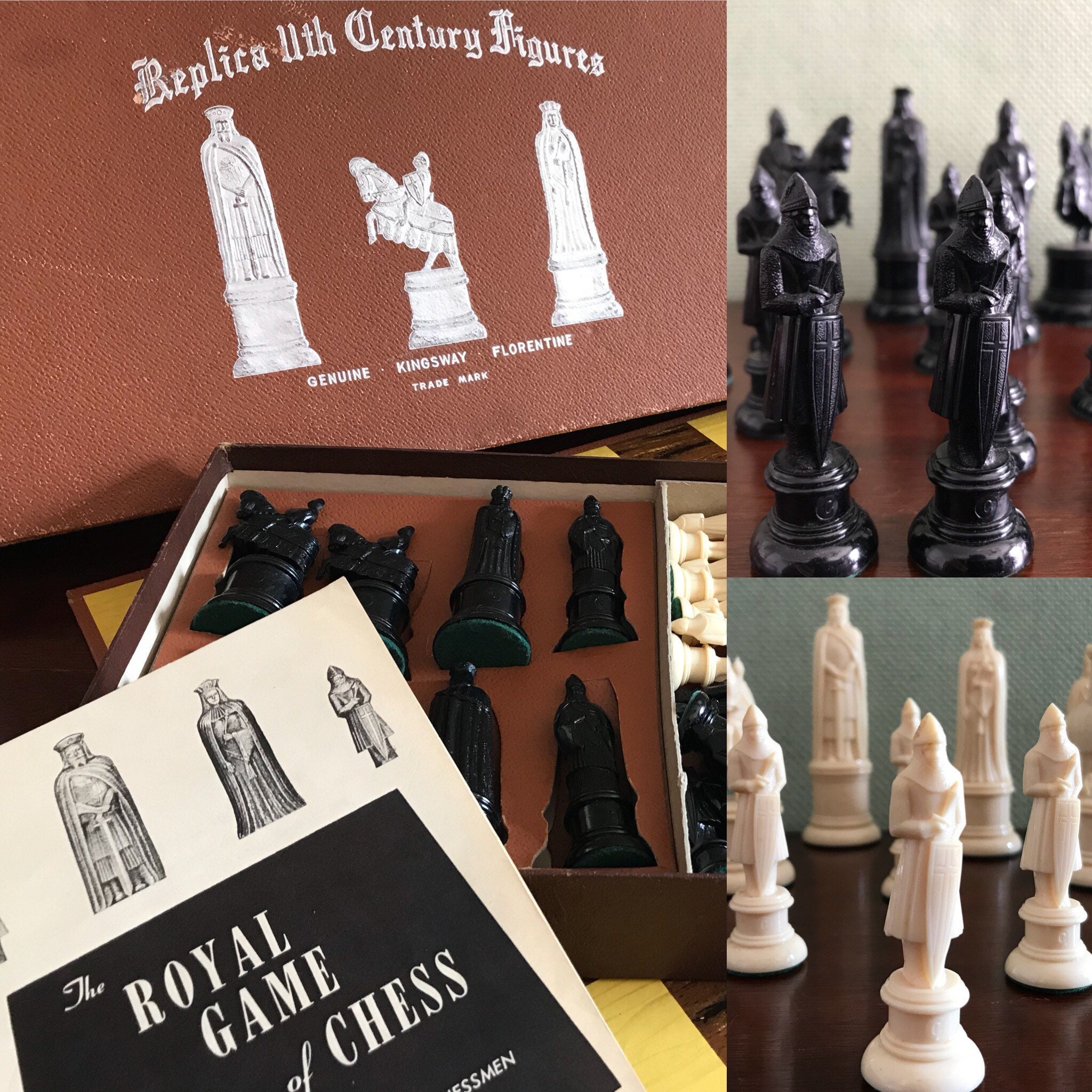 Collector's 11th Century replica Figurines Chess Set. This is a fabulous chess set by Mid Century Game company Kingsway circa 1940-50s. These beautiful chess pieces were molded in high quality plastic.