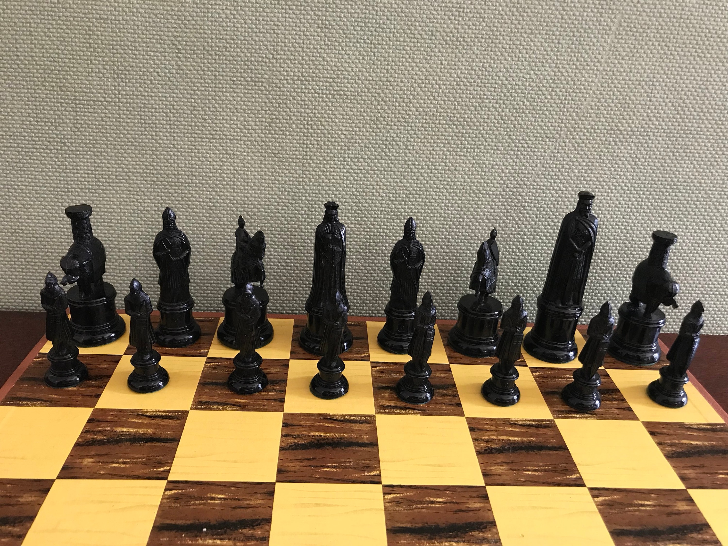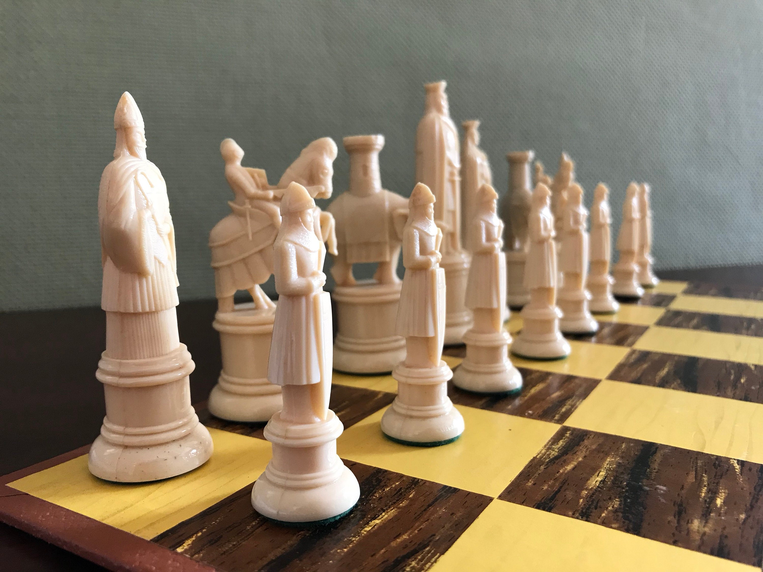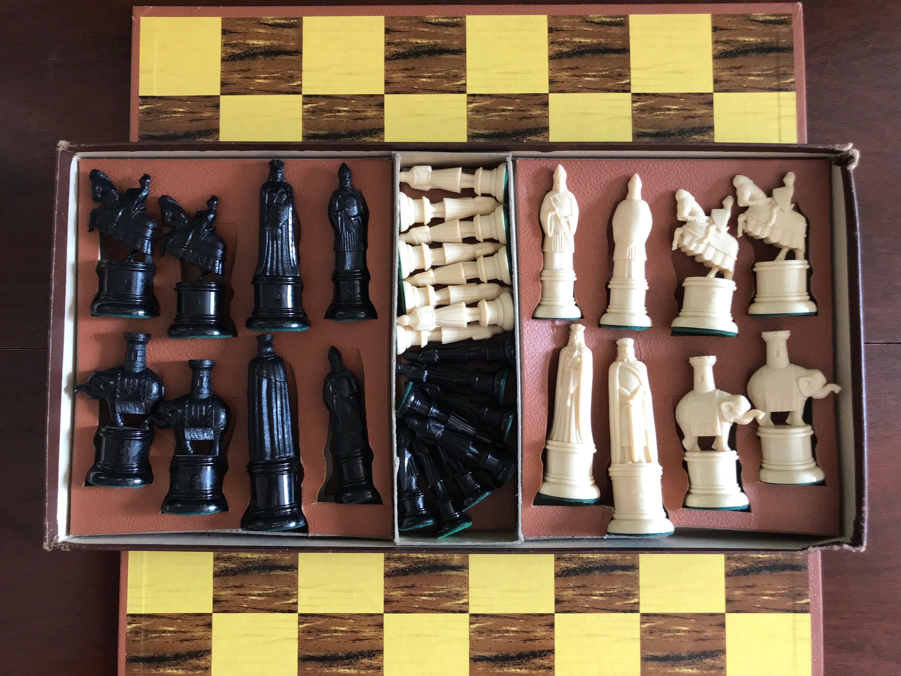 Collector's 11th Century replica Figurines Chess Set. This is a fabulous chess set by Mid Century Game company Kingsway circa 1940-50s. These beautiful chess pieces were molded in high quality plastic.