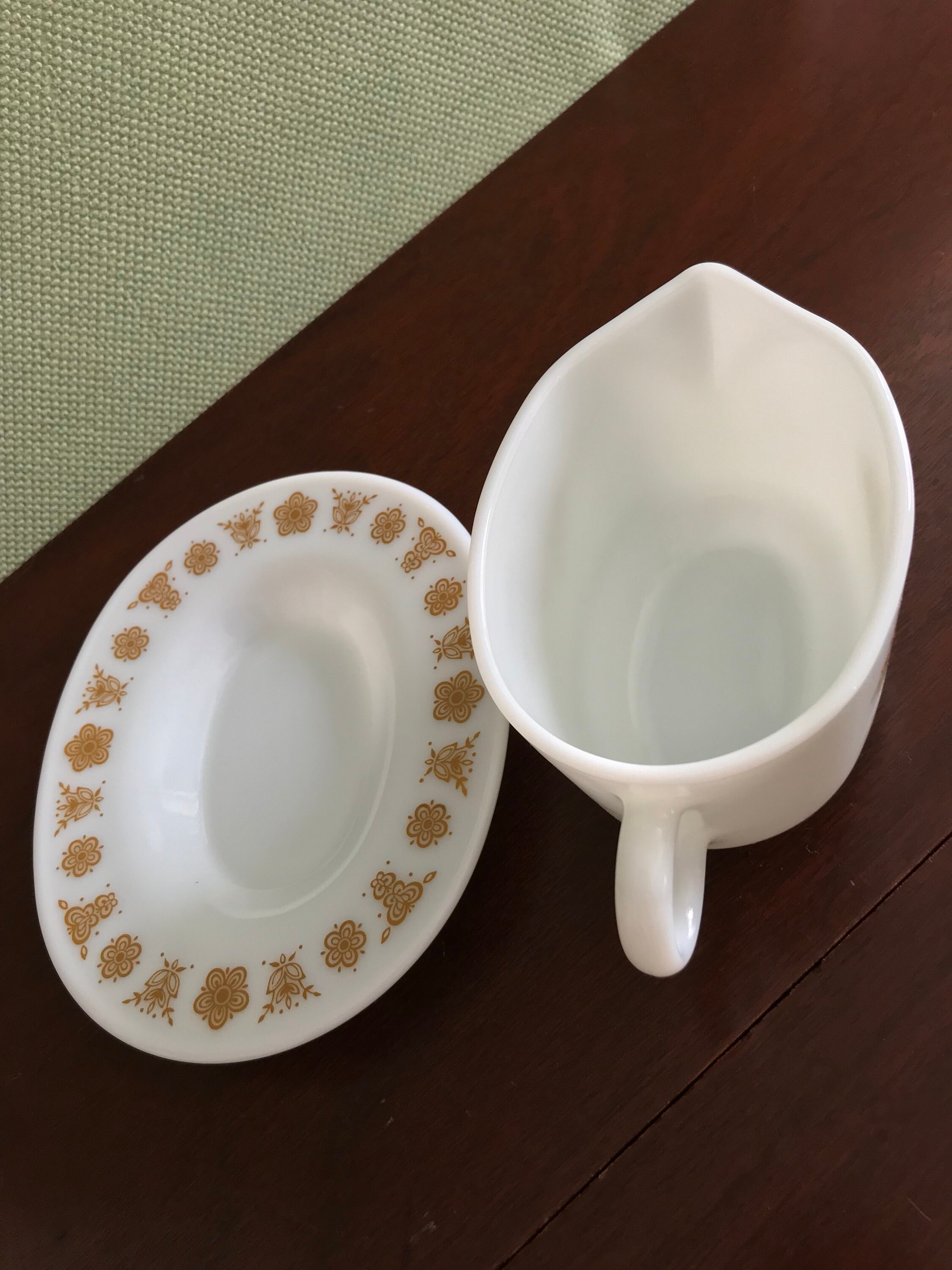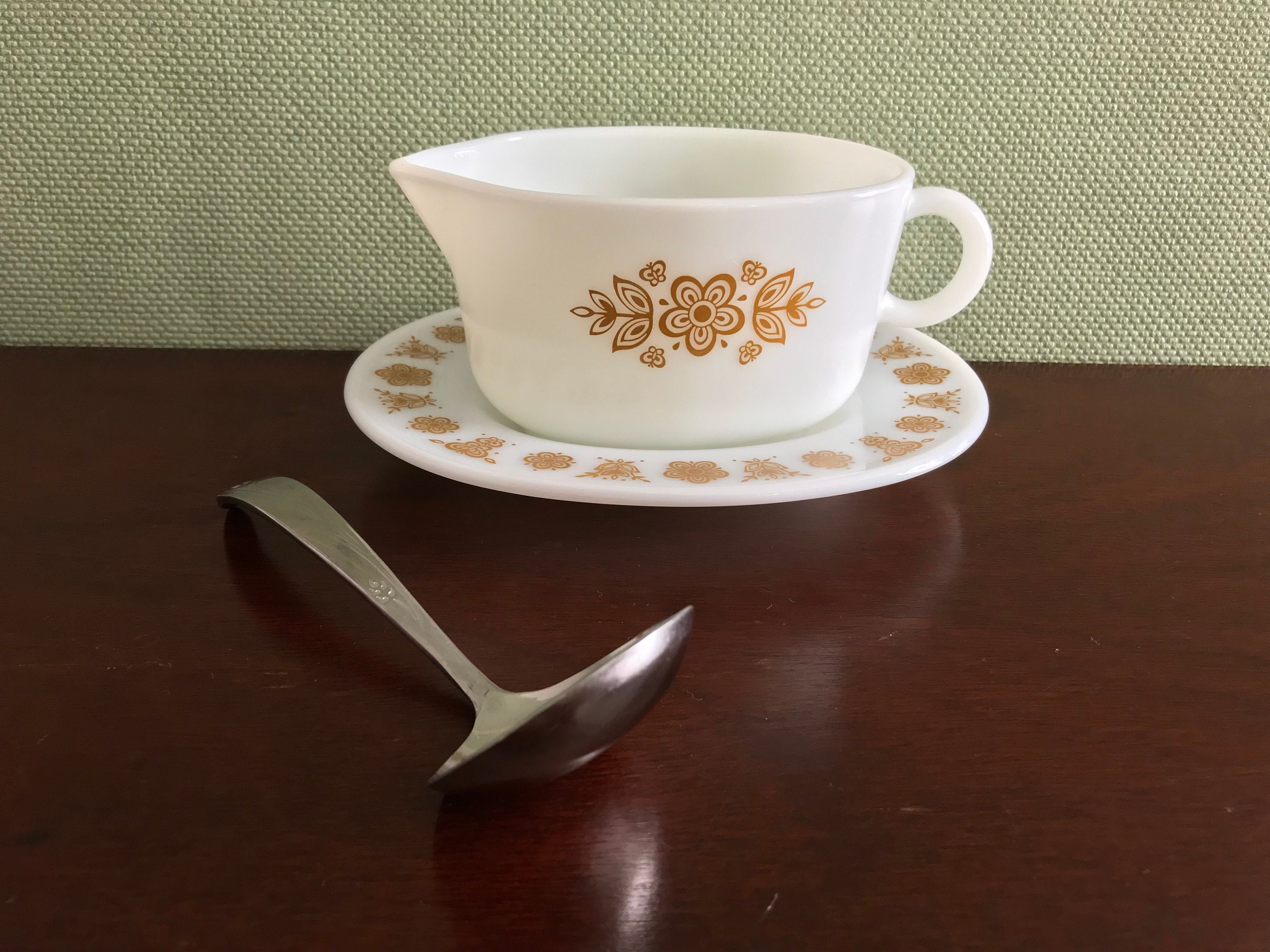 Vintage Pyrex Butterfly Gold Gravy Boat. Butterfly gold is a long time favorite Pyrex pattern that matches the Corelle coordinate dishes of the same pattern. Classic Pyrex