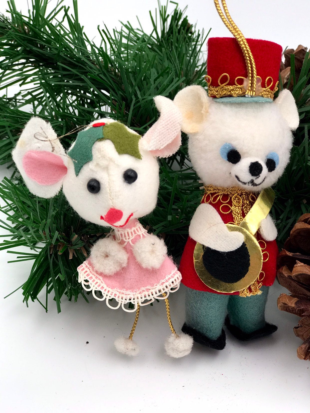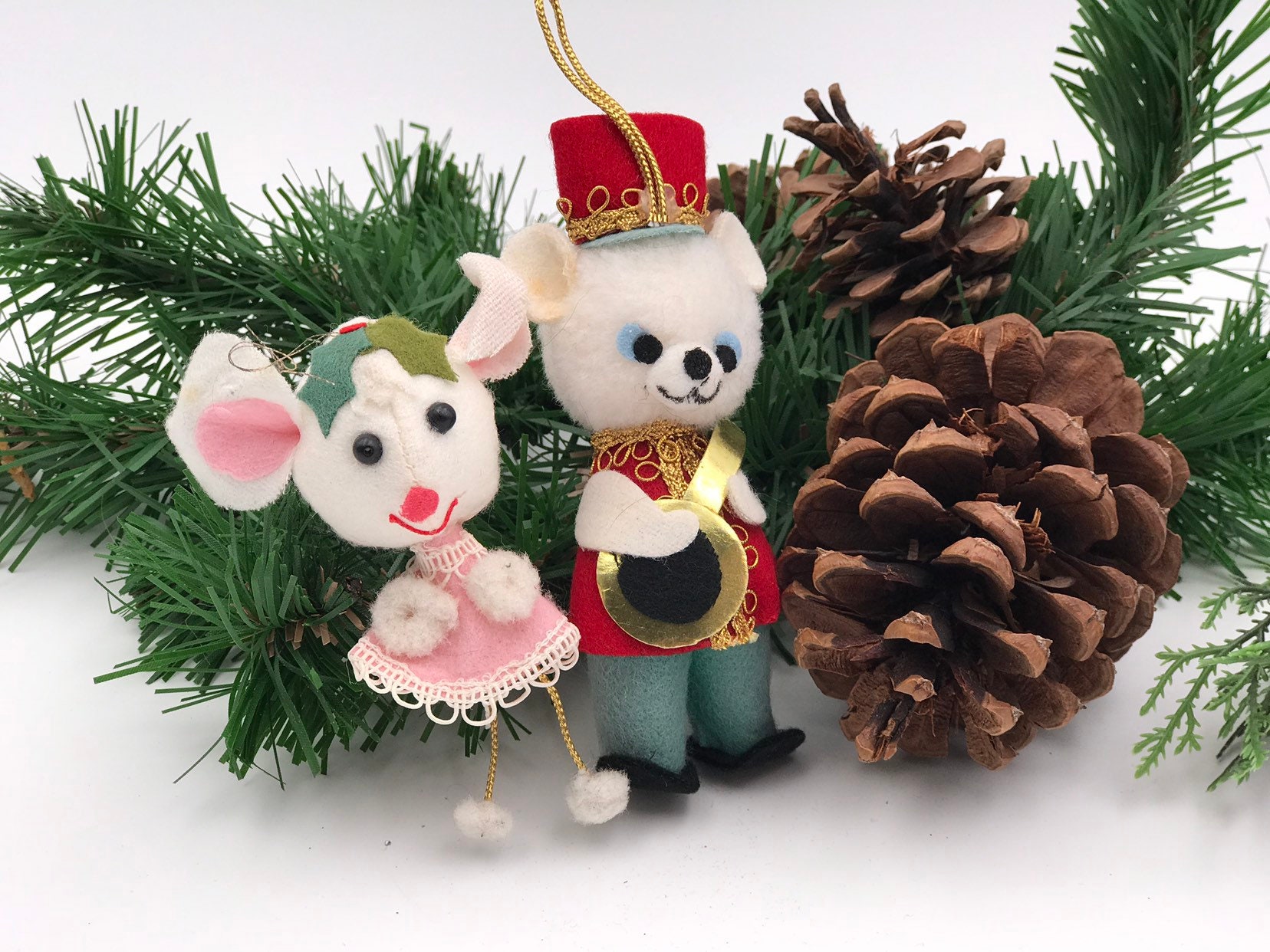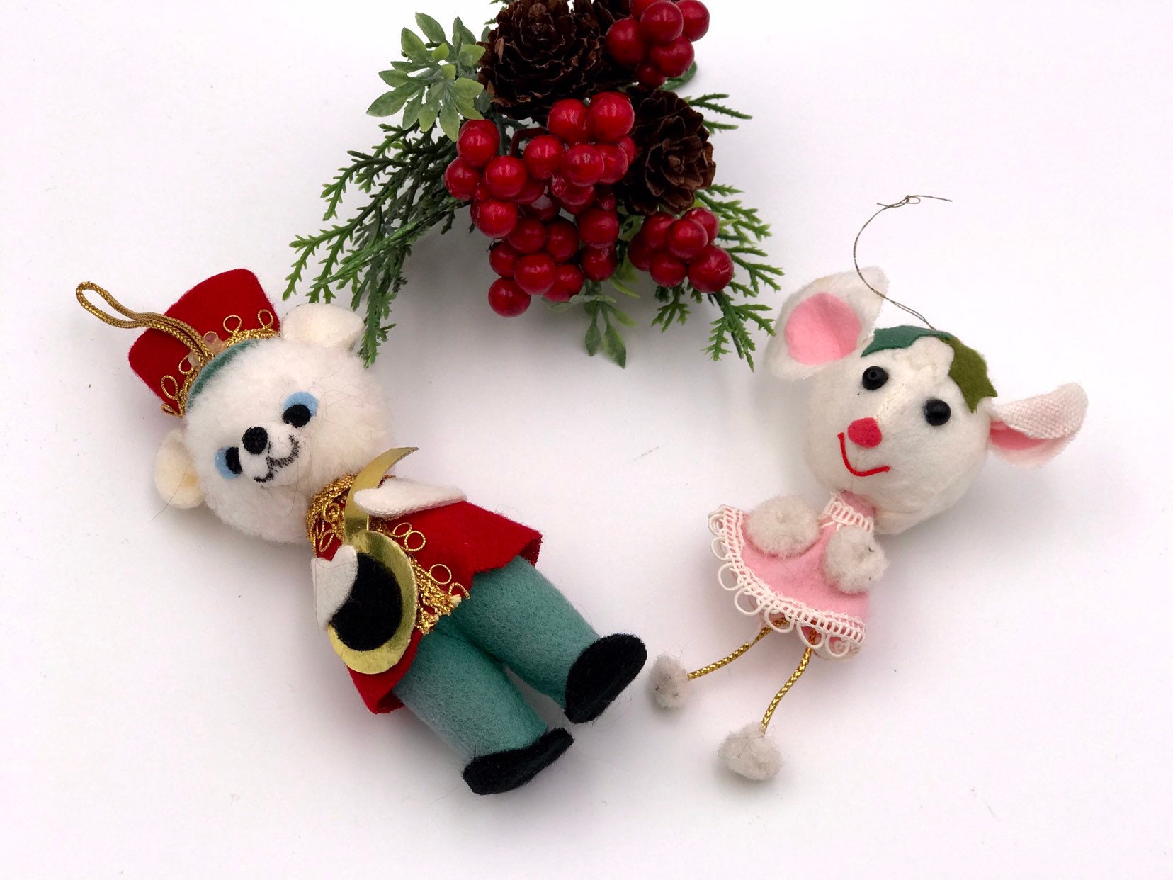 This is a sweet set of vintage Christmas ornaments from the 1960s. They have are handmade of Felt. They are dressed in cute little fabric clothes.
