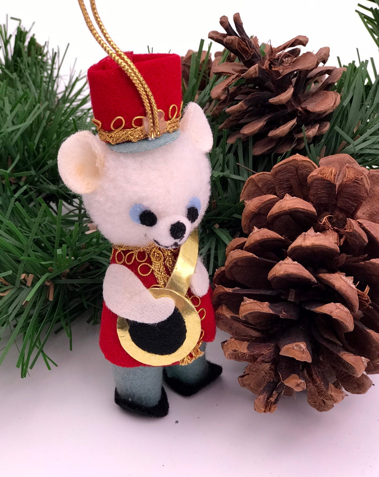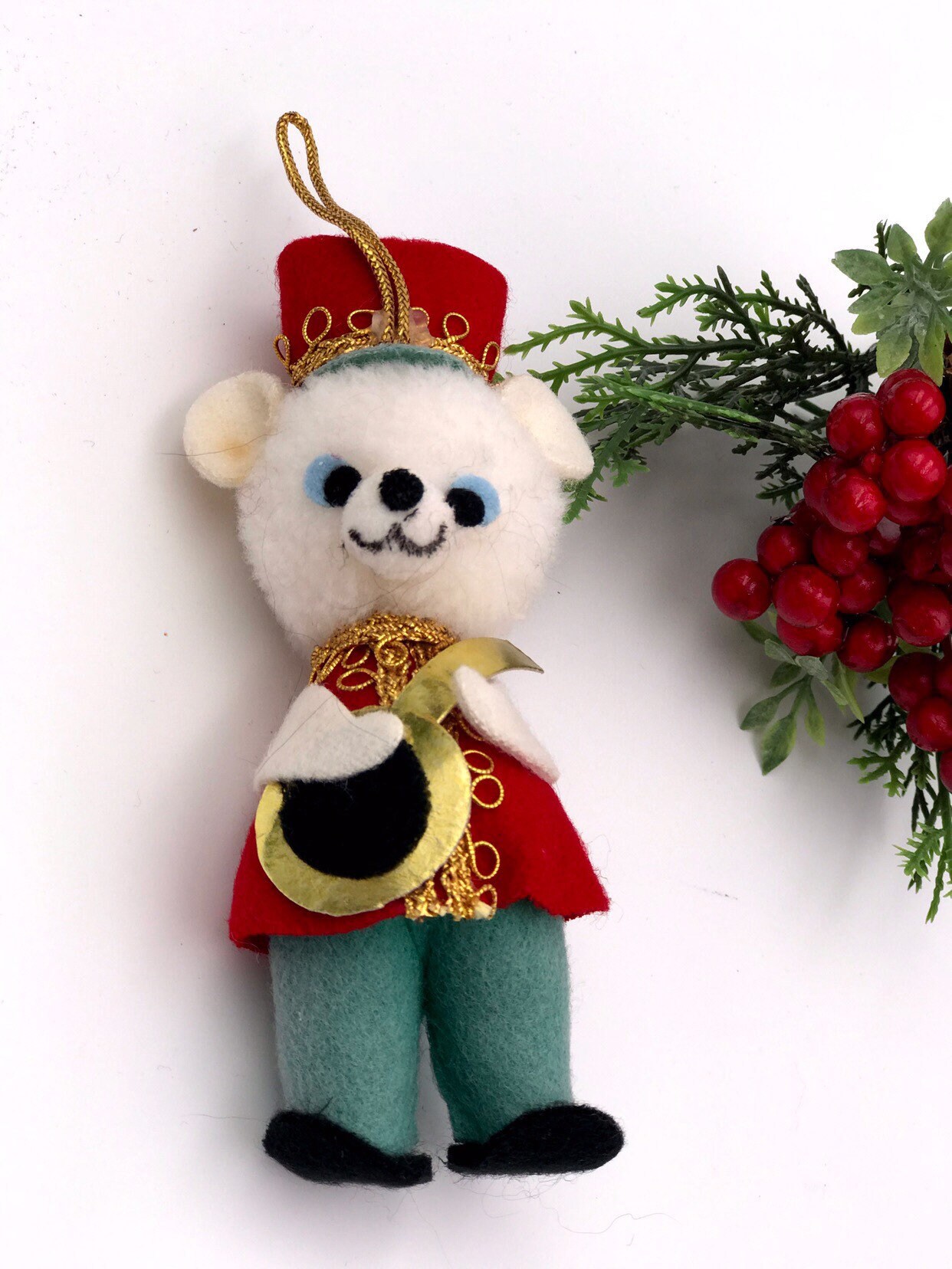 The boy bear is wearing a red coat over over green pants. He has a red hat on his head decorated with gold trim. He is playing a paper banjo.