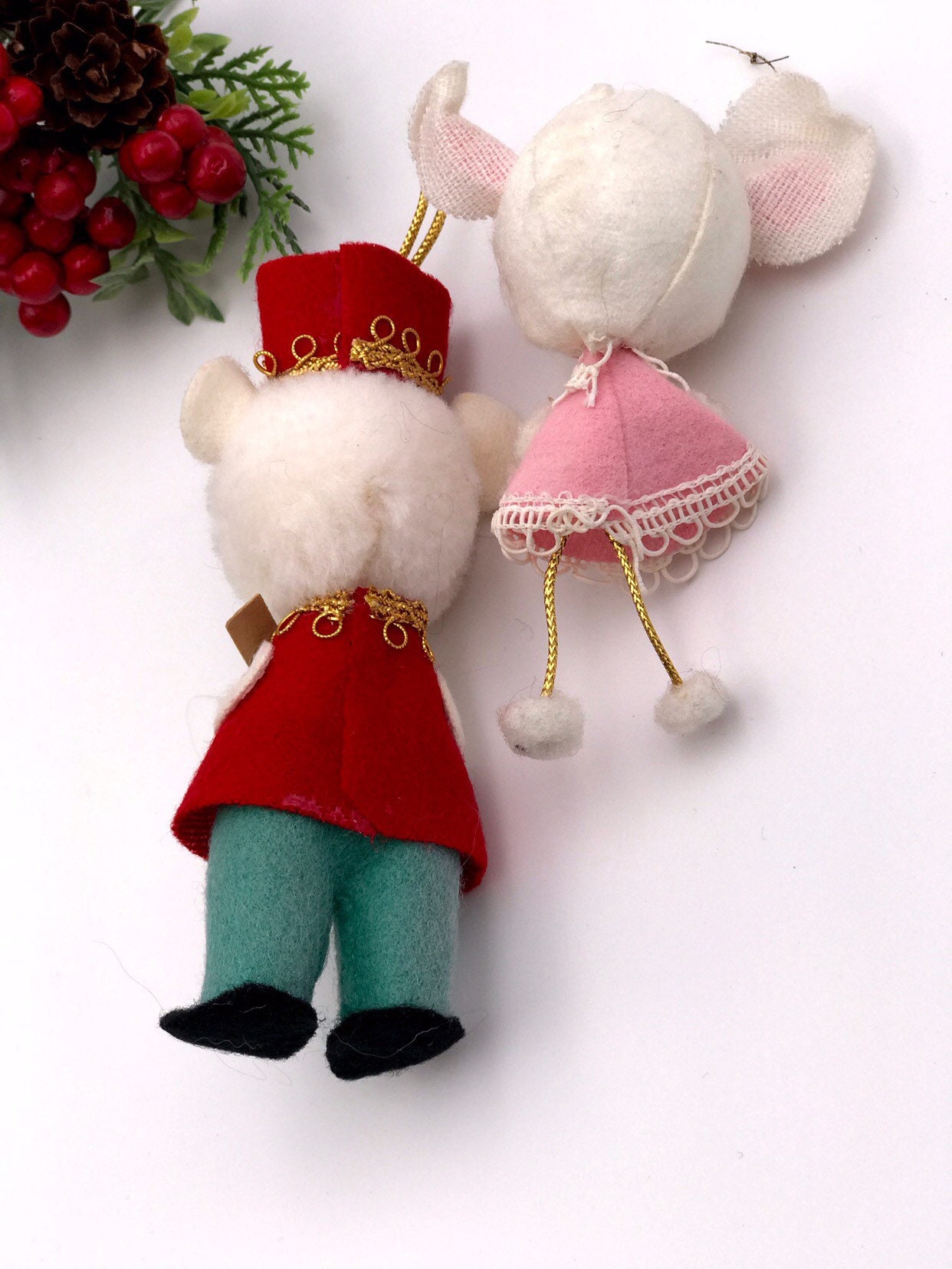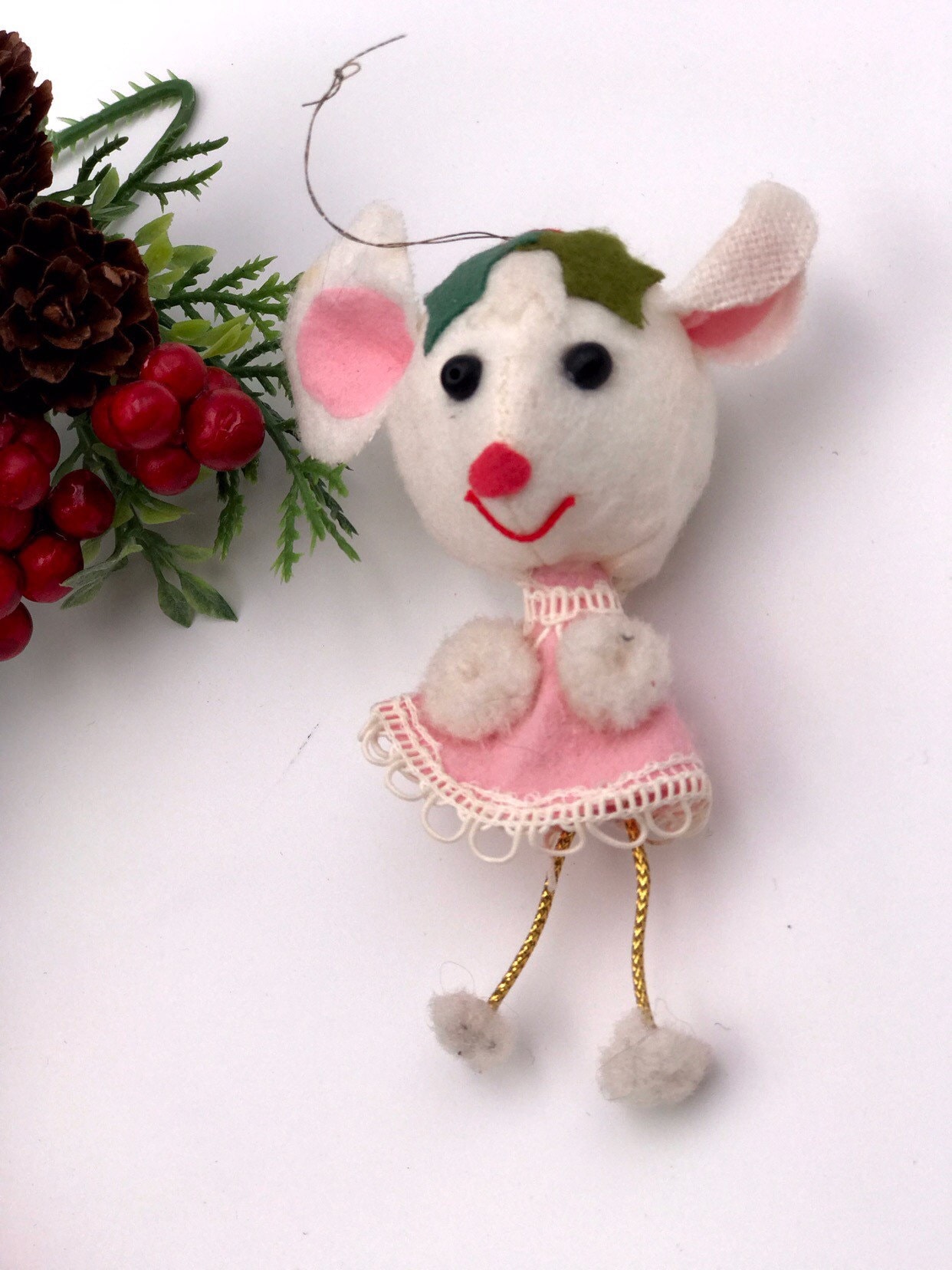 The girl mouse is wearing a pink felt dress trimmed with lace. She has a sprig of holly on her head.