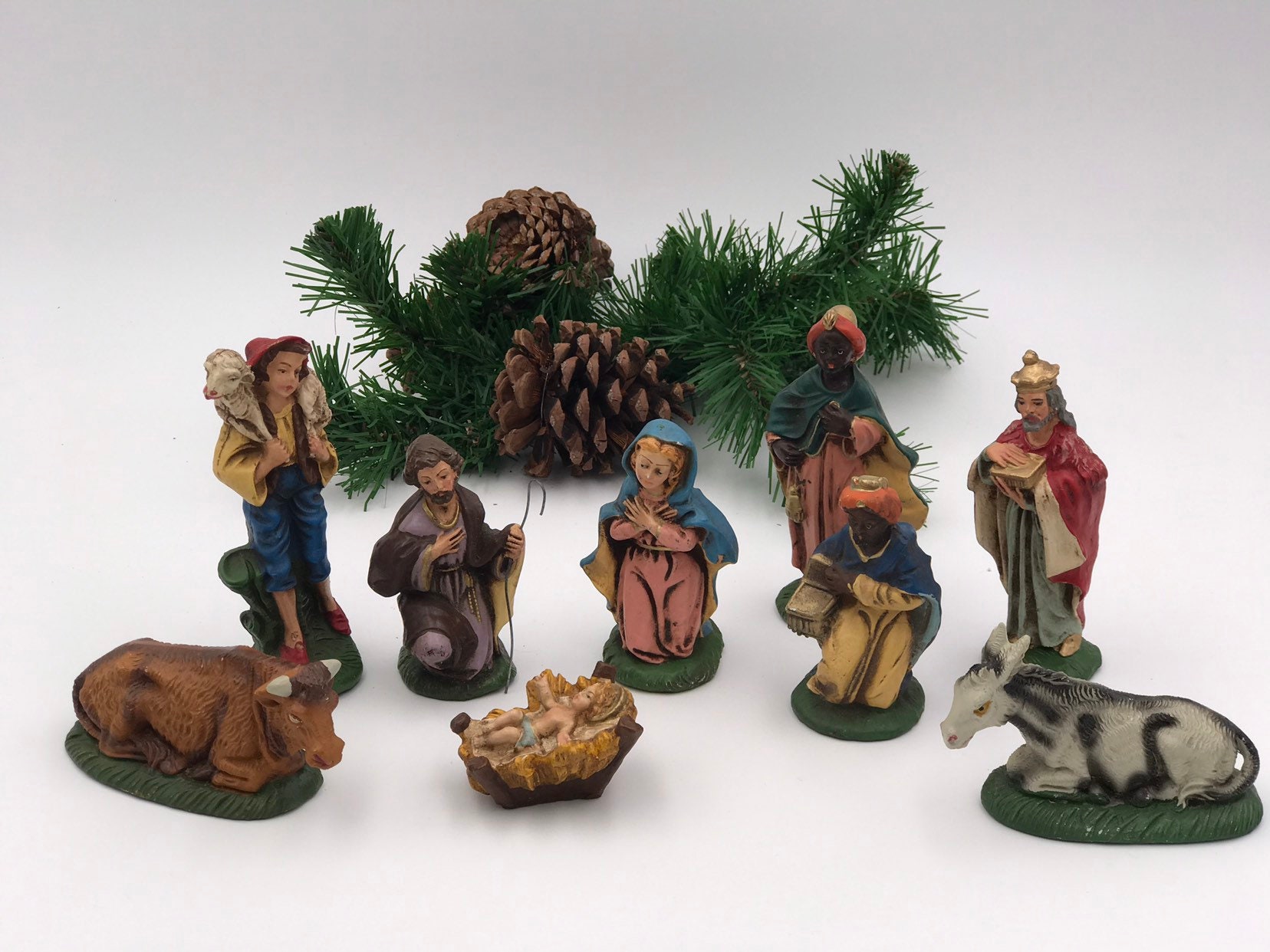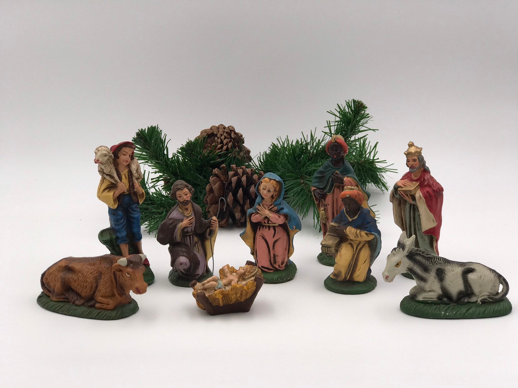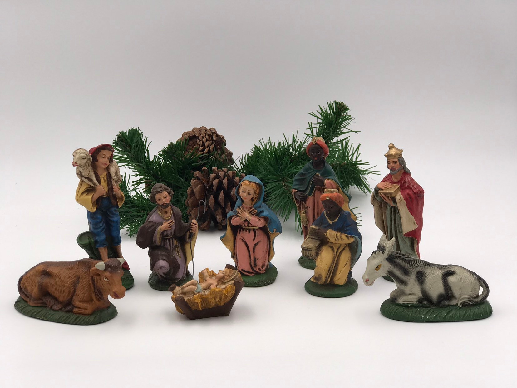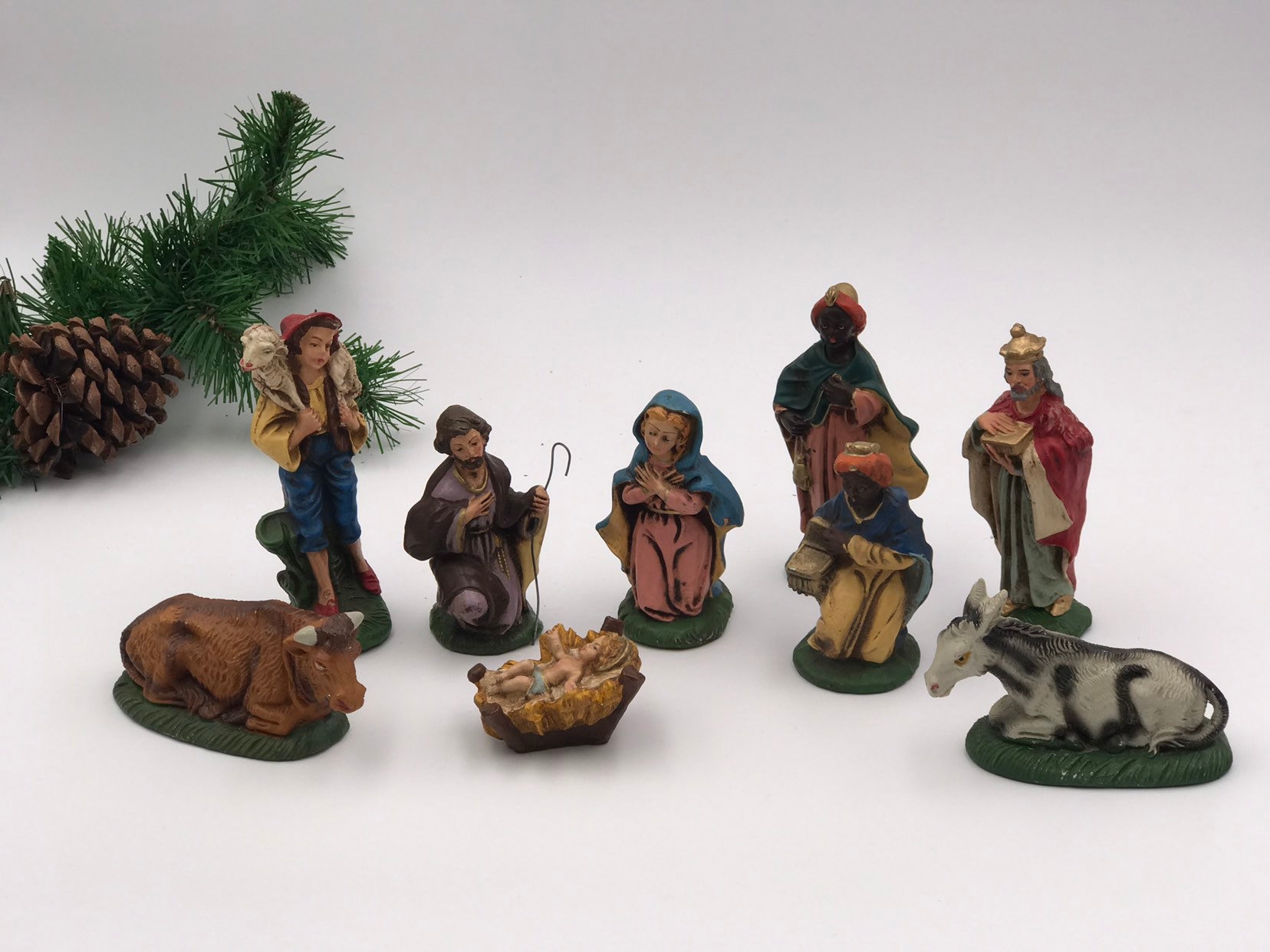 This is a lovely Estate Sale Mid Century Nativity set. This set has lovely detailed figurines made of A plaster material like Chalkware, and hand painted in a rainbow of colors. The lovely Figurine have a nice mellow Patina. They are unglazed, typical of Chalkware figurines. I purchased these from an estate sale. They are most likely a 1950-1960s Set.