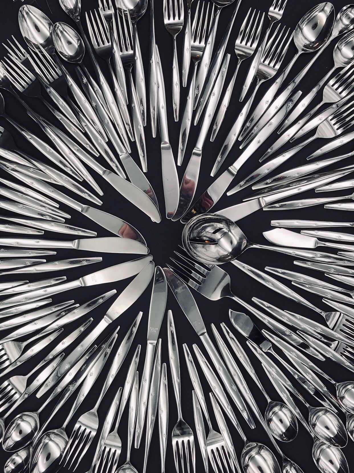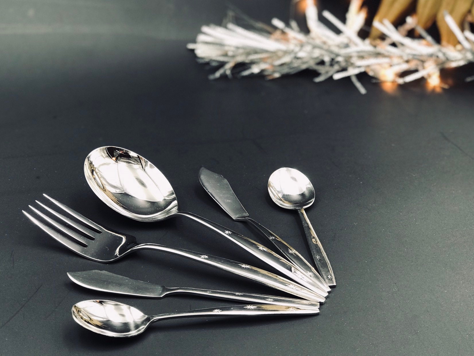 This is a Rare Vintage Atomic Three Star 104 piece Flatware Set By Eldan. This Set of Flatware is such an Iconic depiction of the Atomic Era of Vintage Flatware. Three starbursts give the flatware its celestial look. The stars are on each handle. The end of the handle comes to a blunt tapered end. Gorgeous!