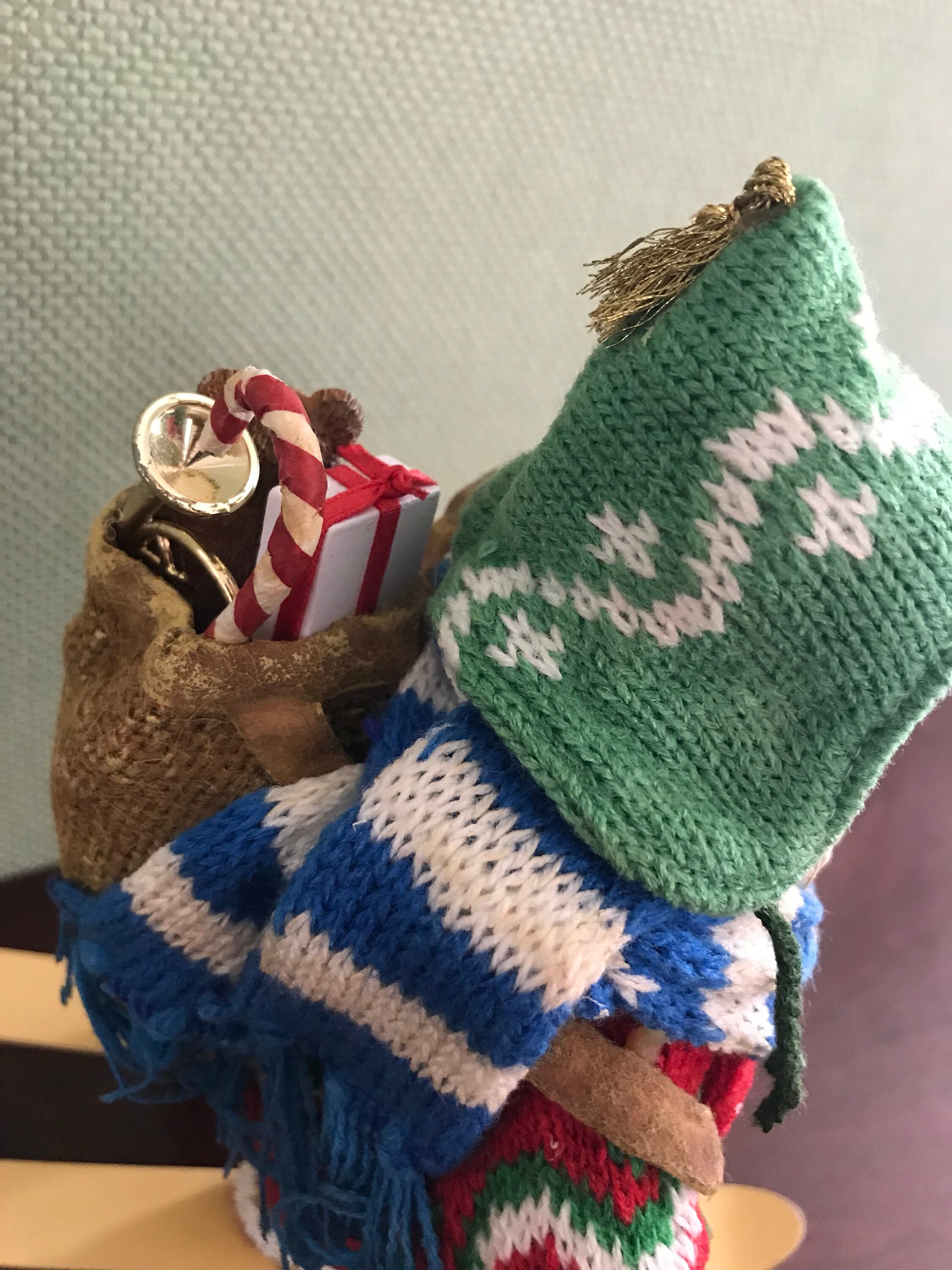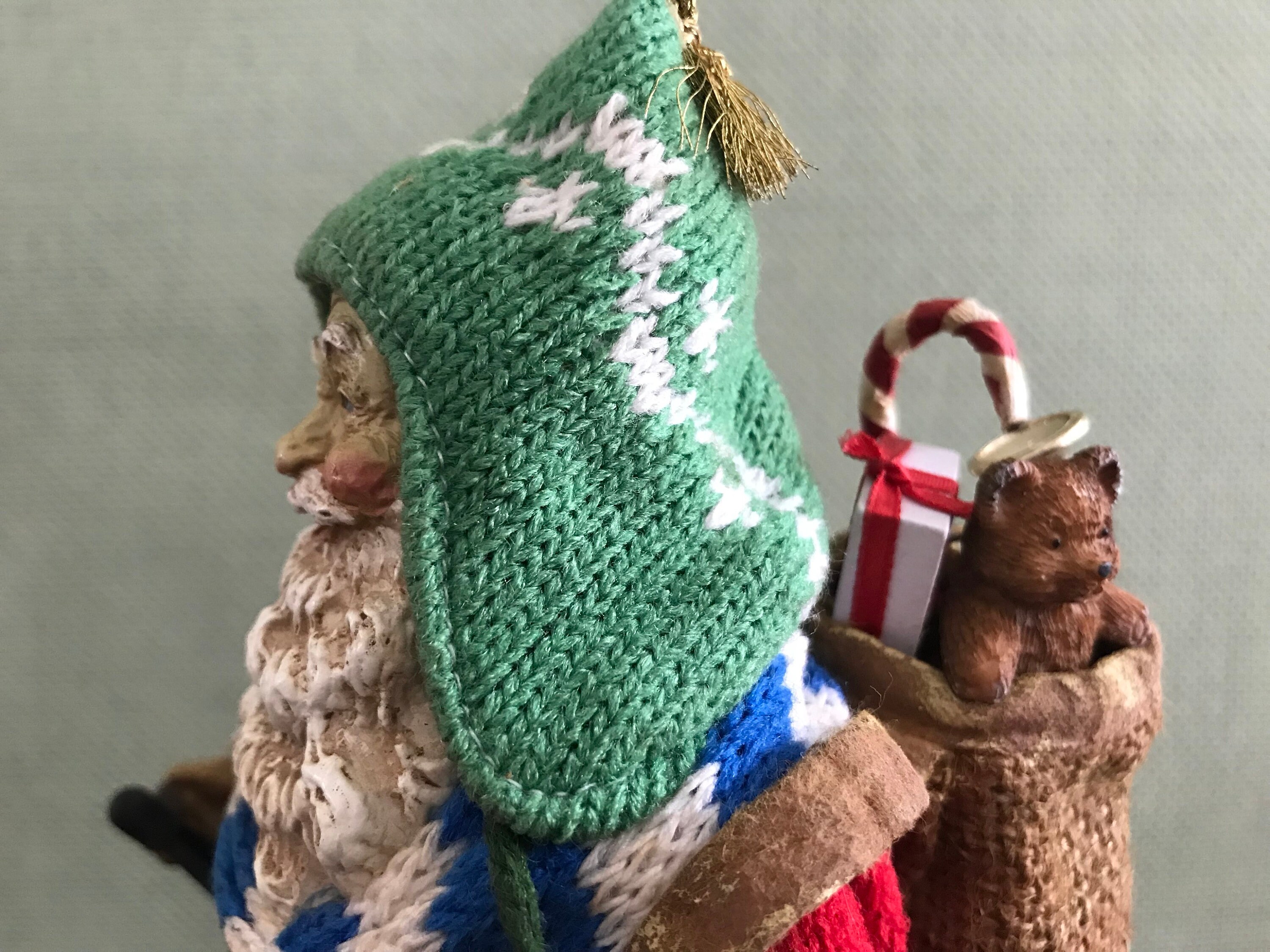 There is a Jolly look on his beaded face, and a sack of toys slung on his back.