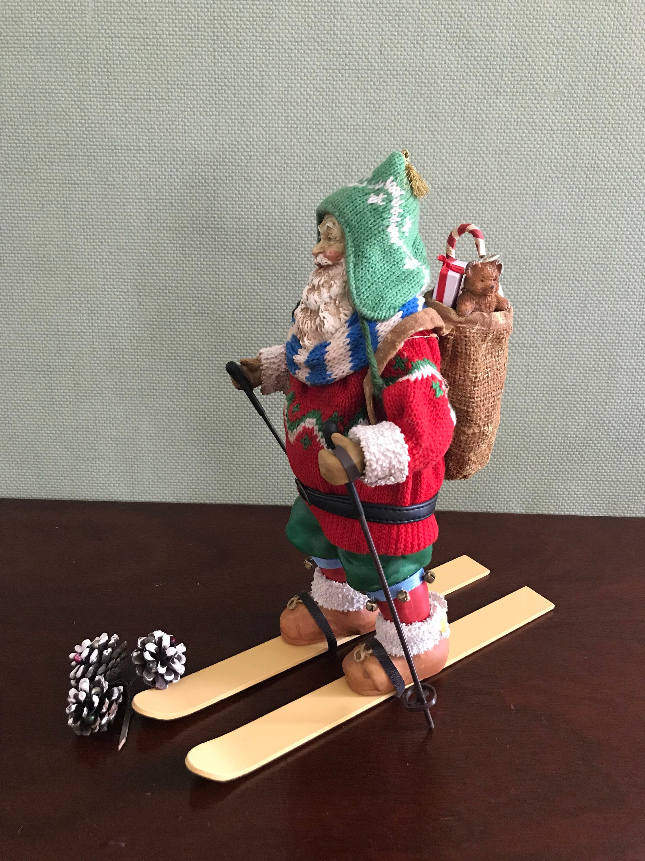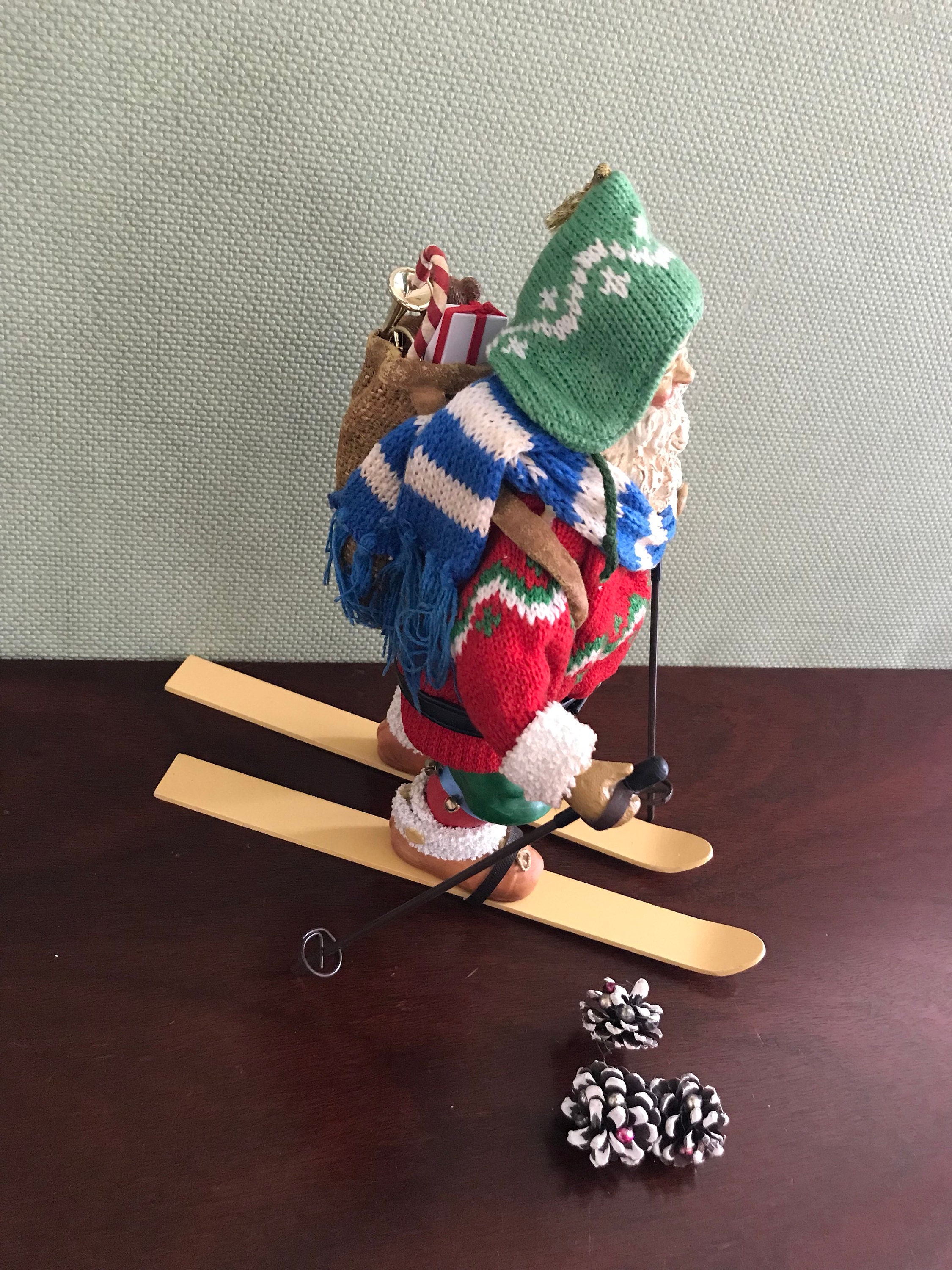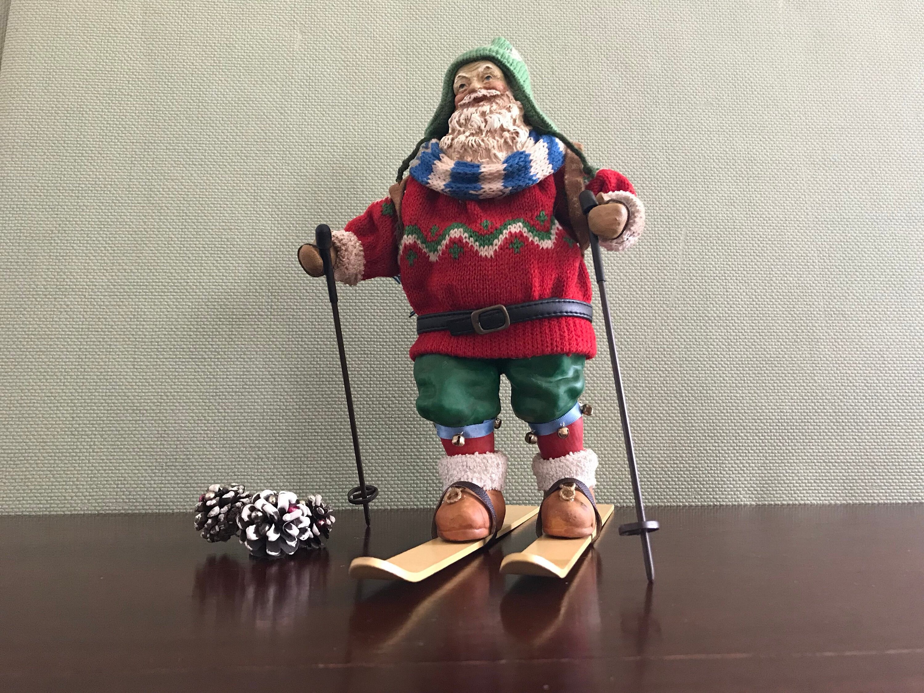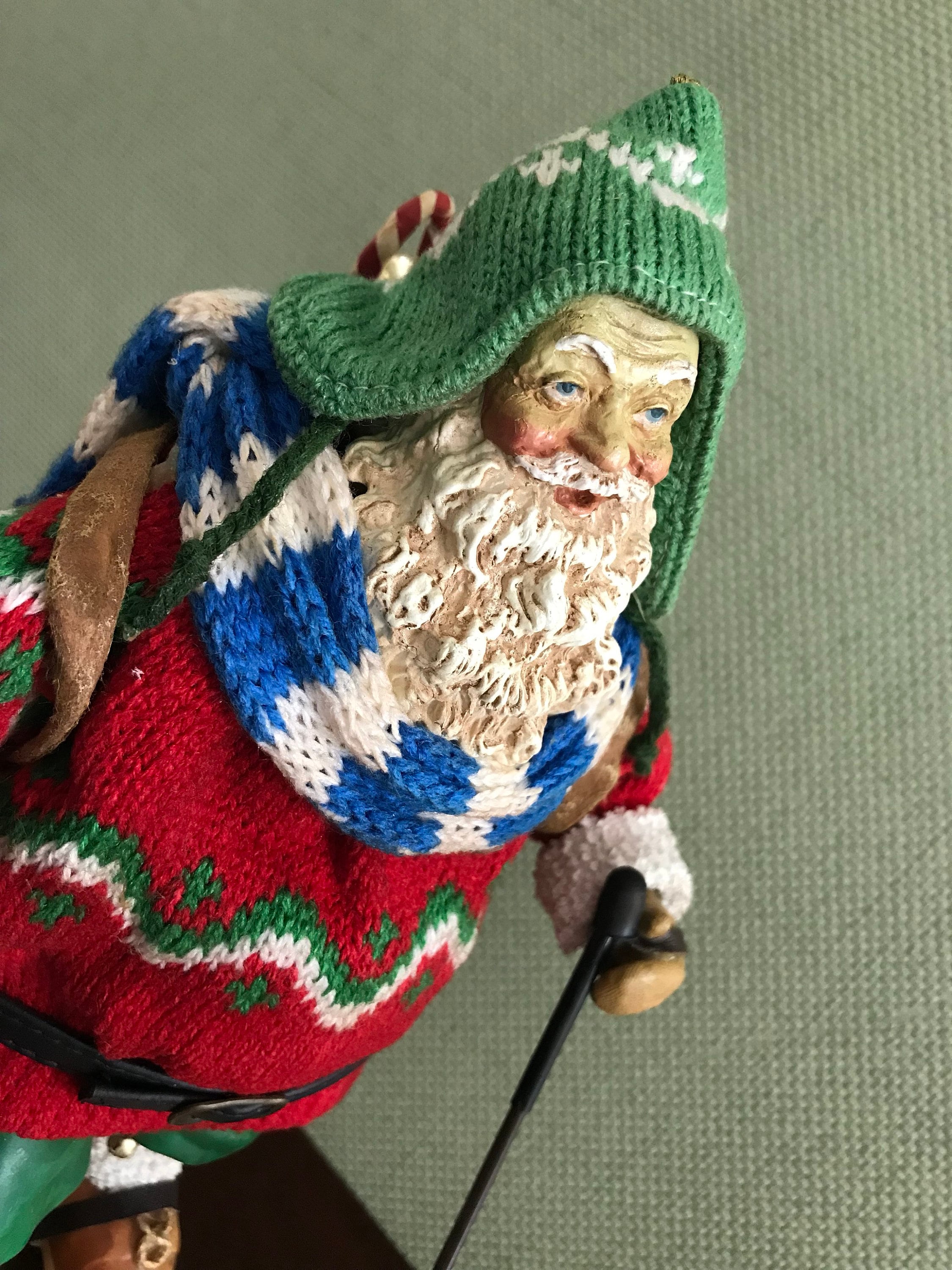 This is a Vintage Clothtique Skiing Santa Claus made by the Possible Dream Company In 1989. This very collectible Santa has fabulous detail from his knit sweater, stocking hat, and sweater to his wooden skis and poles.