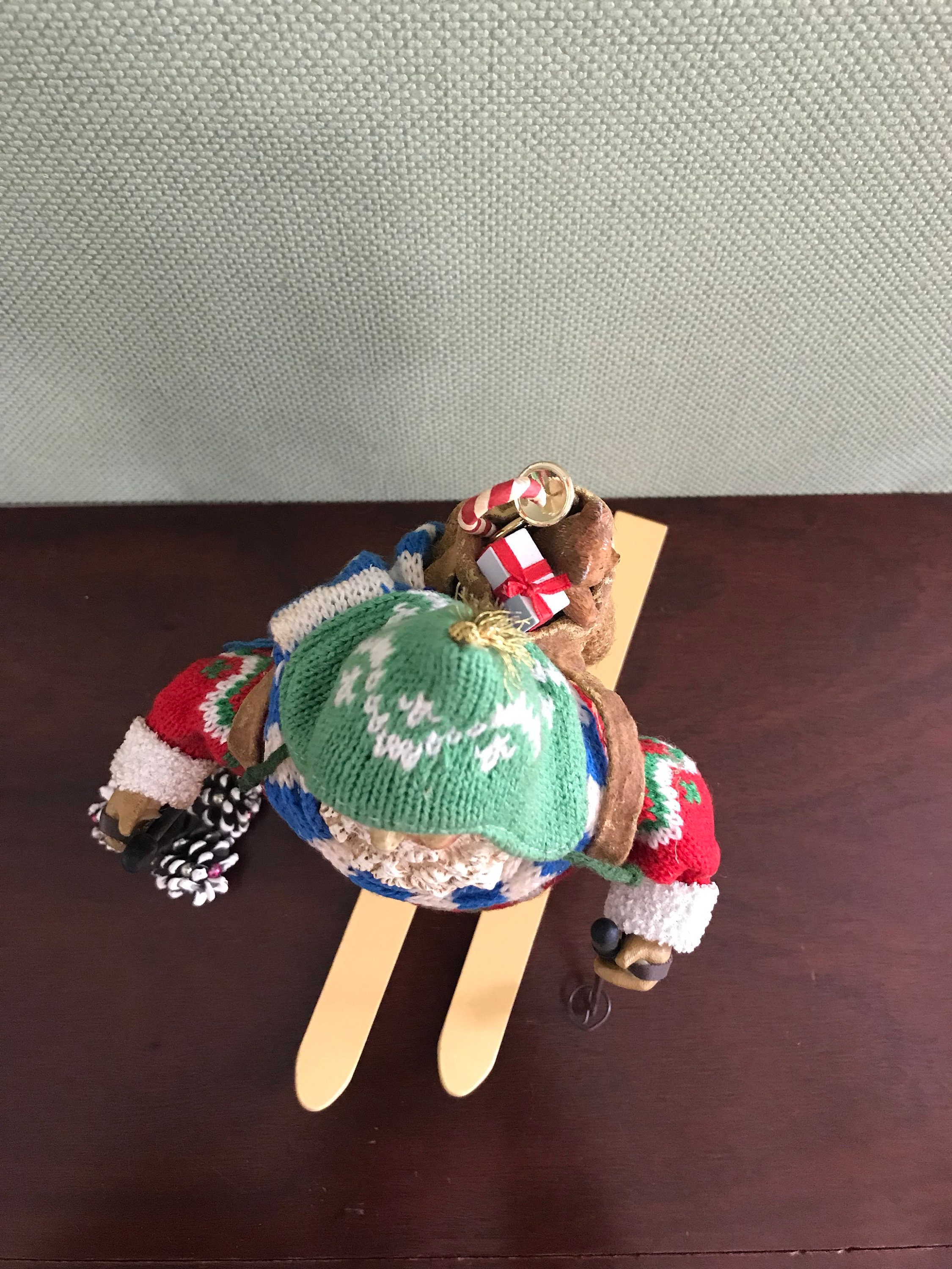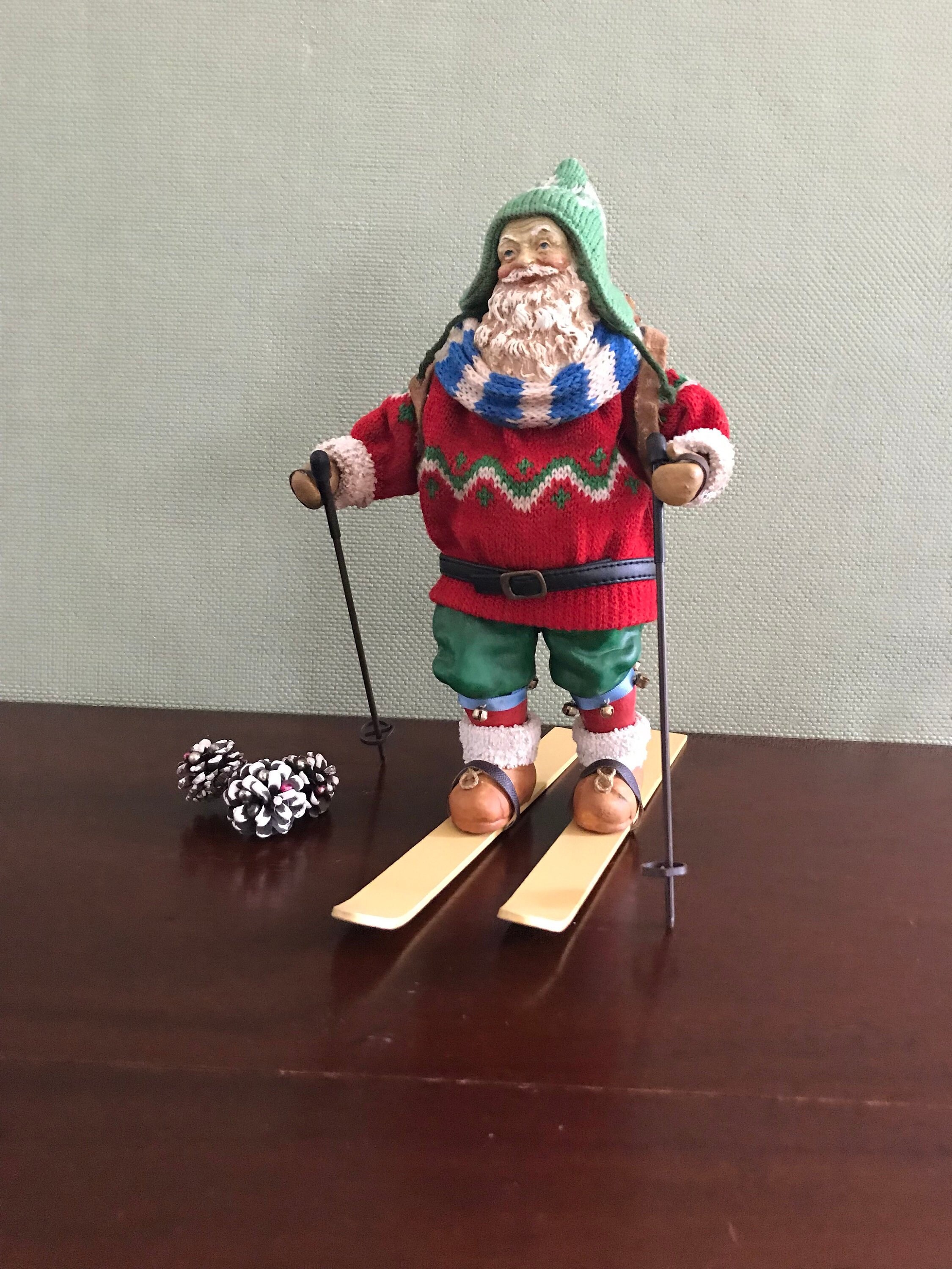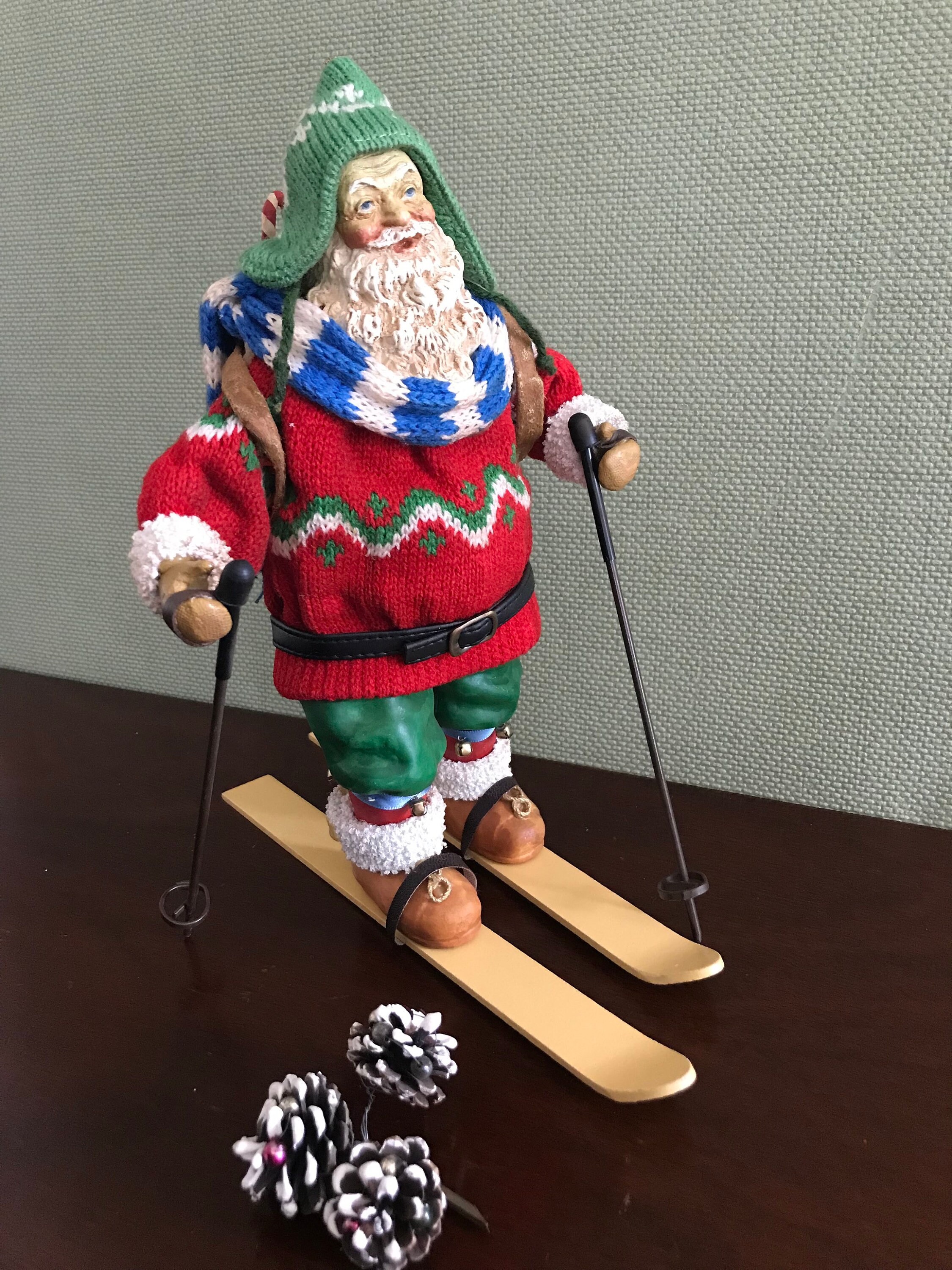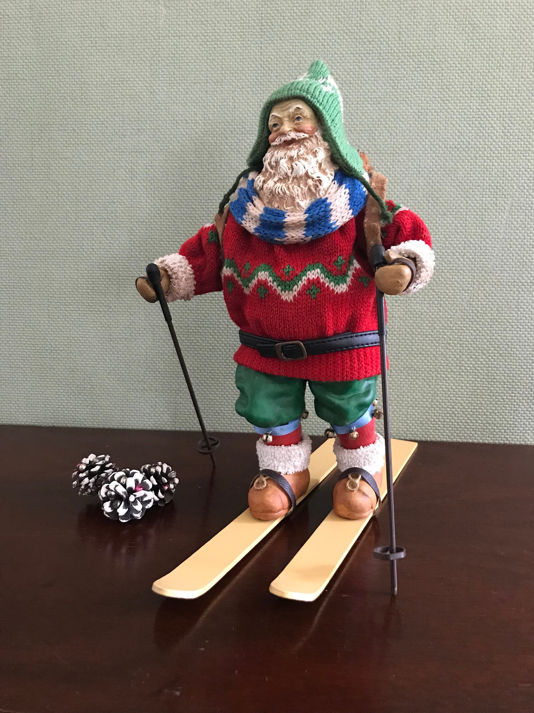 This is a Vintage Clothtique Skiing Santa Claus made by the Possible Dream Company In 1989. This very collectible Santa has fabulous detail from his knit sweater, stocking hat, and sweater to his wooden skis and poles.