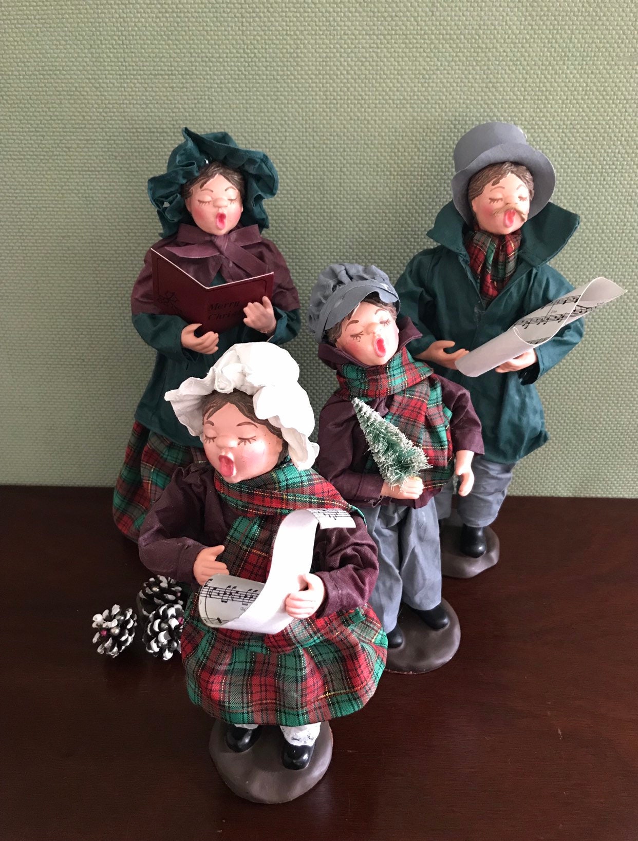 This is a Vintage Set of Victorian Christmas Carolers. They are all dressed in Clothtique Style clothing and are holding Christmas music. The boy is holding a bottle brush Christmas tree.