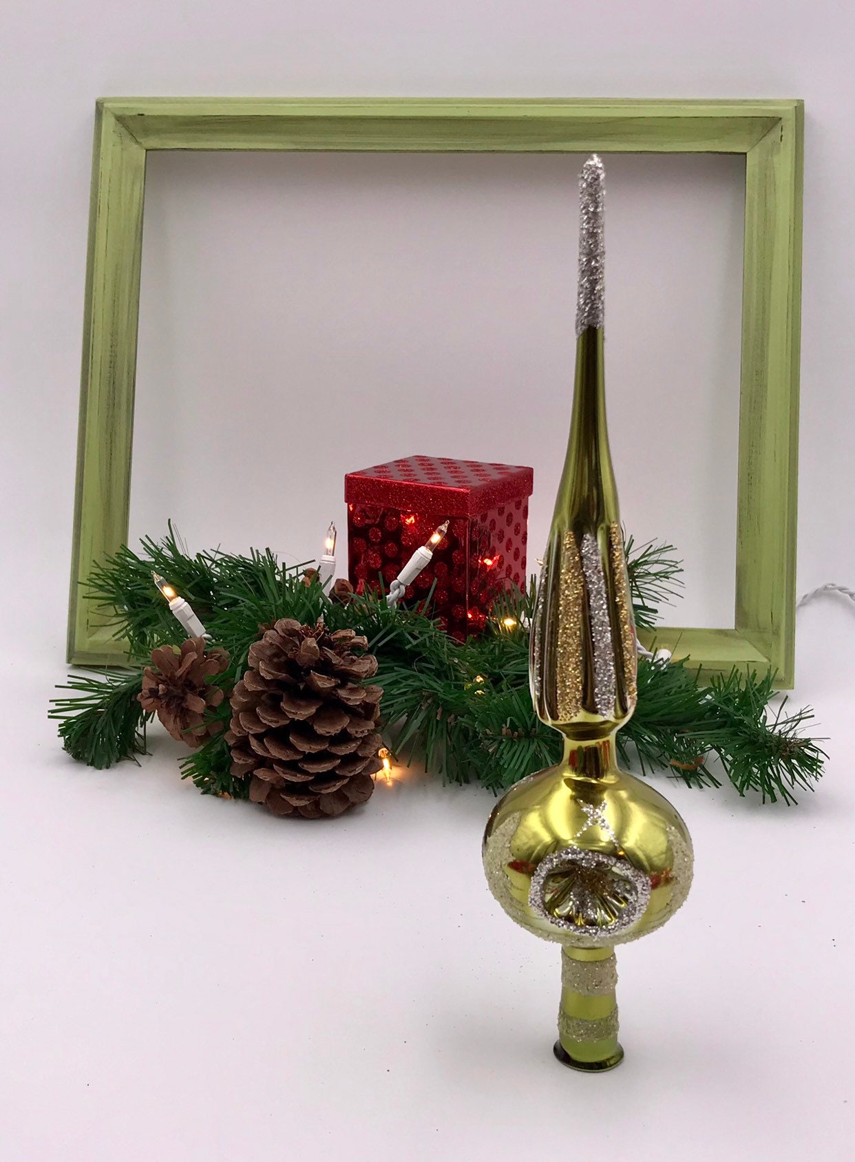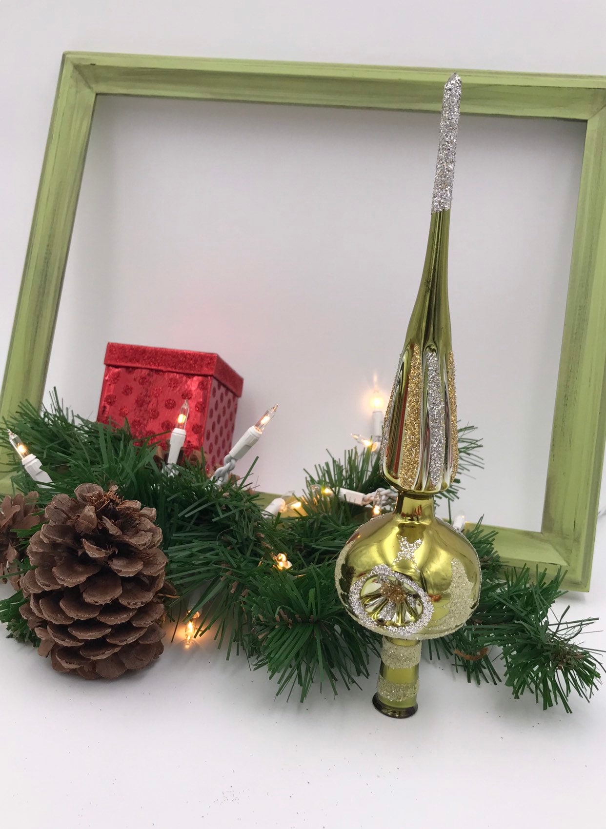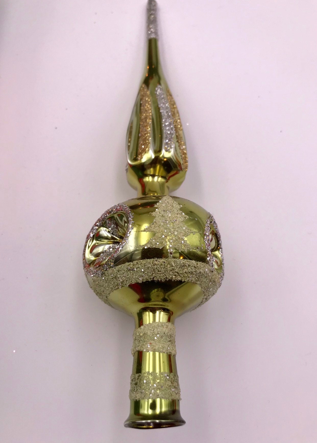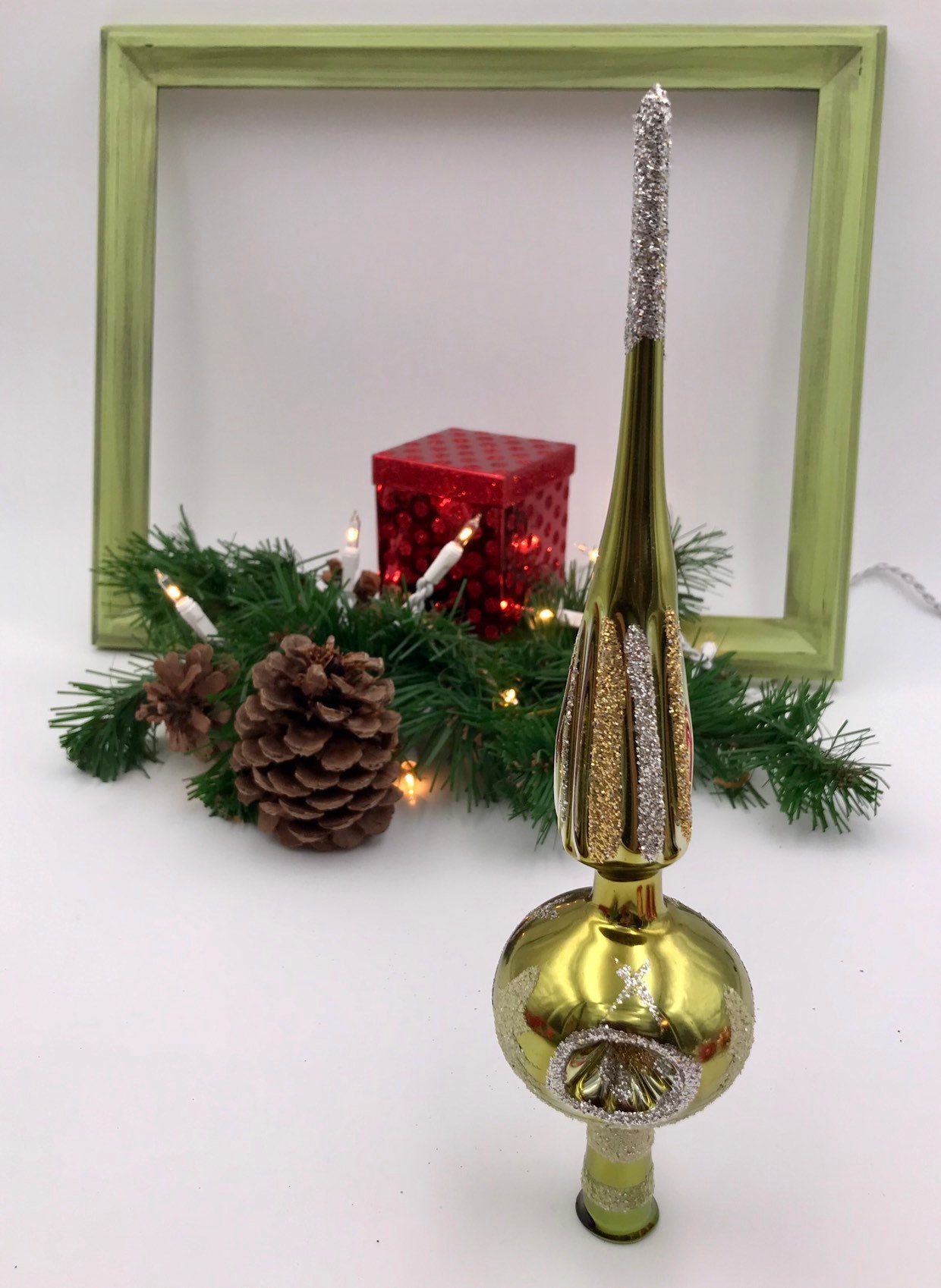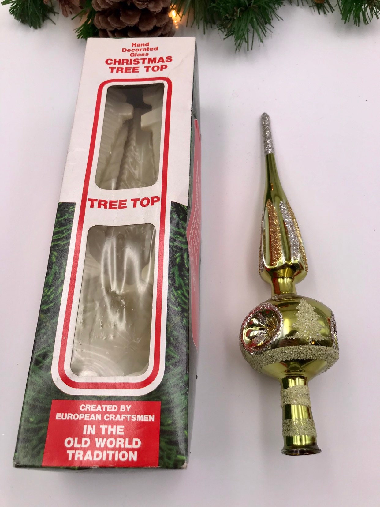 This is a gorgeous vintage hand decorated glass Christmas tree top. Created by European craftsman in the old world tradition. It is new old vintage in the original box. It has indented decorations of silver Mica glitter. A sparkling beauty that is sure to add Vintage Charm to you tree.
