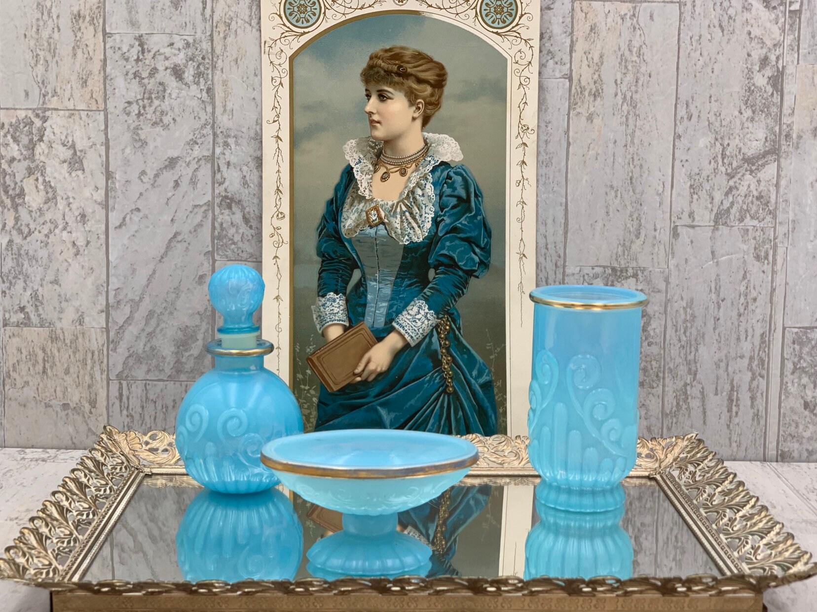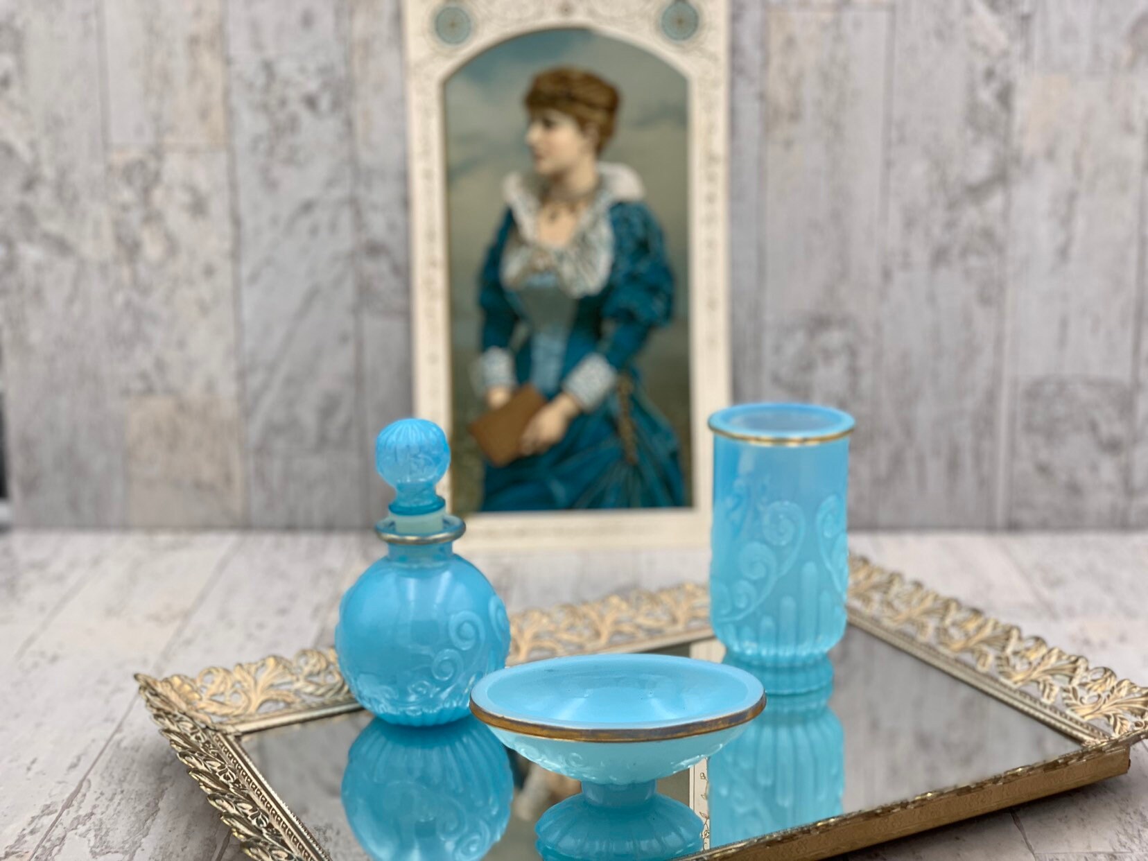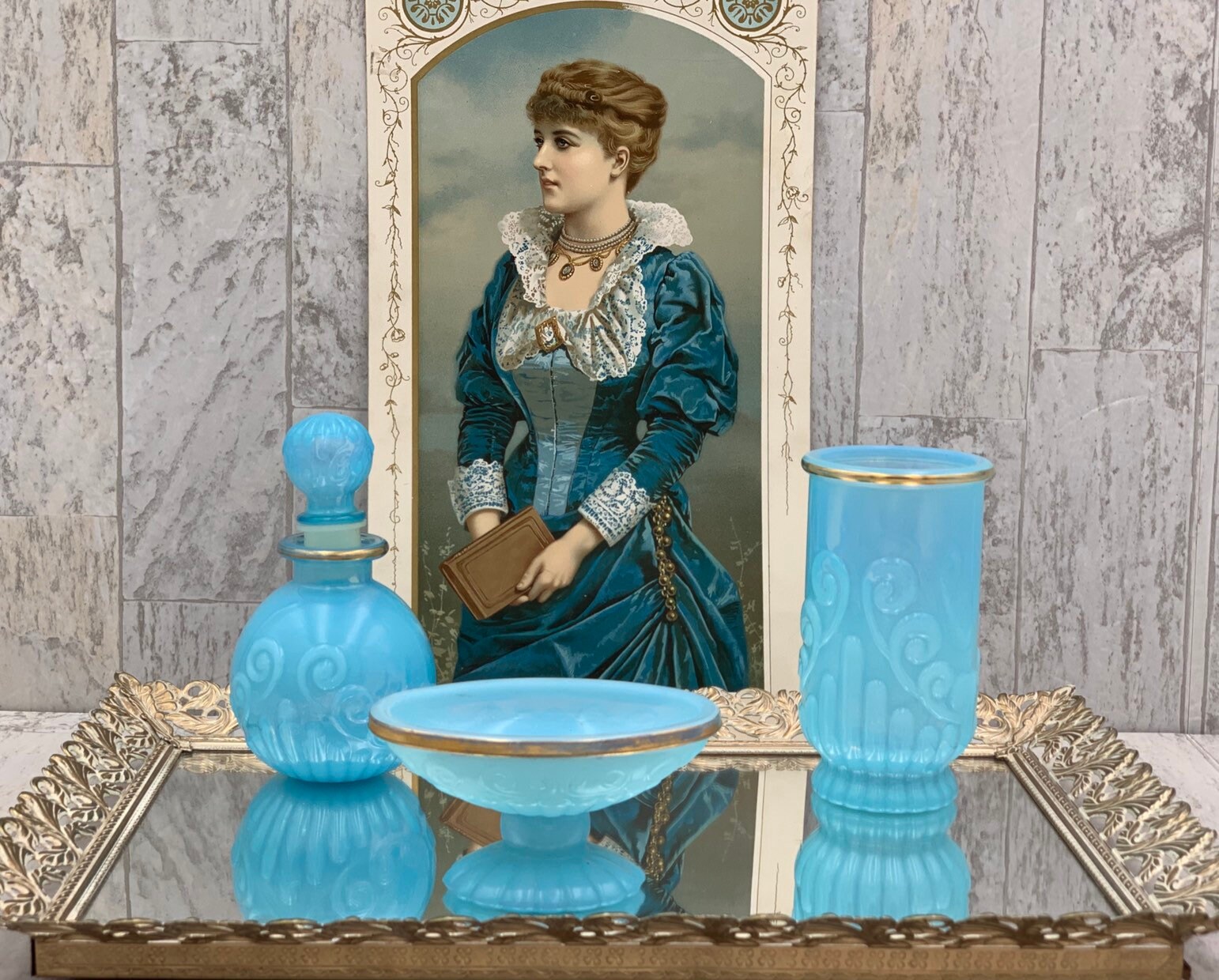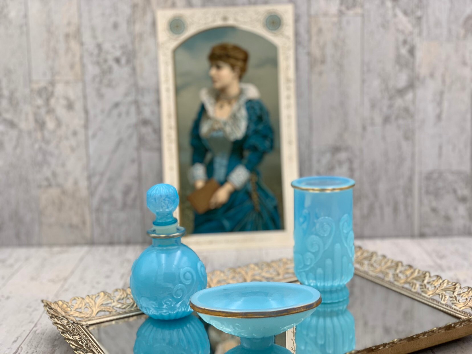 This is a vintage set of bathroom accessories. Made of Beautiful turquoise glass with gold embellishments and a decorative scroll pattern. The set is in excellent condition with no chips or cracks.