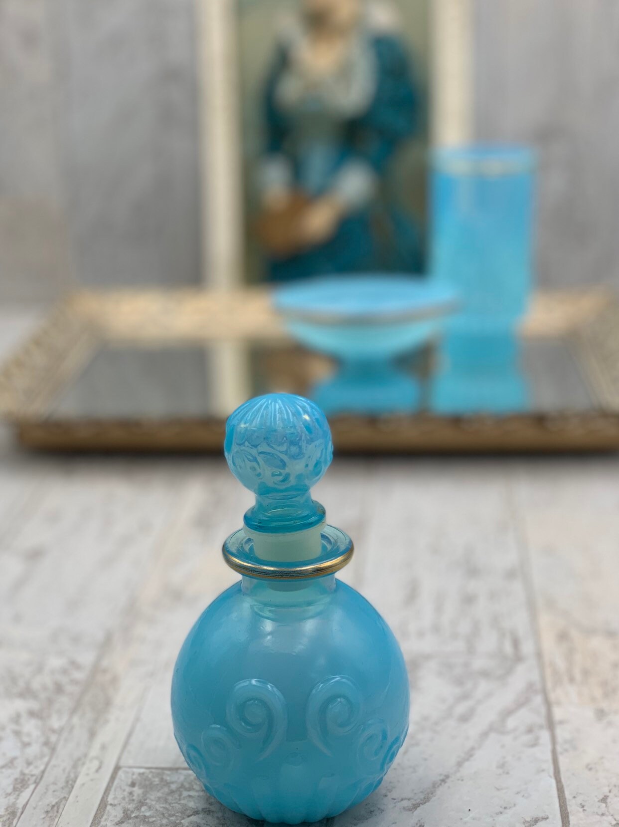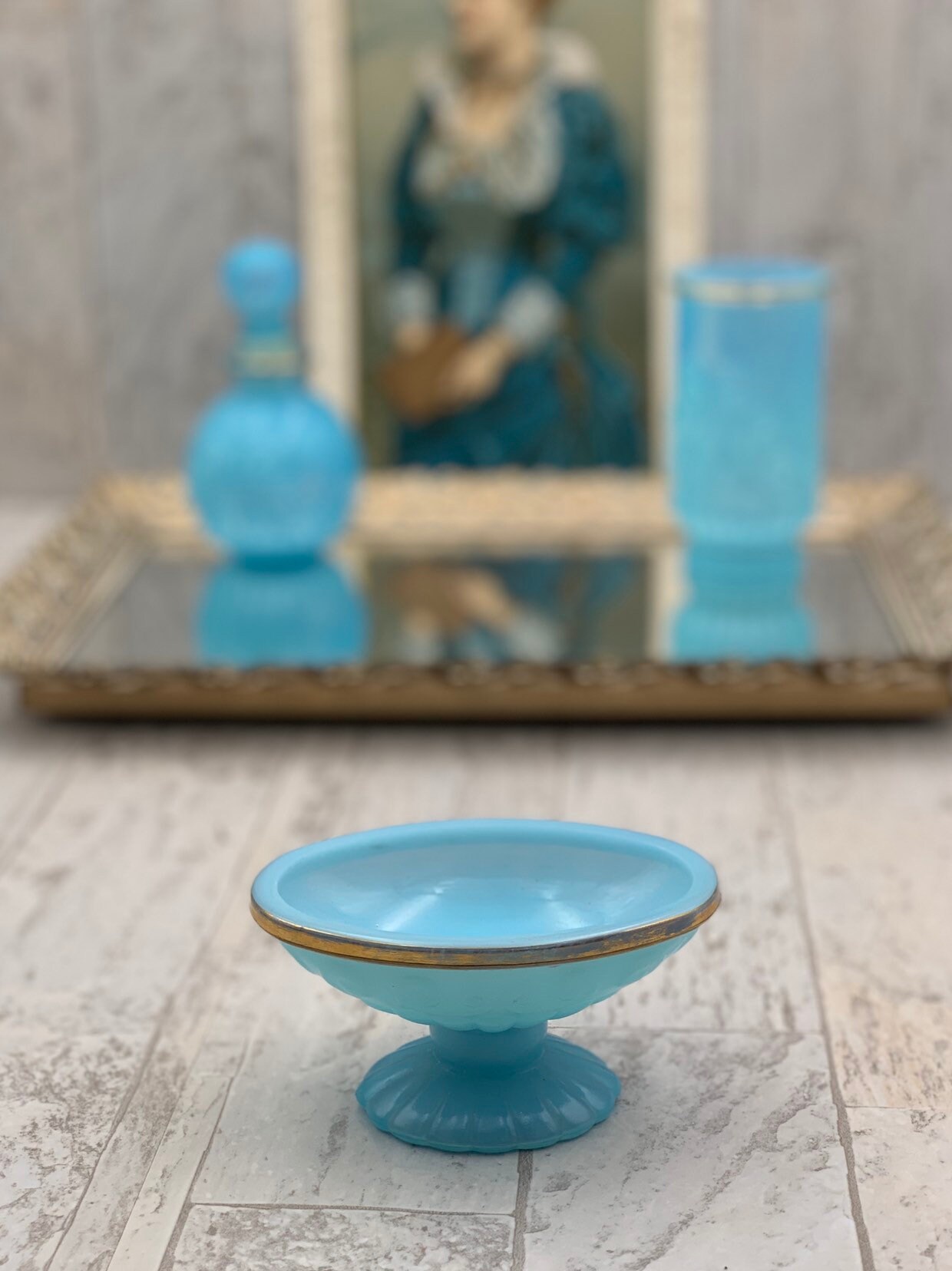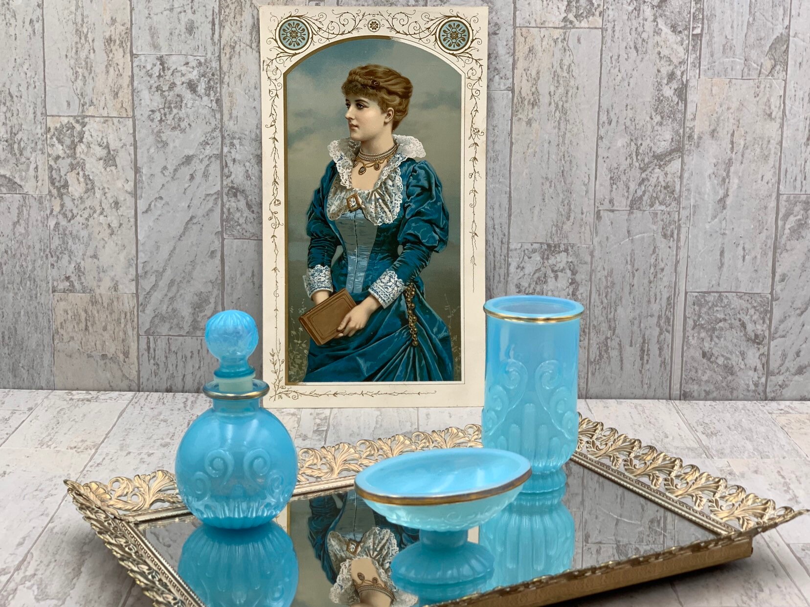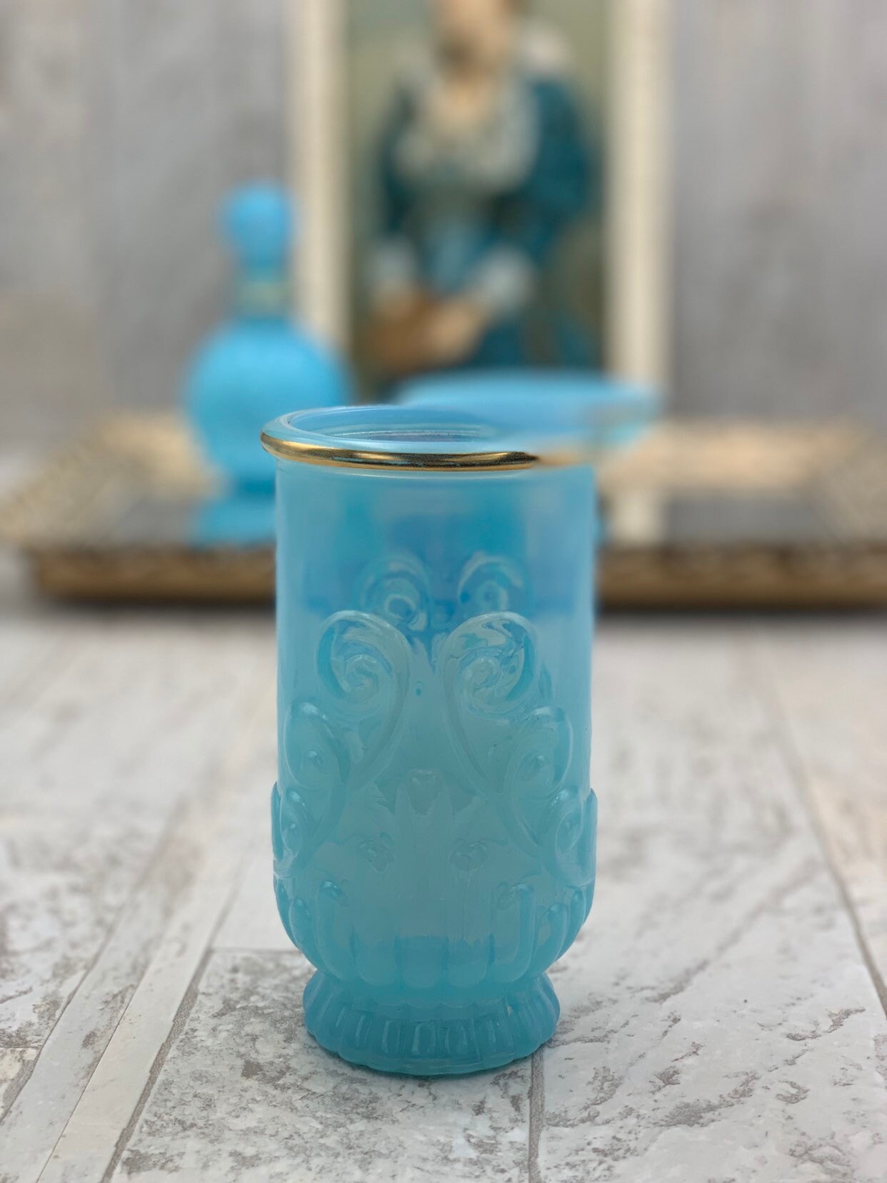 This is a vintage set of bathroom accessories. Made of Beautiful turquoise glass with gold embellishments and a decorative scroll pattern. The set is in excellent condition with no chips or cracks.