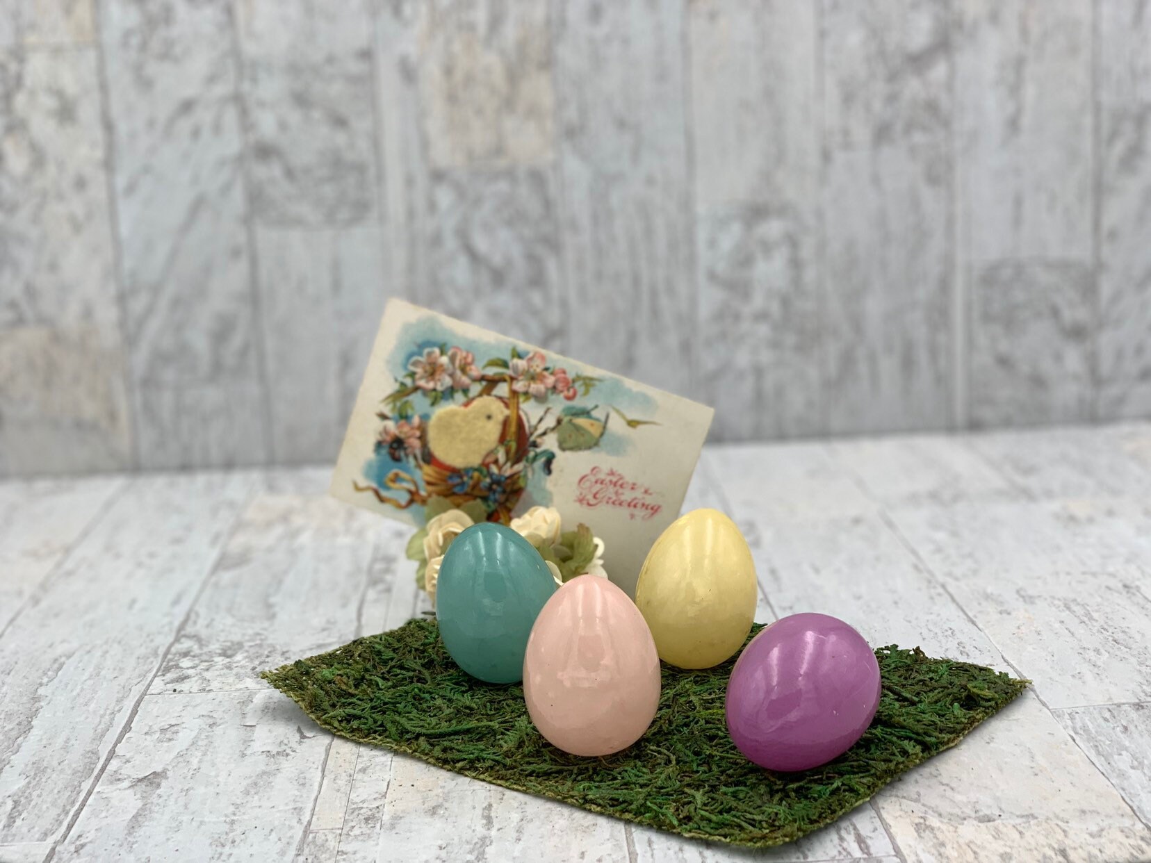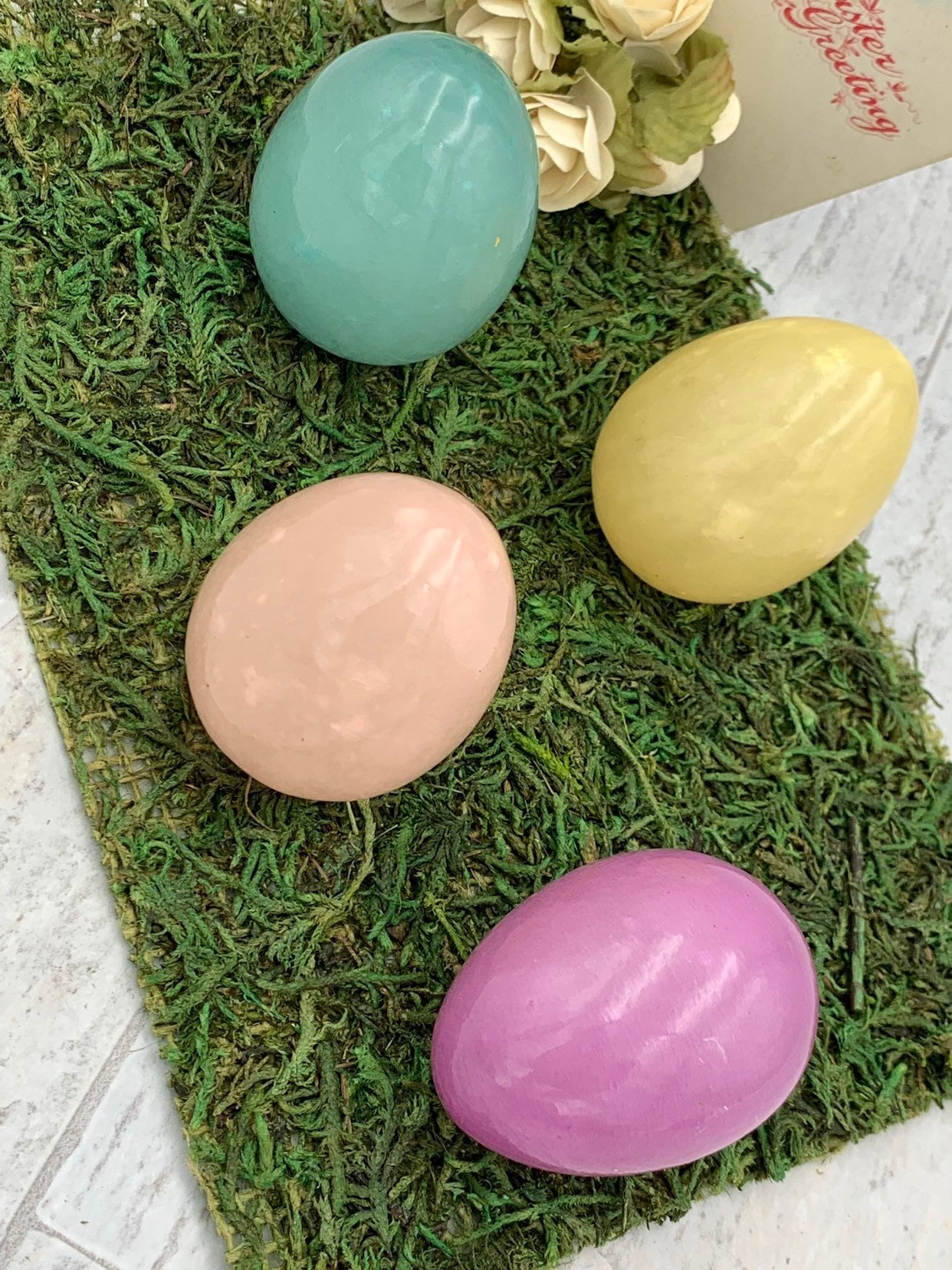 This is a lovely set of 4 vintage Easter egg ornaments in lovely pastel Spring colors. These pretty ornaments are made of colored and polished alabaster. There is one yellow, one Lilac, one pink, and one blue. They would be pretty nestled in a basket of Easter grass or in pretty egg display cups.