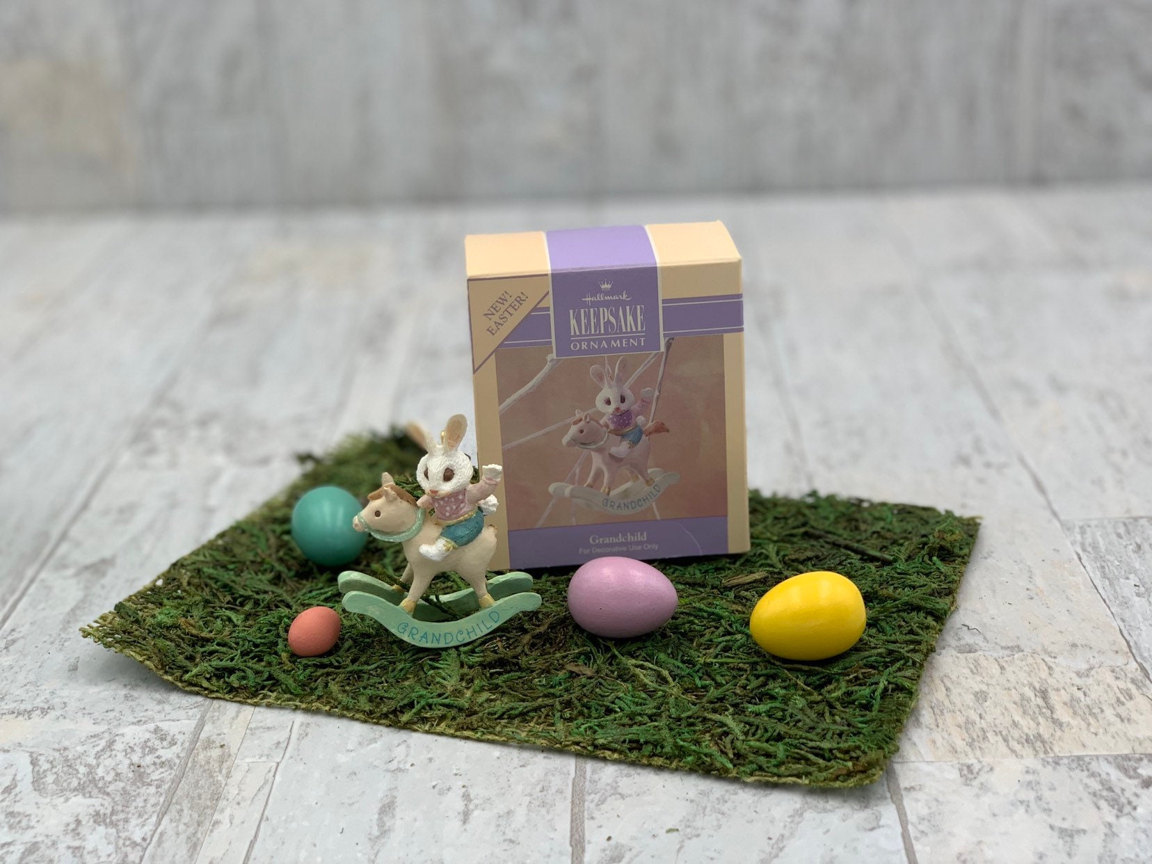 This is a vintage Miniature Hallmark Easter Ornament in the original box. This cute little ornament has a white Easter Bunny riding a rocking horse. It is painted in pastel colors perfect for a little Easter ornament tree.