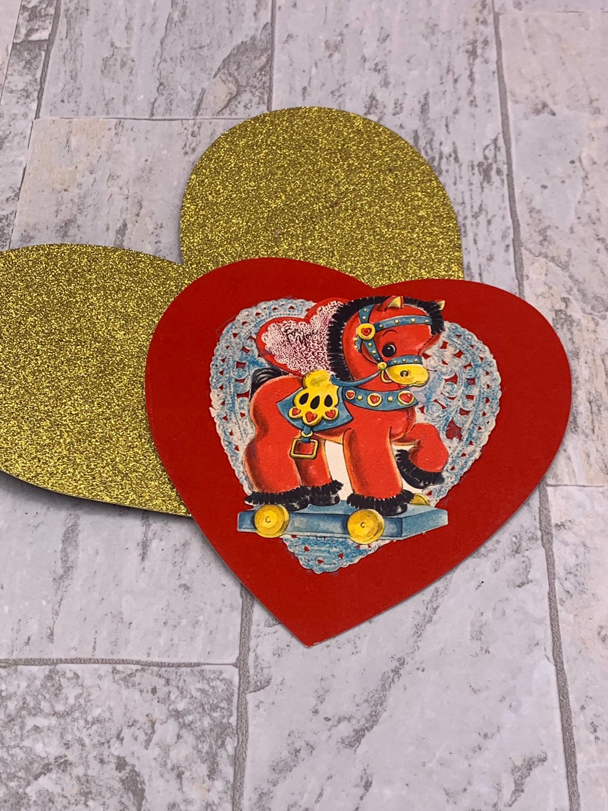 The 💕 heart shaped card is a layered card. A pasteboard heart has a blue cut out doily on it, and then the top layer is a little textured red pony. The heart on his back simply reads “For you” it is a one sided card with no writing on the back.