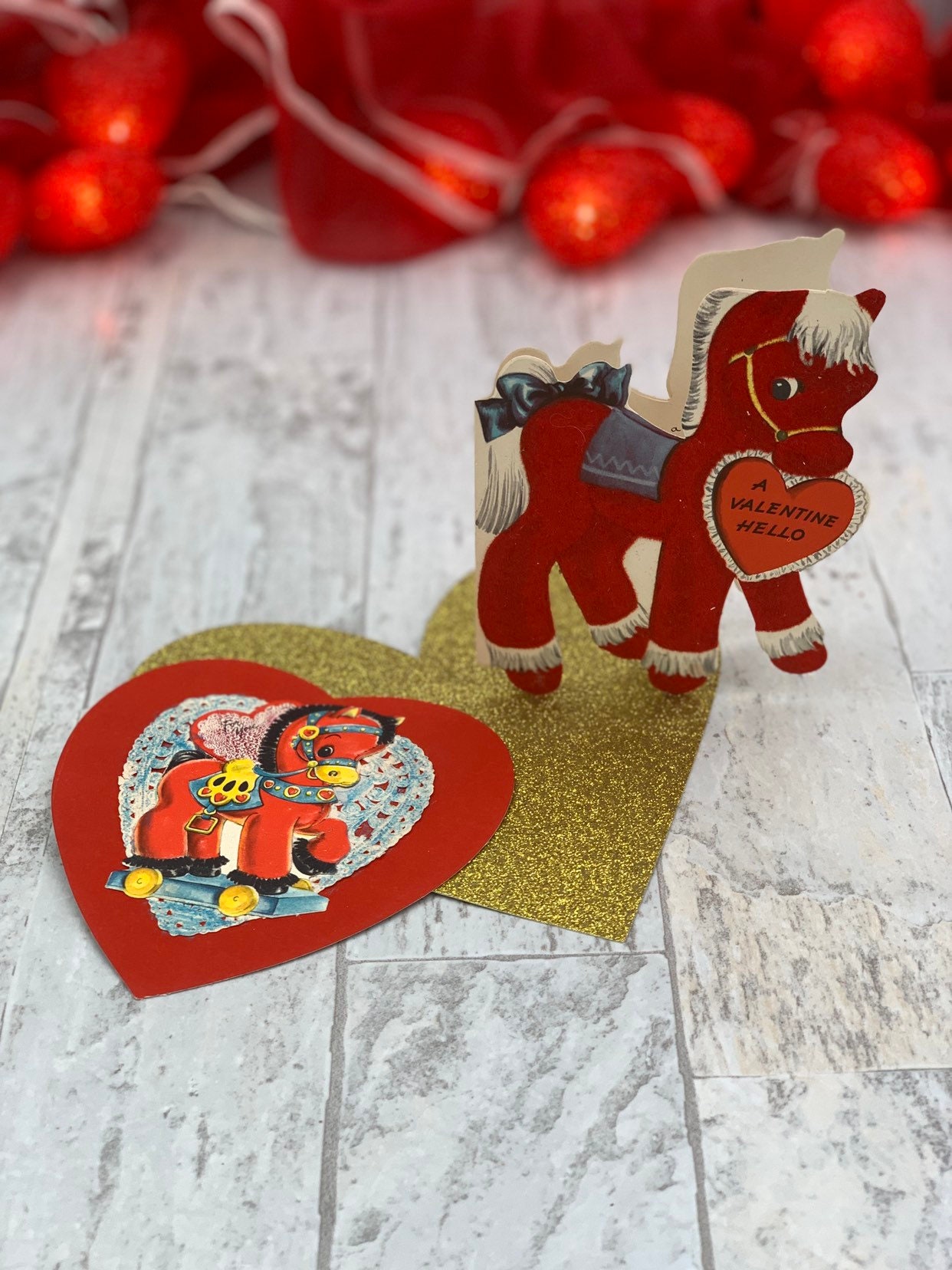 This is a set of two simply darling pony valentine cards. One is accented with red flocking. The other is a layered card.