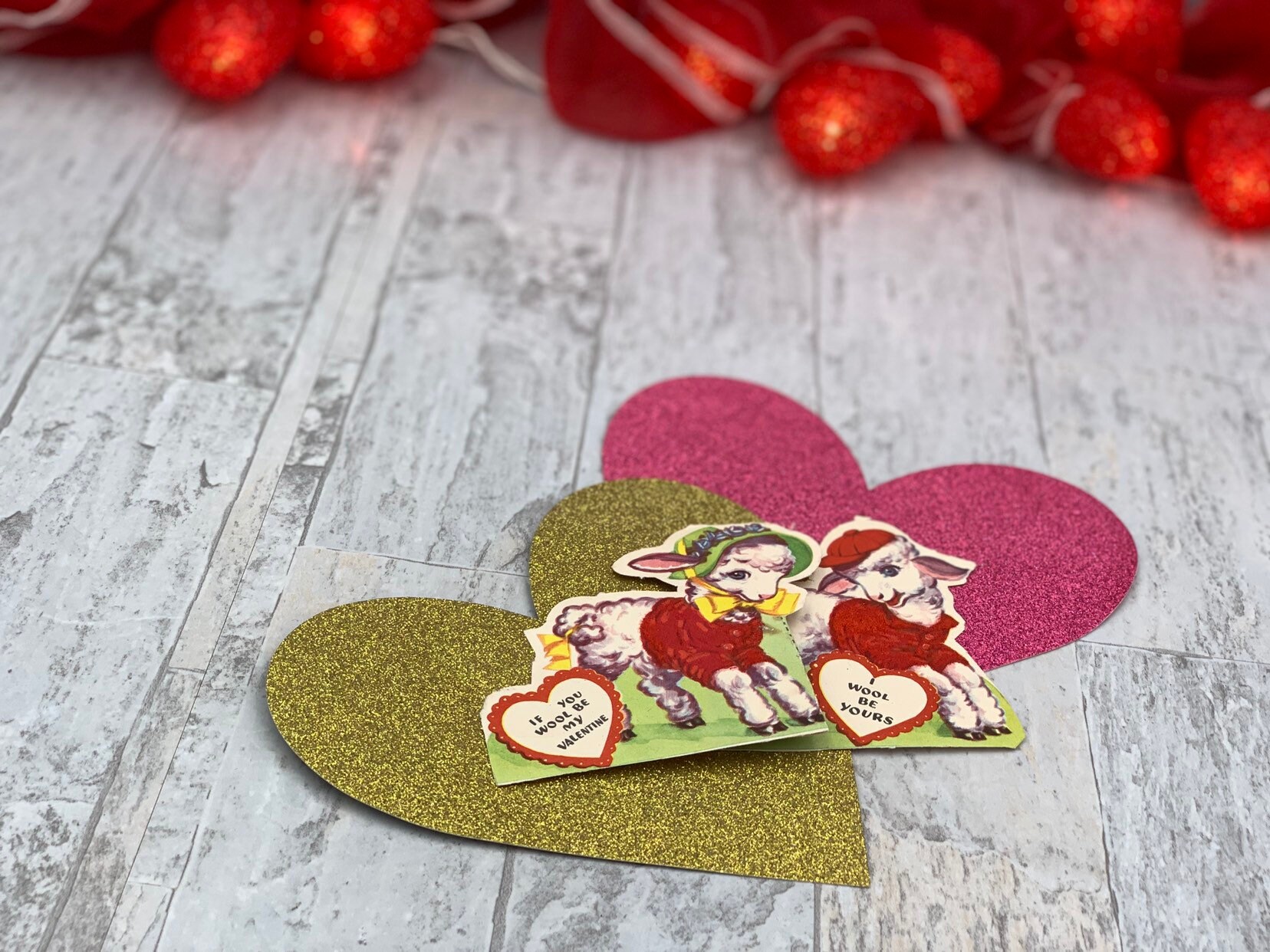This is a Folding Valentine card accented with red flocking. This sweet little diecut Valentine features a little anthropomorphic lambs. A little girl lamb and a little boy lamb. When you unfold the card you can see a little heart that says “Don’t shrink away for me”. The message along the bottom reads “If you wool be mine, I wool be yours”. A cute little play on words.