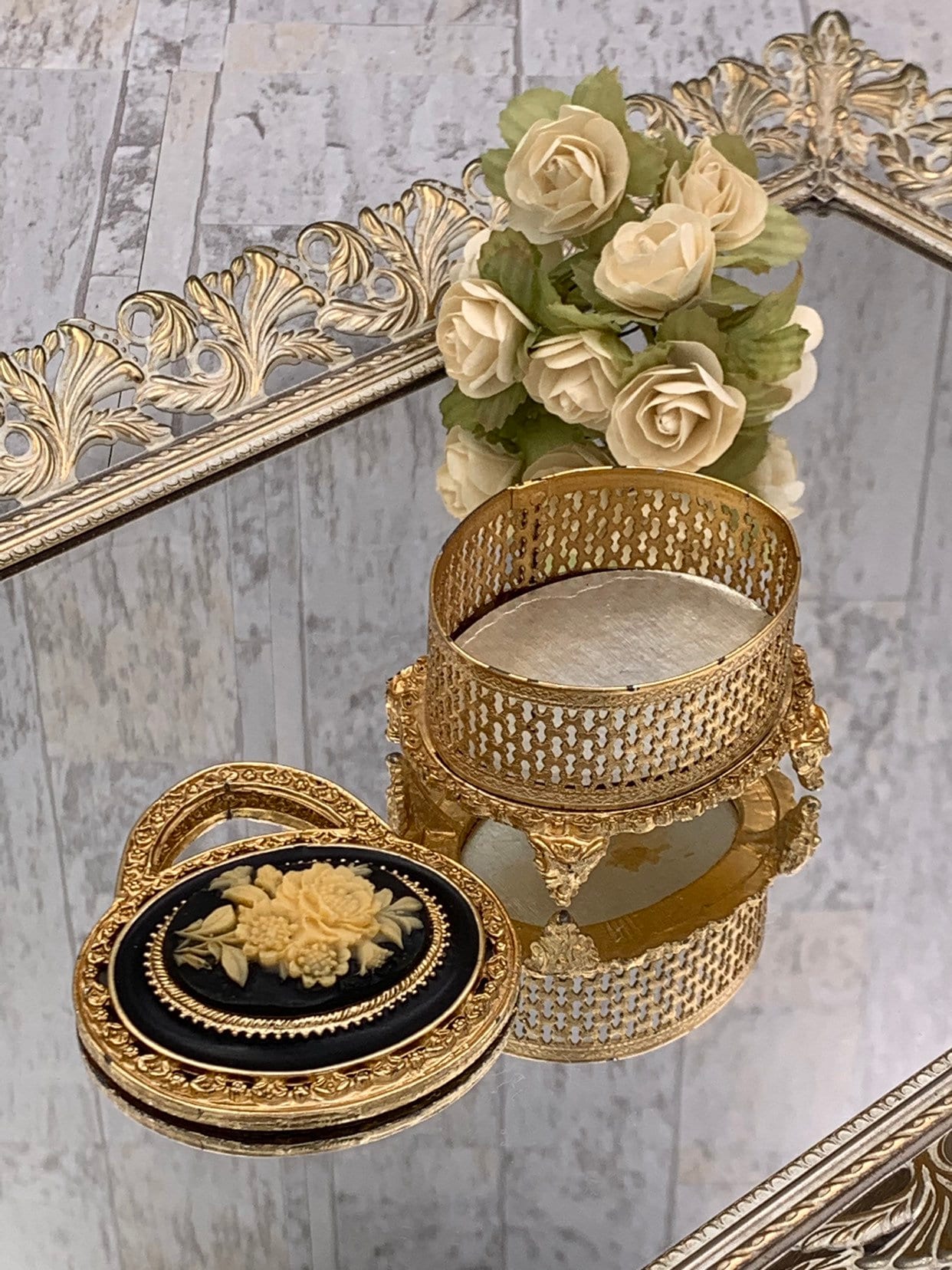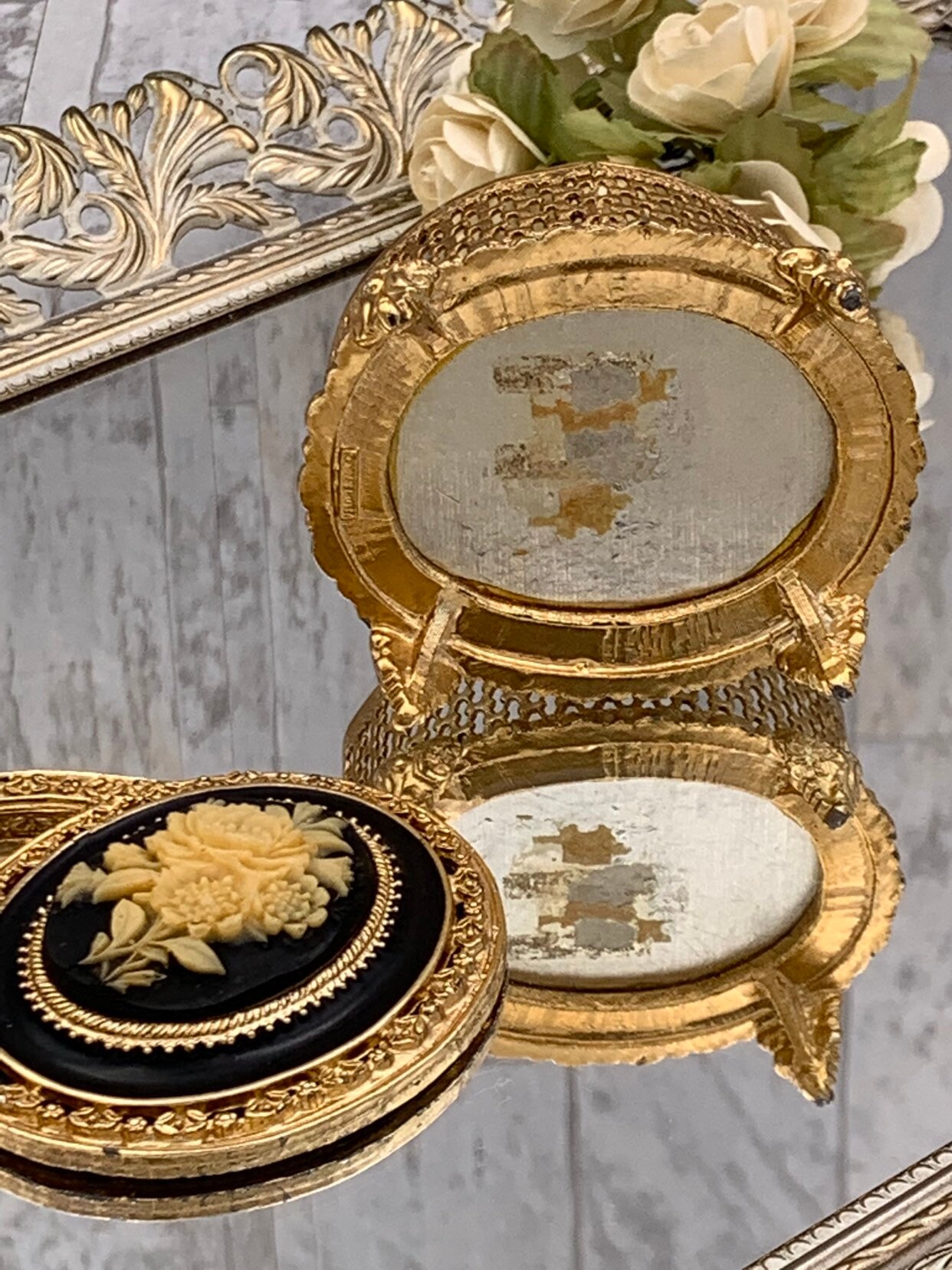 Elegant Vintage Florenza Mini Trinket Box. This Box has a beautiful carved resin lid depicting a soft pink flower and leaf posey against a Onyx colored background. The top is shaped like a purse with a handle. The underside of the lid has a small mirror.