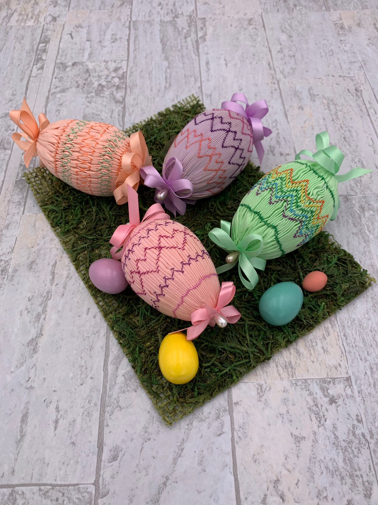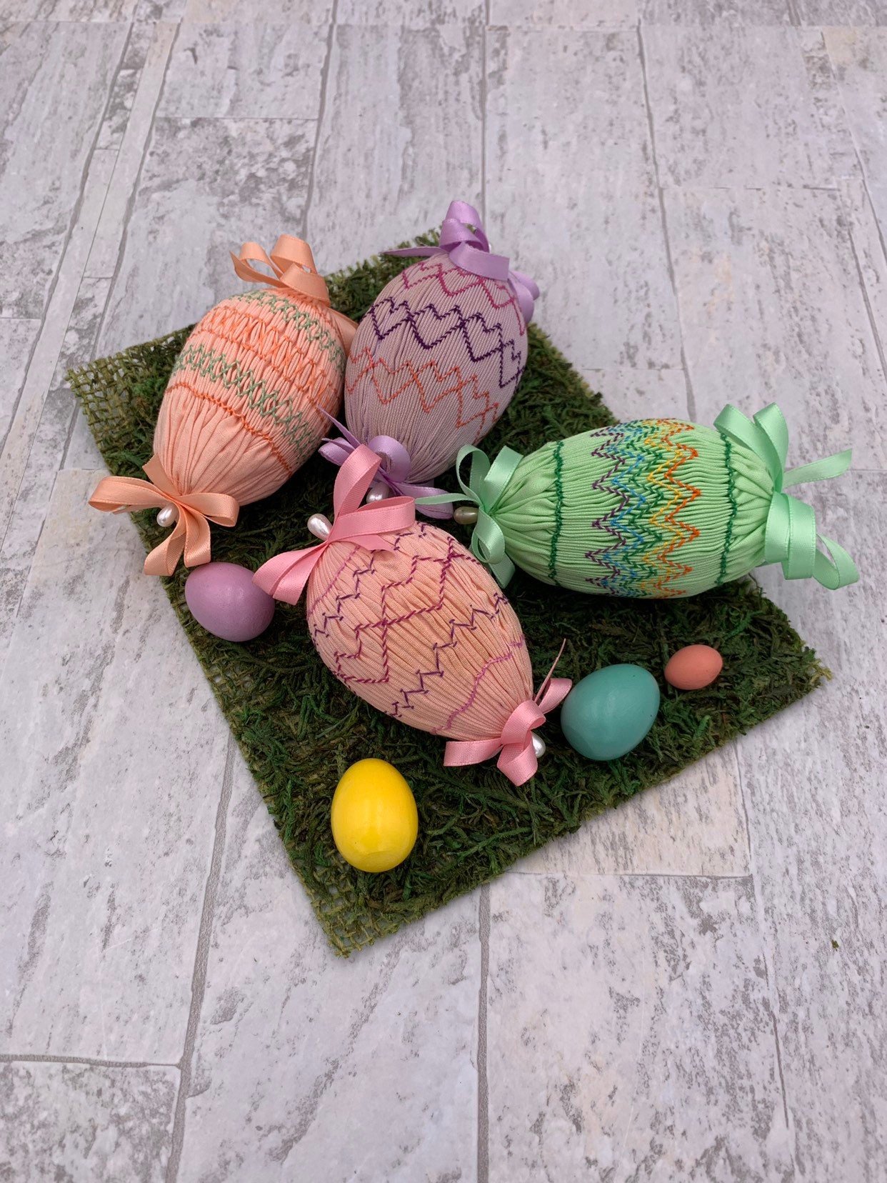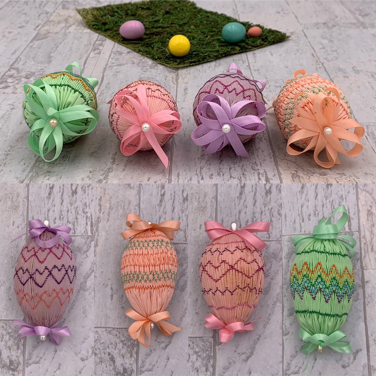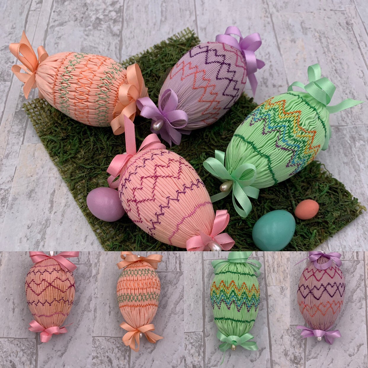 This is a beautiful Vintage set of 4 Handmade Easter egg decorations. These lovely eggs are cover in smocked pastel fabrics and embroidered in lovely patterns. Each egg is decorated with satin ribbon and pearl bead pins.