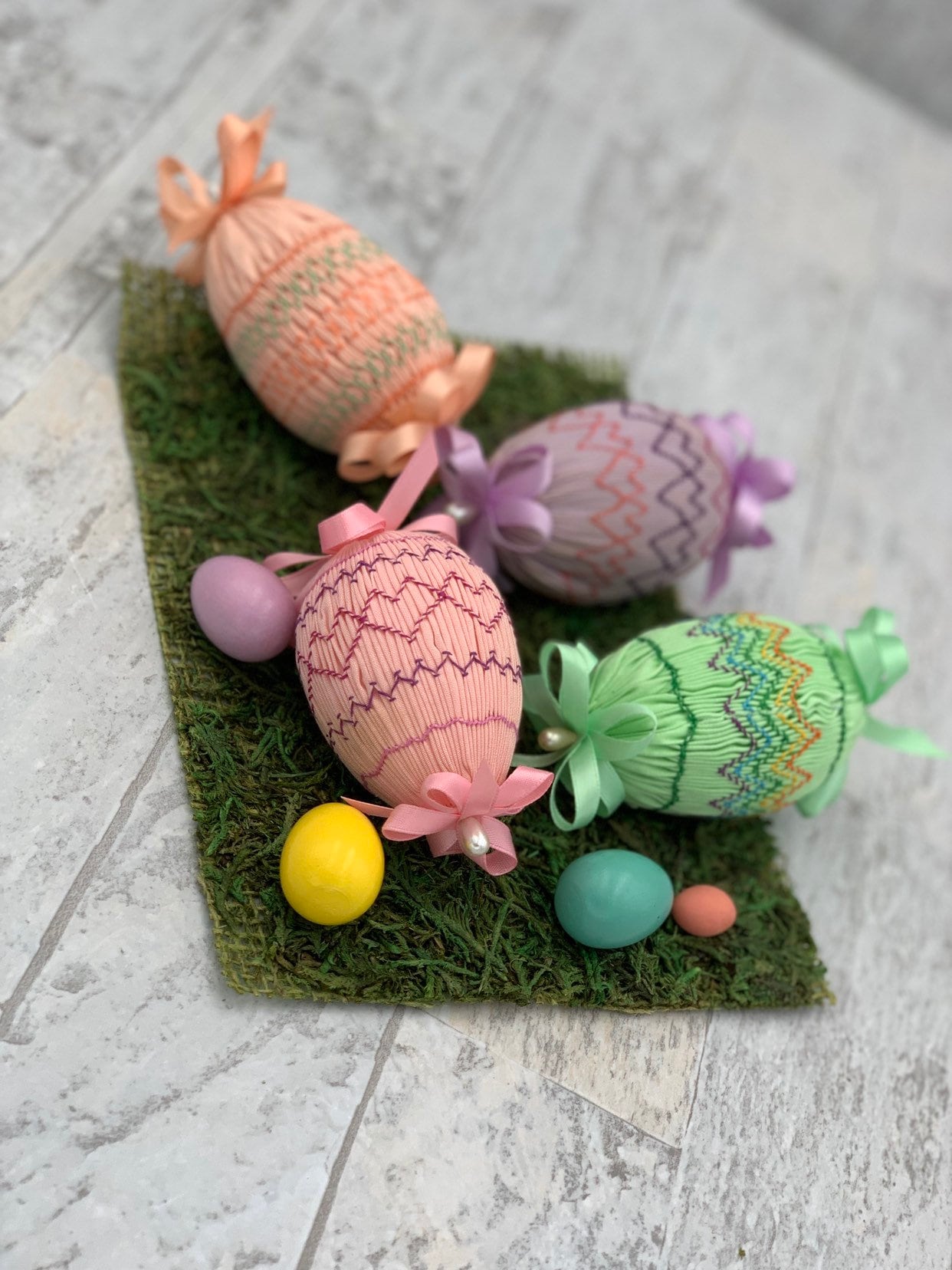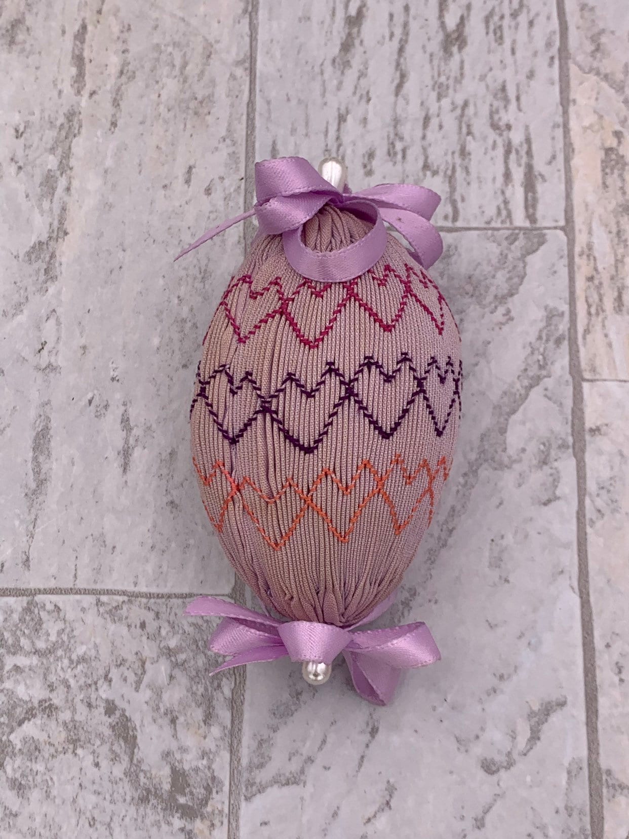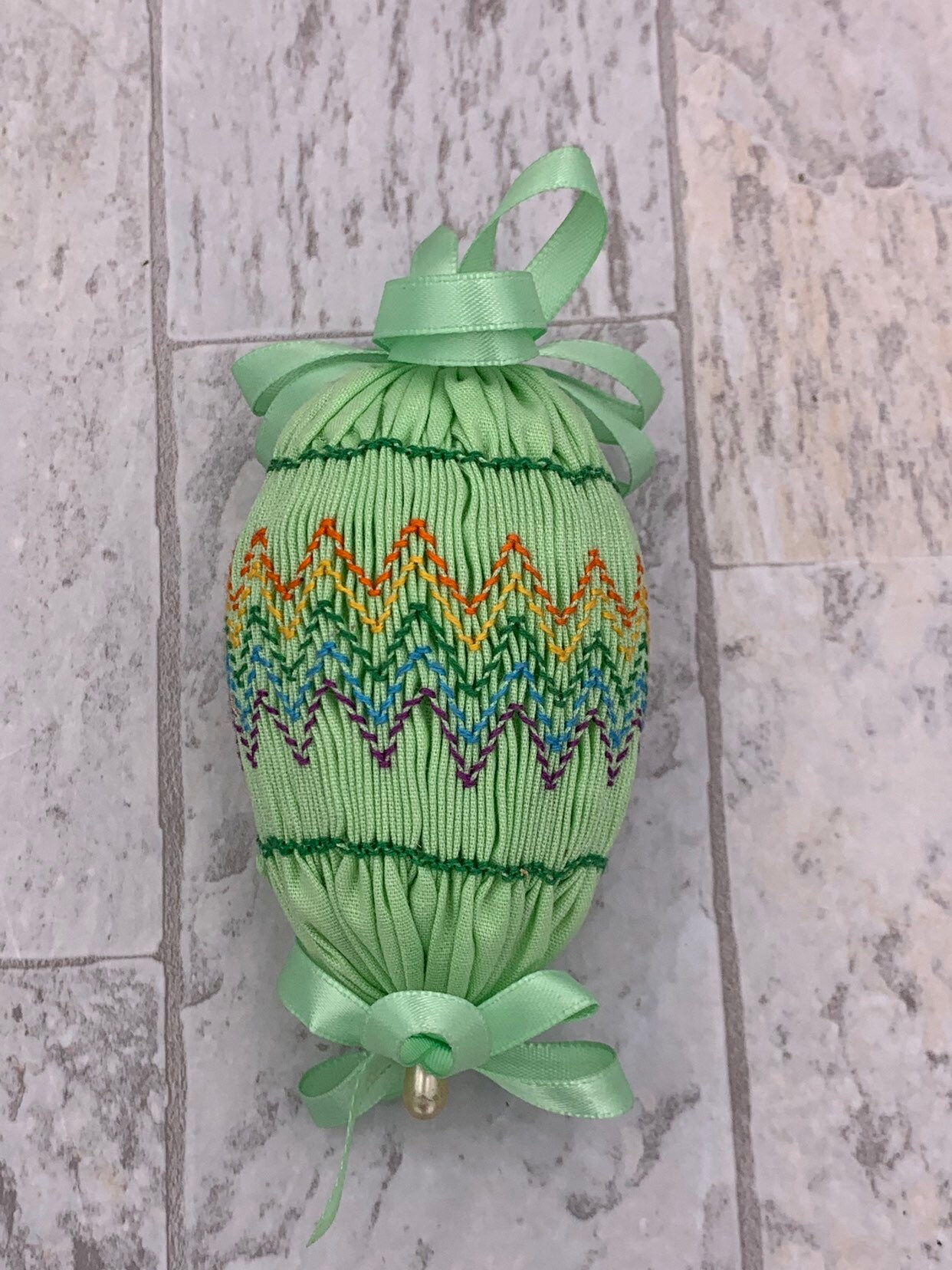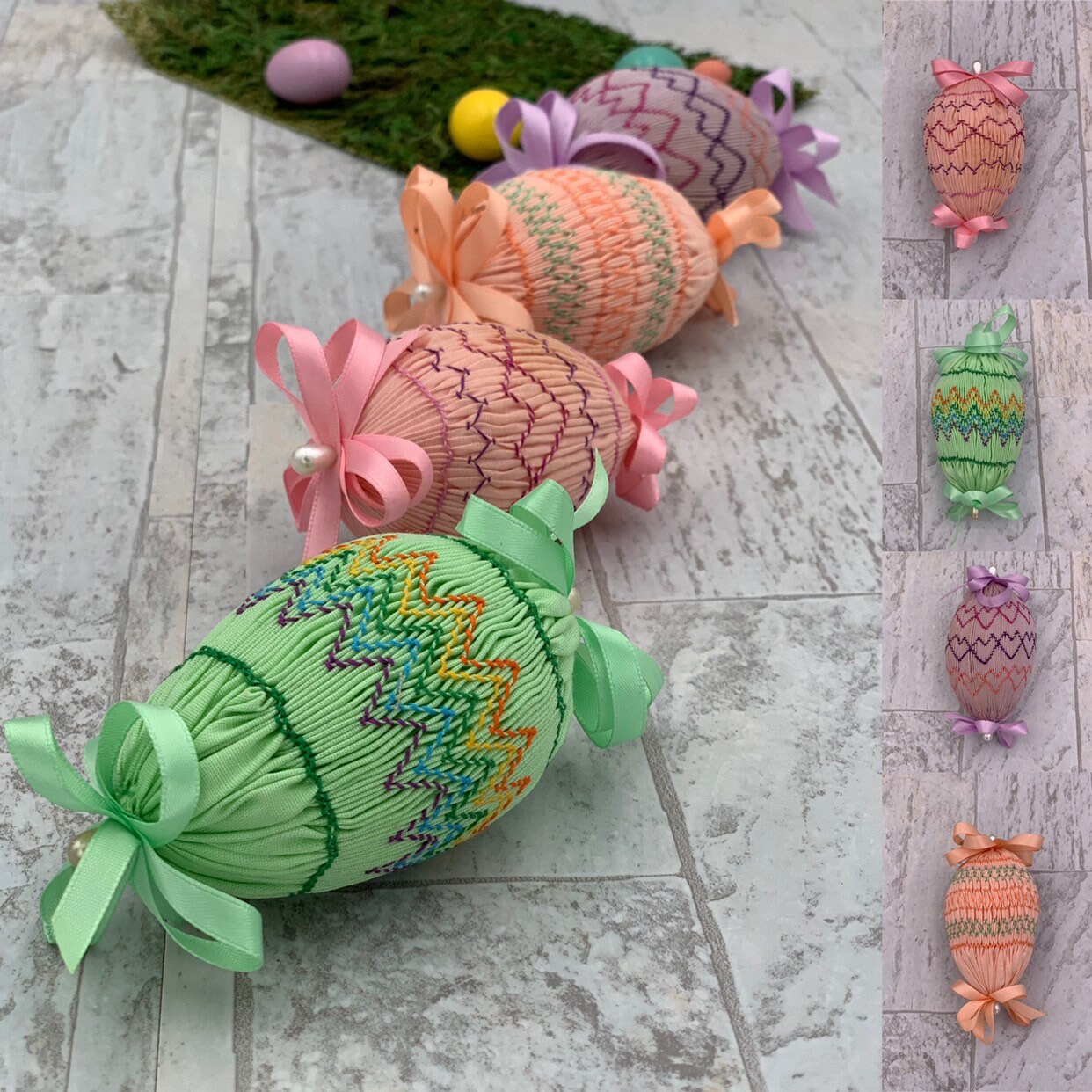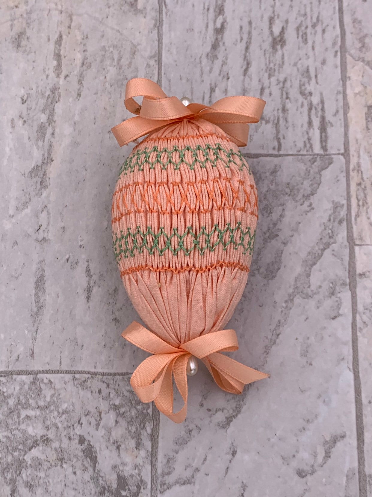 This is a beautiful Vintage set of 4 Handmade Easter egg decorations. These lovely eggs are cover in smocked pastel fabrics and embroidered in lovely patterns. Each egg is decorated with satin ribbon and pearl bead pins.