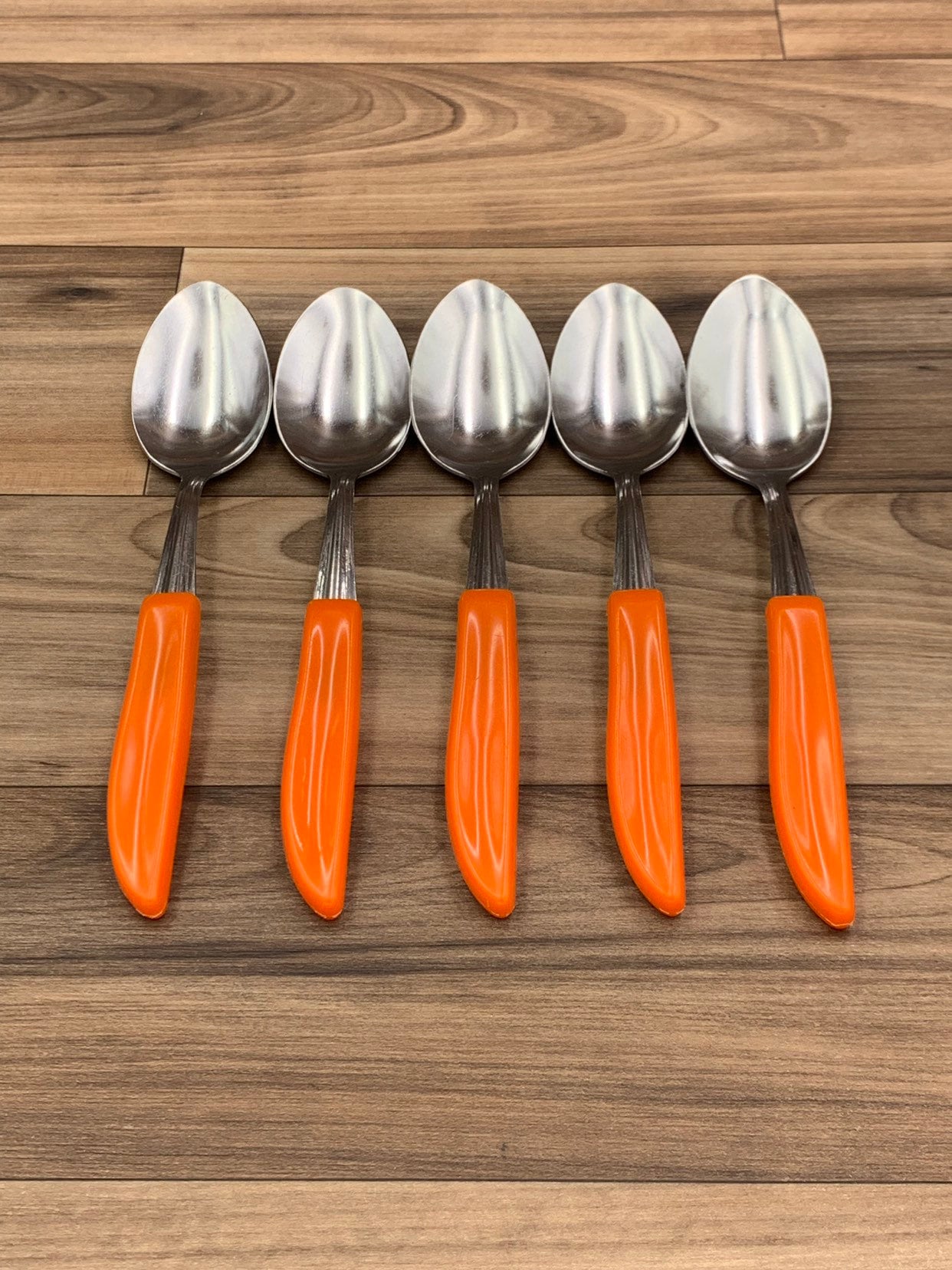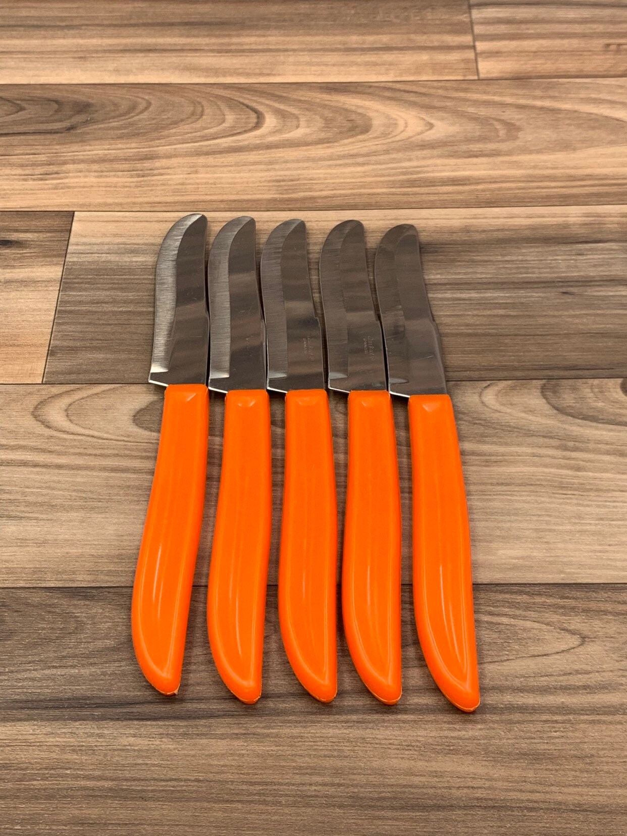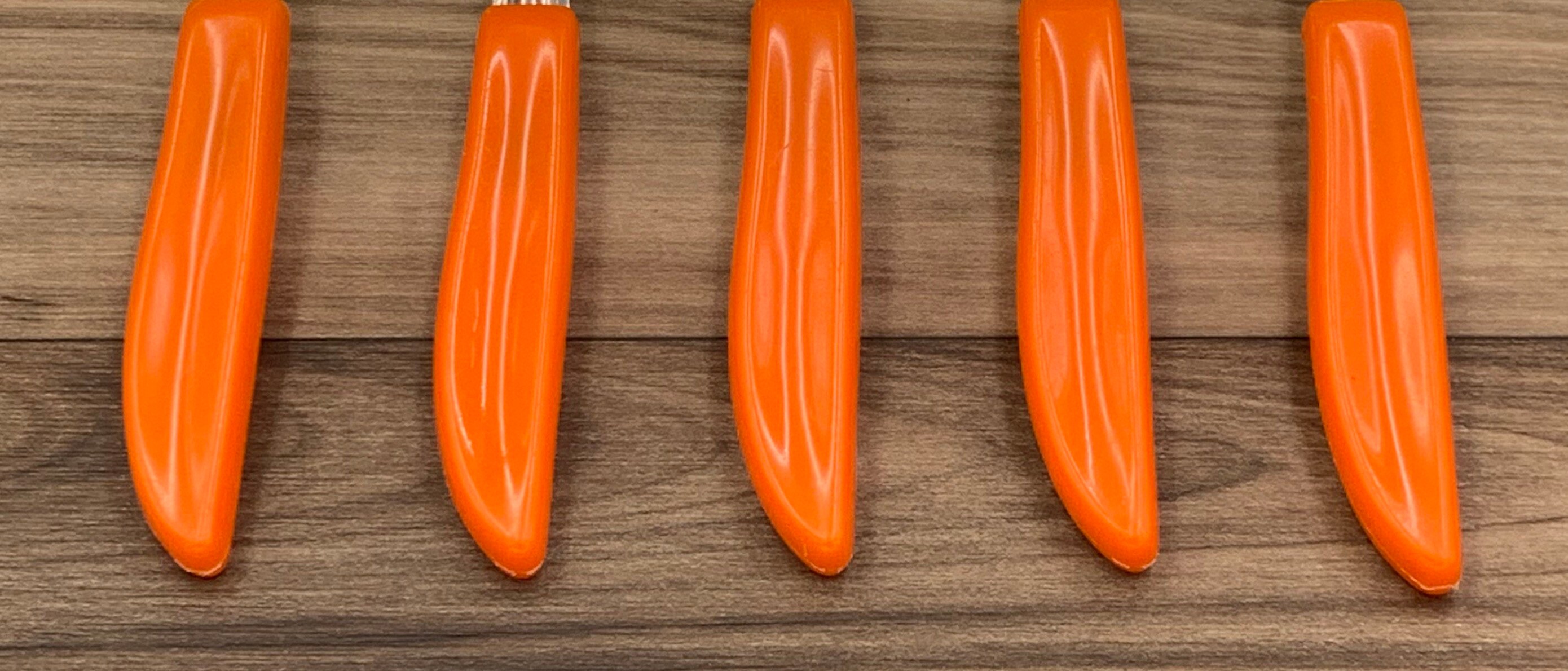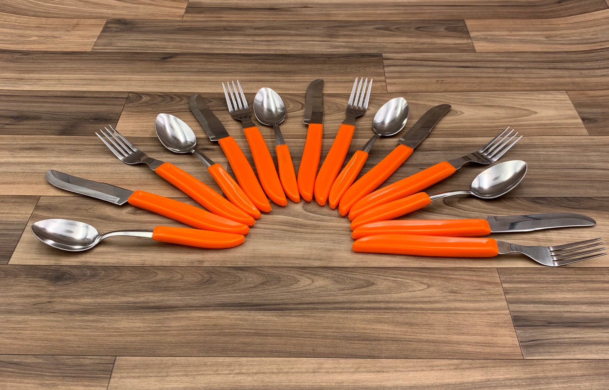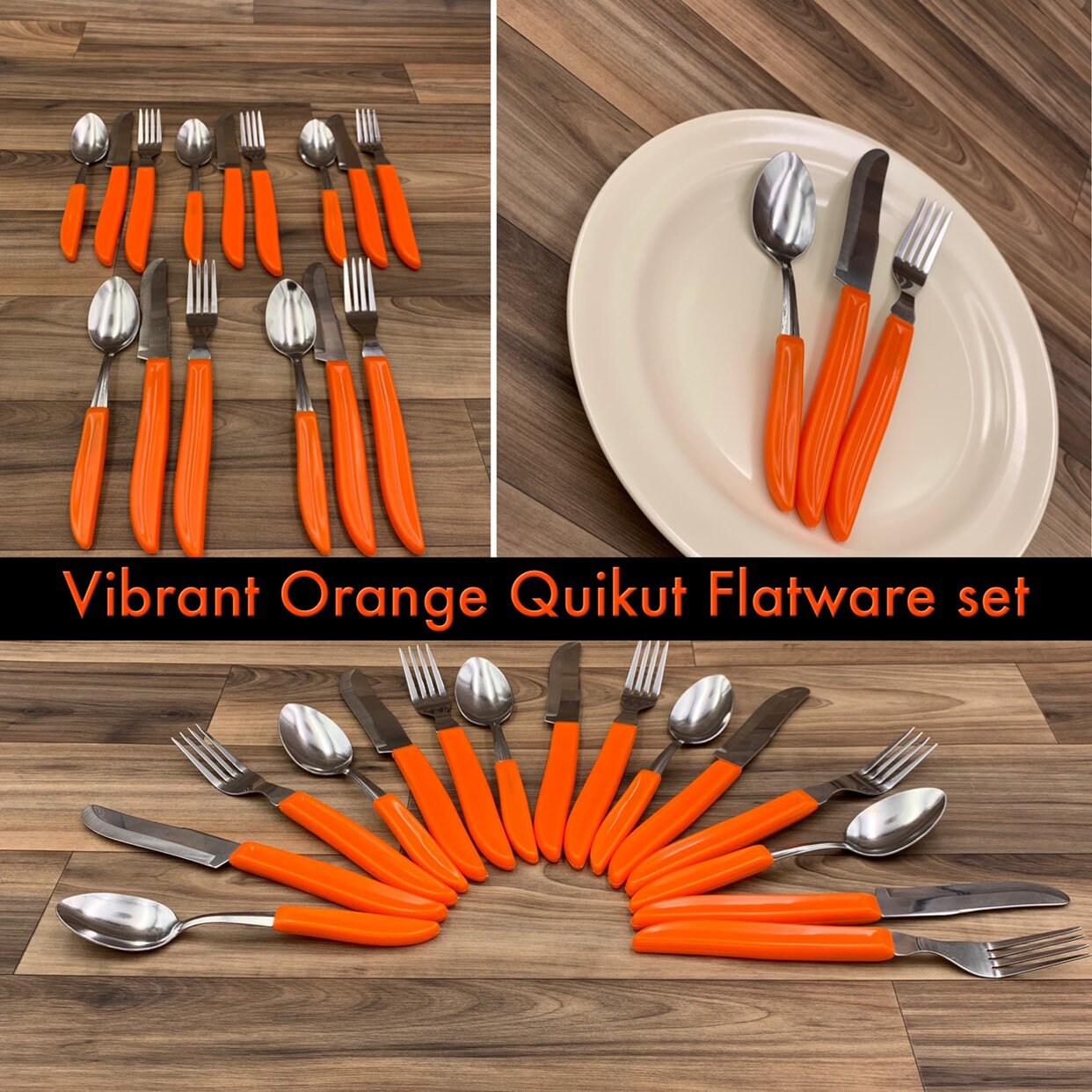 This is A Set of Vintage Quikut Stainless Flatware with Vibrant Orange Colored Handles. This flatware is perfect for outdoor dining. This is a simple service for six. Each place setting has a knife, teaspoon, and fork. The knives have a multipurpose design with a sharper egde.