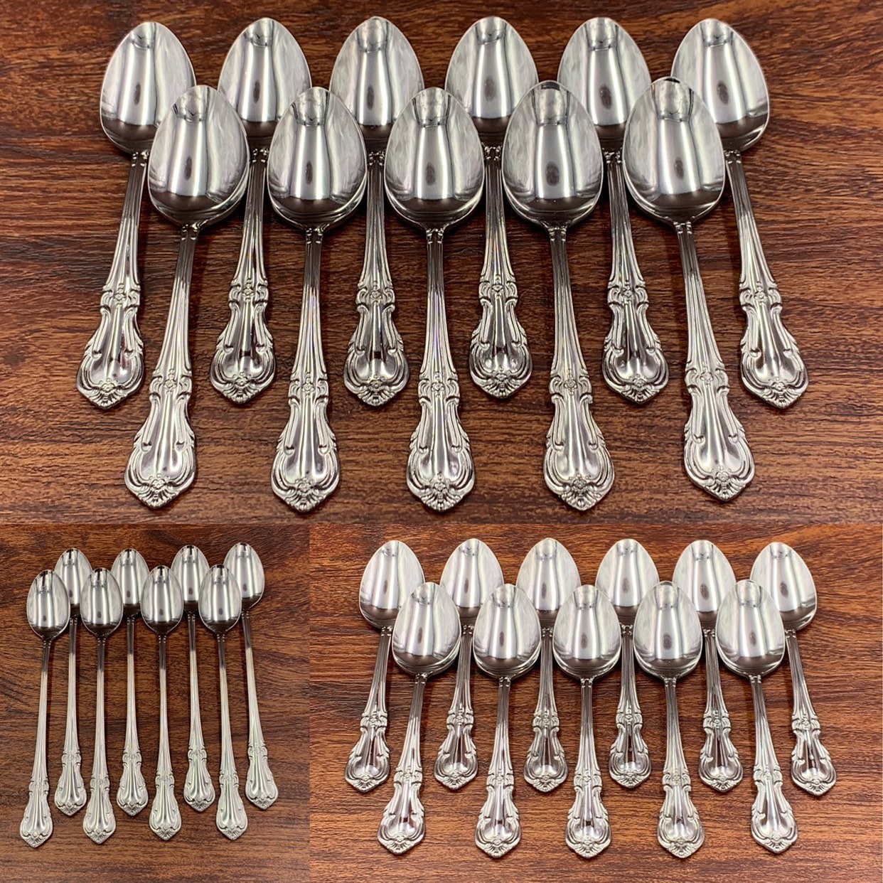 This is a Vintage complete set of High Quality Stainless Flatware in a pattern called Victoria. This lovely flatware has a glossy finish on a ornamental Floral and scroll tip stainless steel handle. The Victoria Pattern is elegant, yet easy to care for in high quality Stainless Steel. The original silverware chest is lined in red silver cloth. It has a walnut finish.
