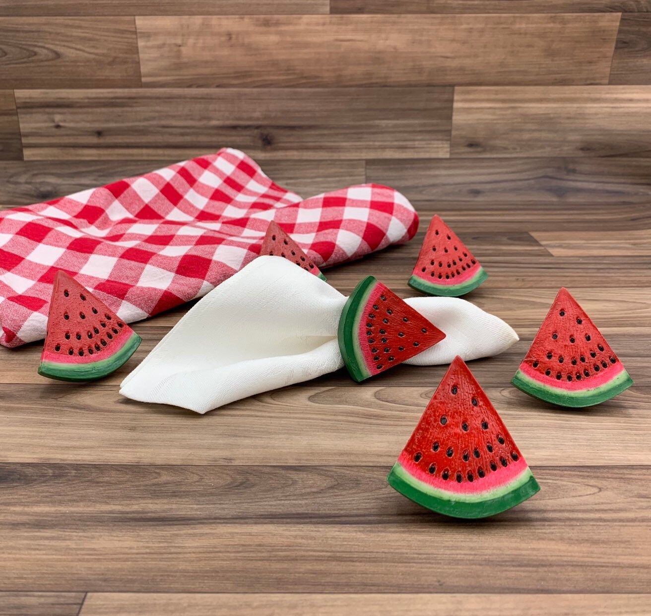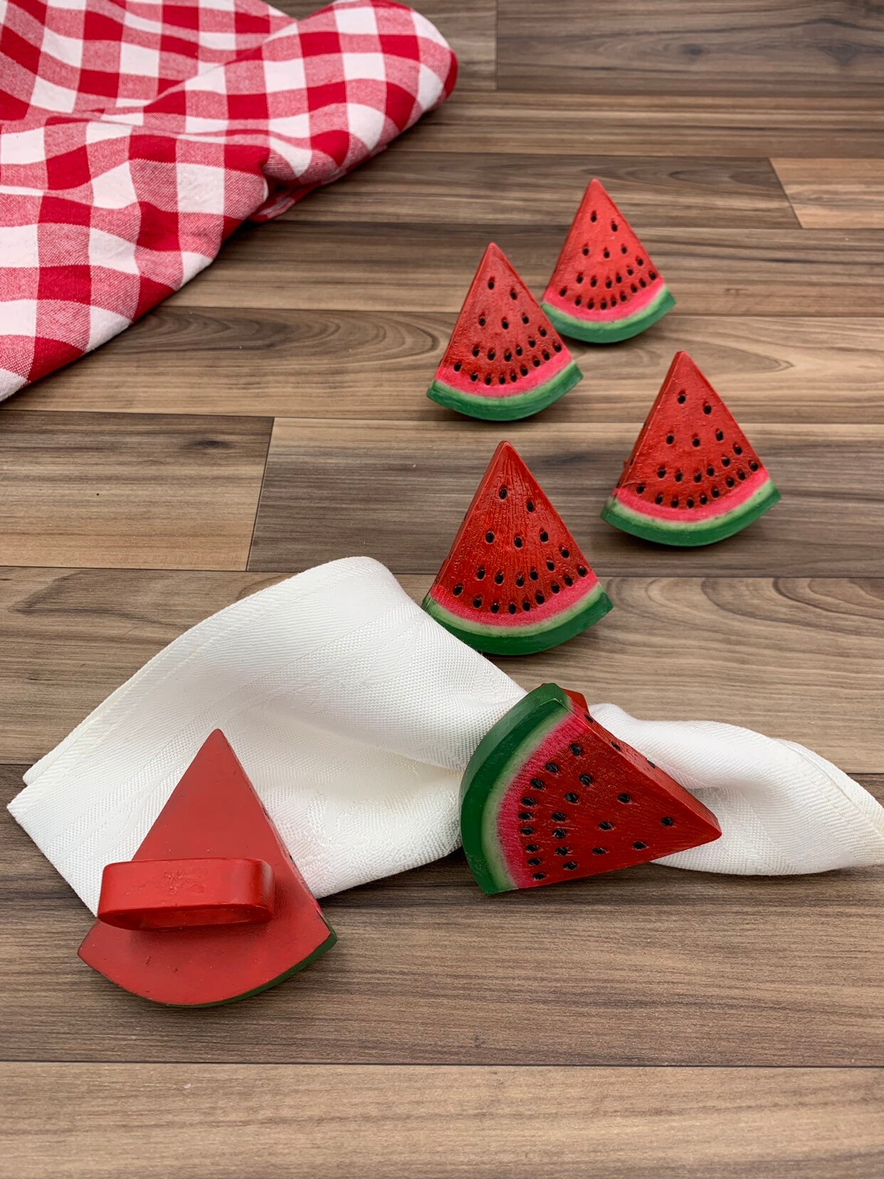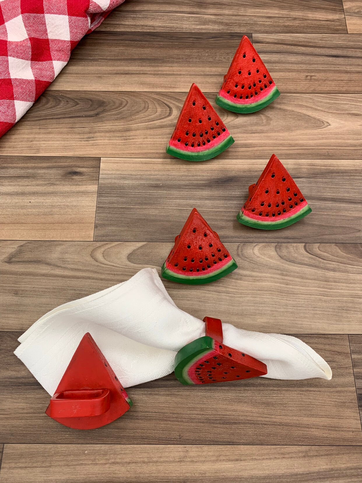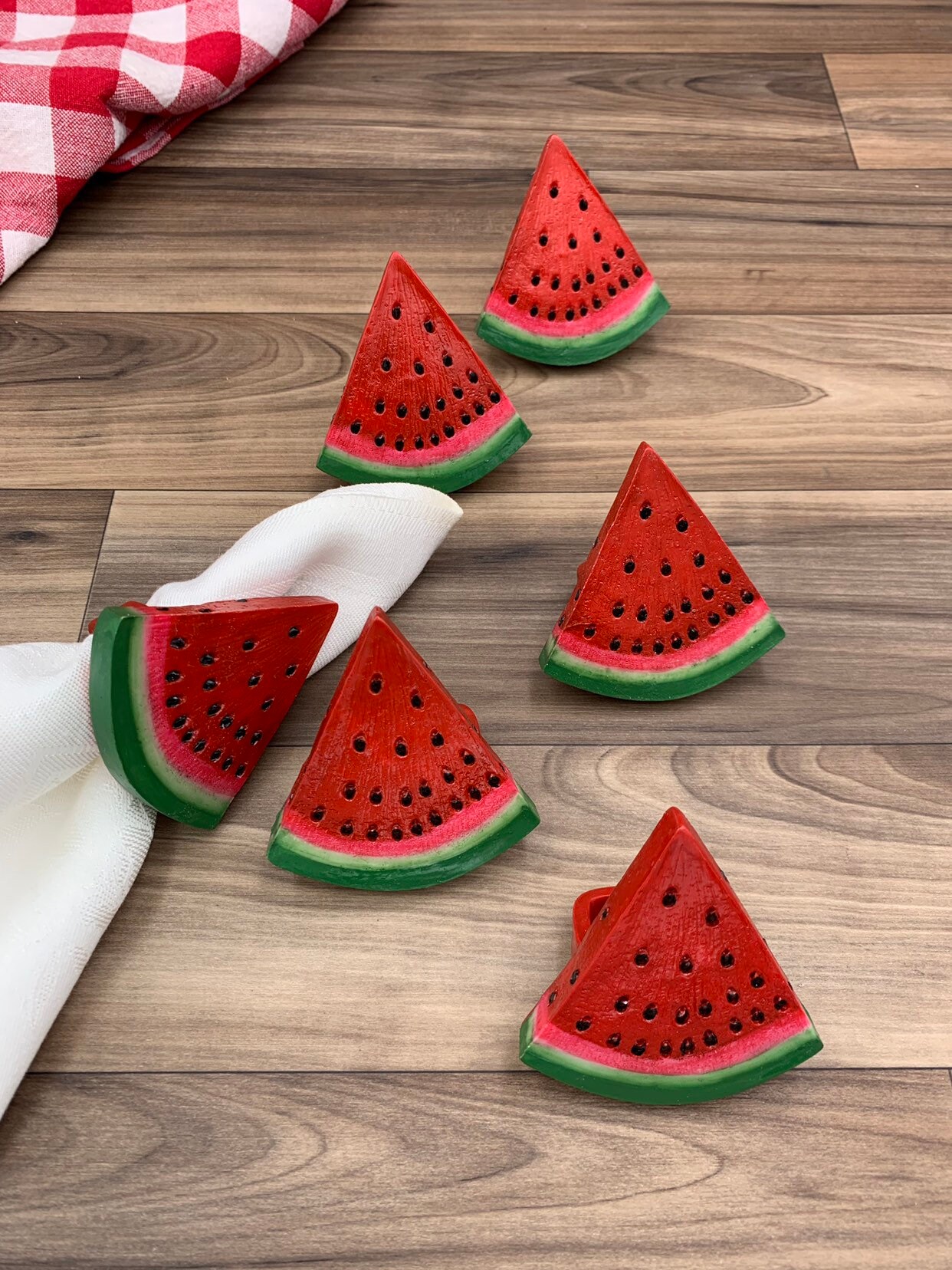 This is a cute set of six napkin rings in the shape of watermelon slices. These napkin rings are painted a vibrant red and green with black seeds. They would be perfect for an outdoor picnic or summer table decor.