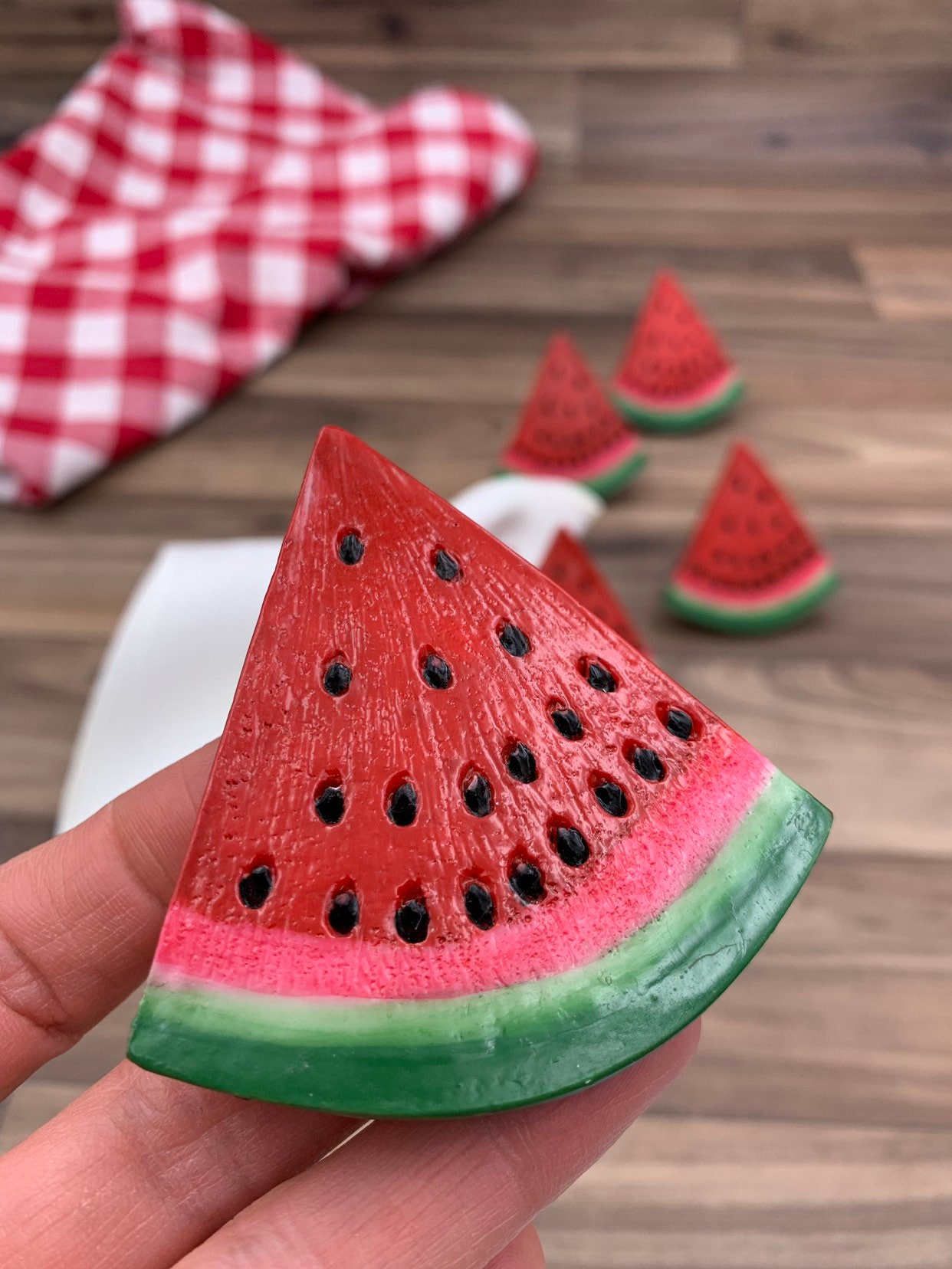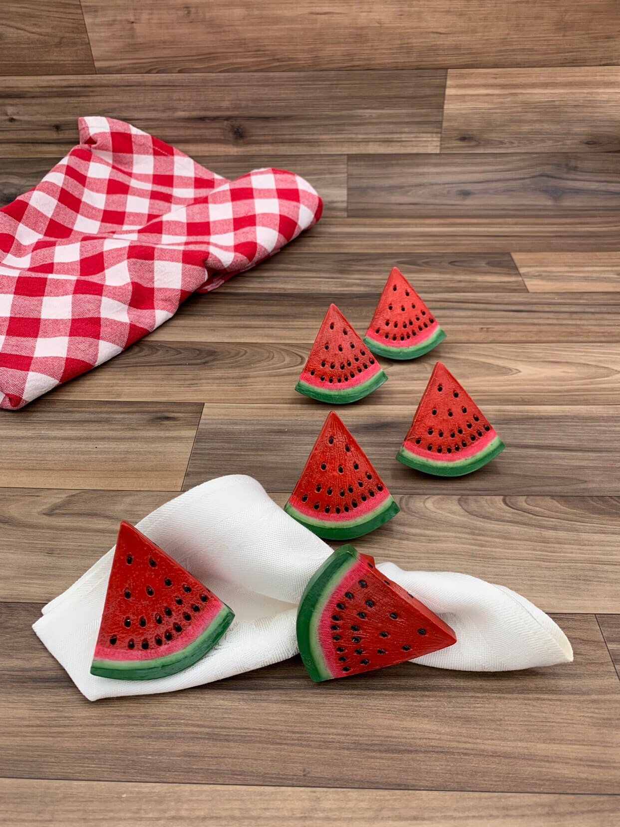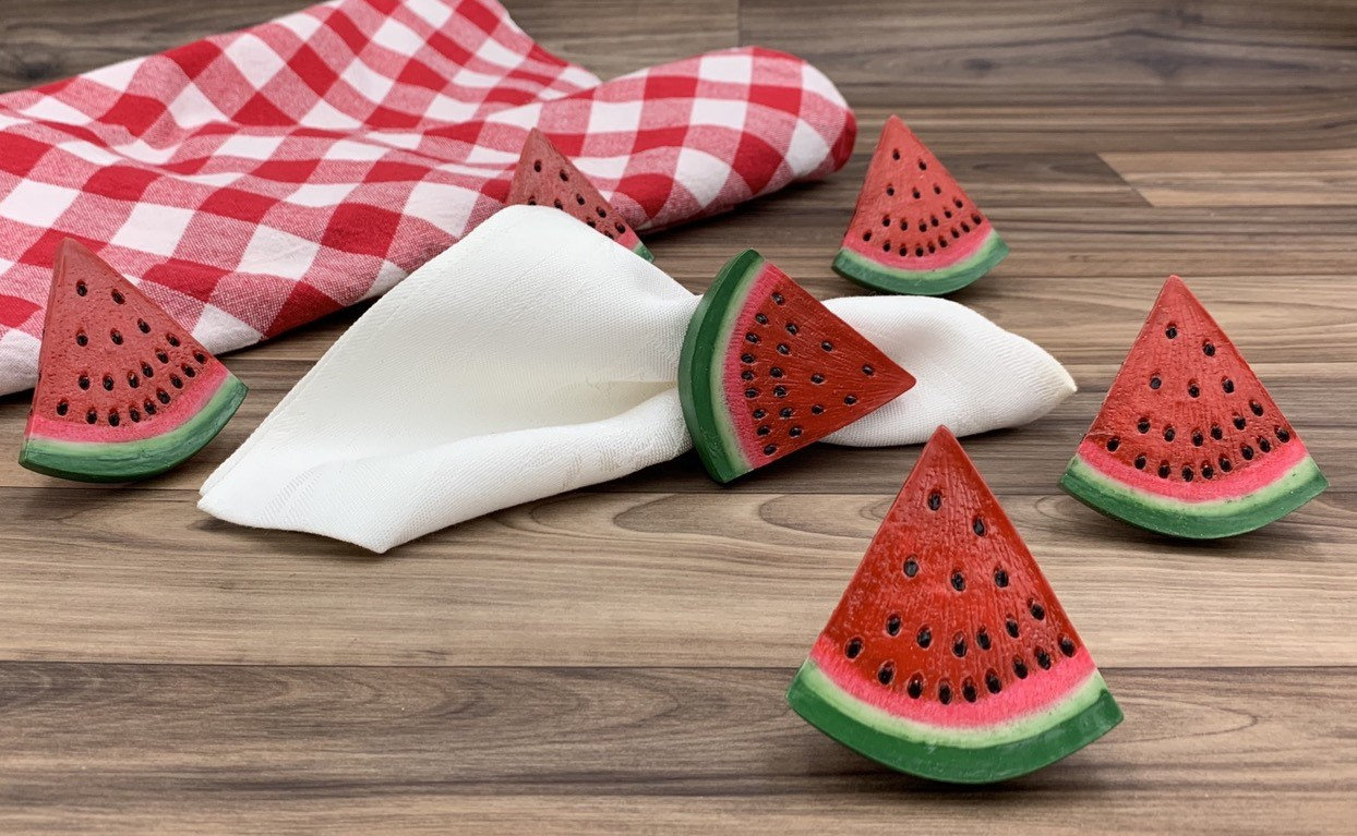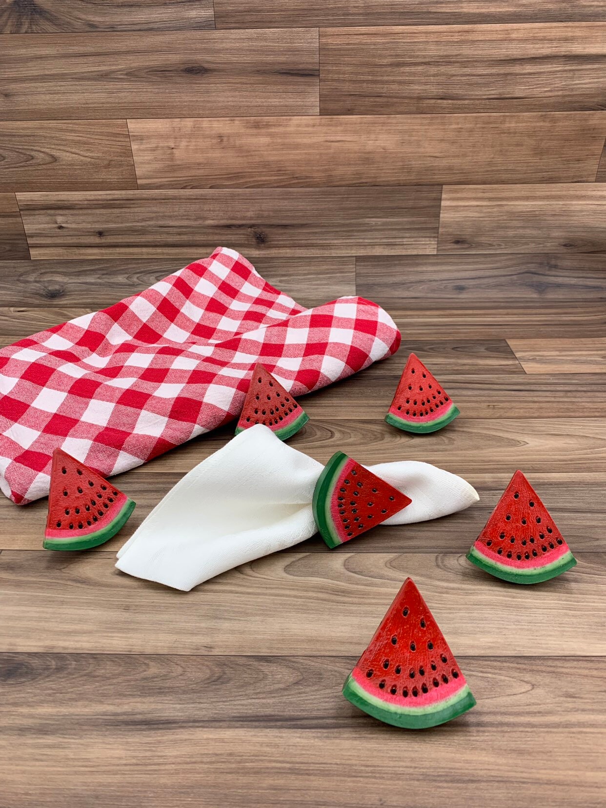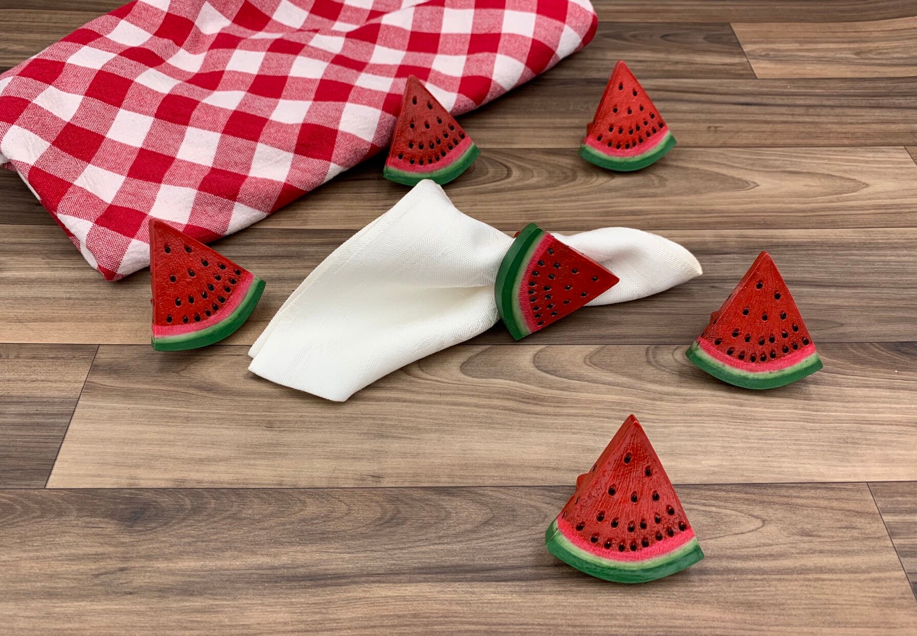 This is a cute set of six napkin rings in the shape of watermelon slices. These napkin rings are painted a vibrant red and green with black seeds. They would be perfect for an outdoor picnic or summer table decor.