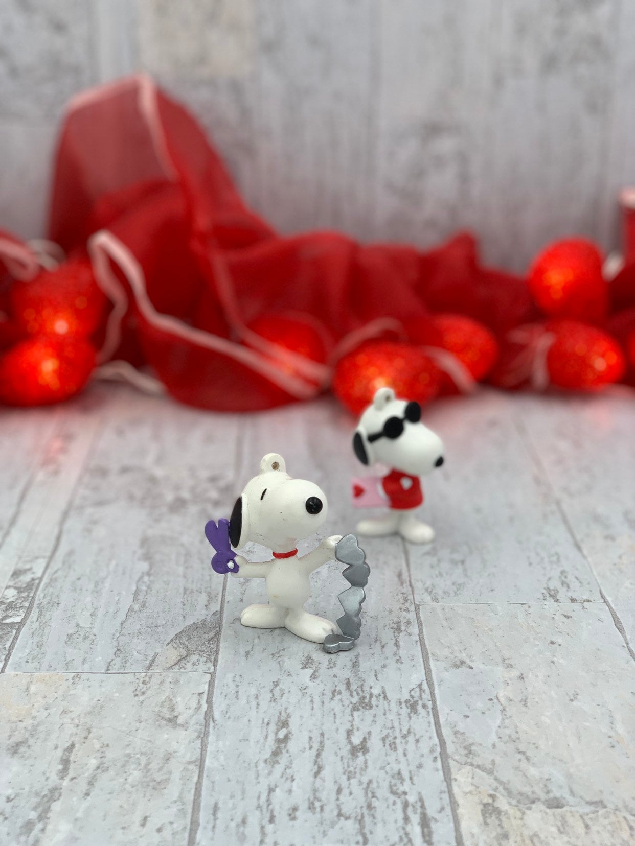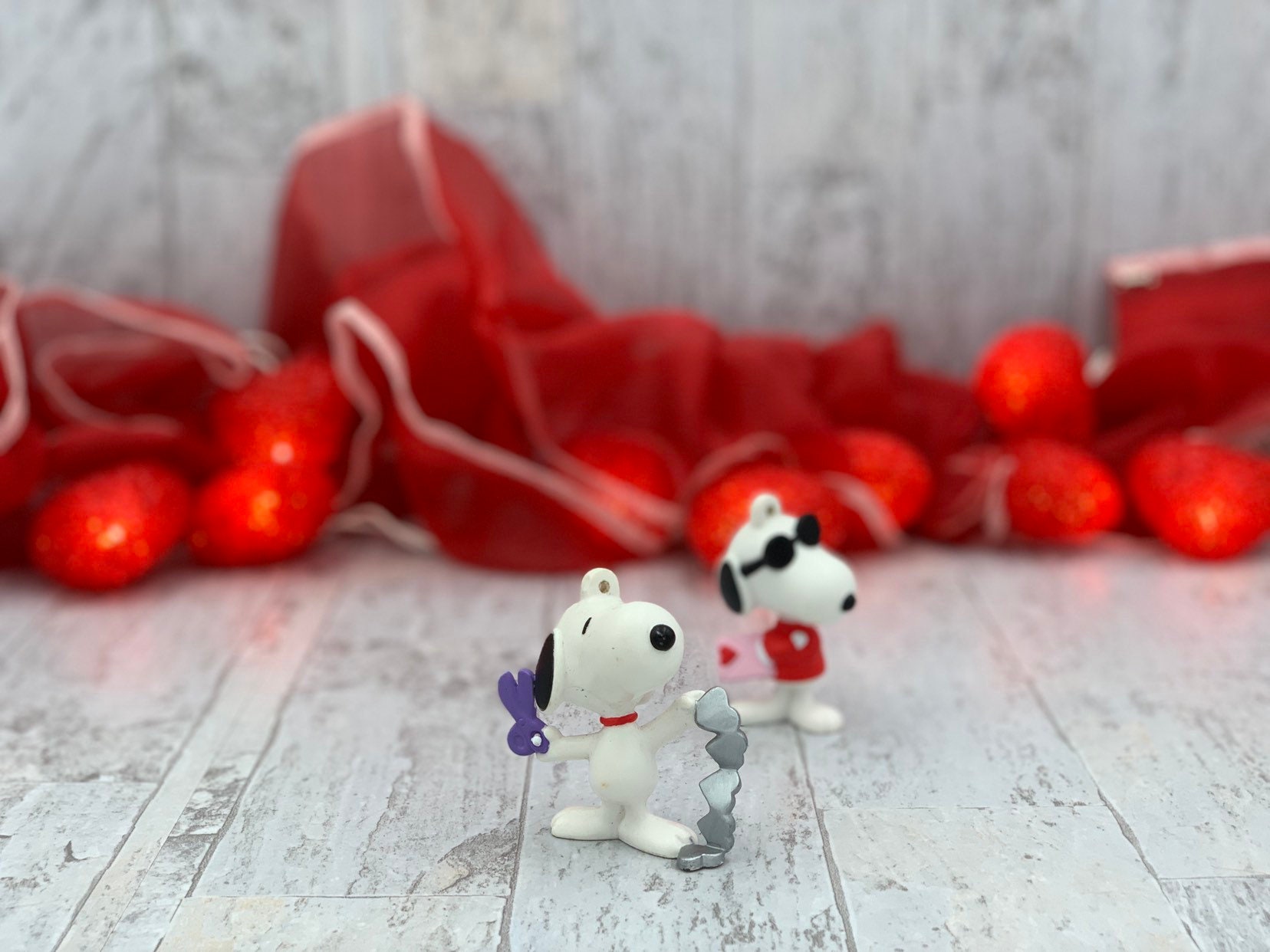 This is a pair of Vintage Snoopy Valentine Ornaments. These cute ornaments have Snoopy getting ready for Valentine’s Day. He is cutting out hearts in one pose and wearing shades with a valentine card in the other.
