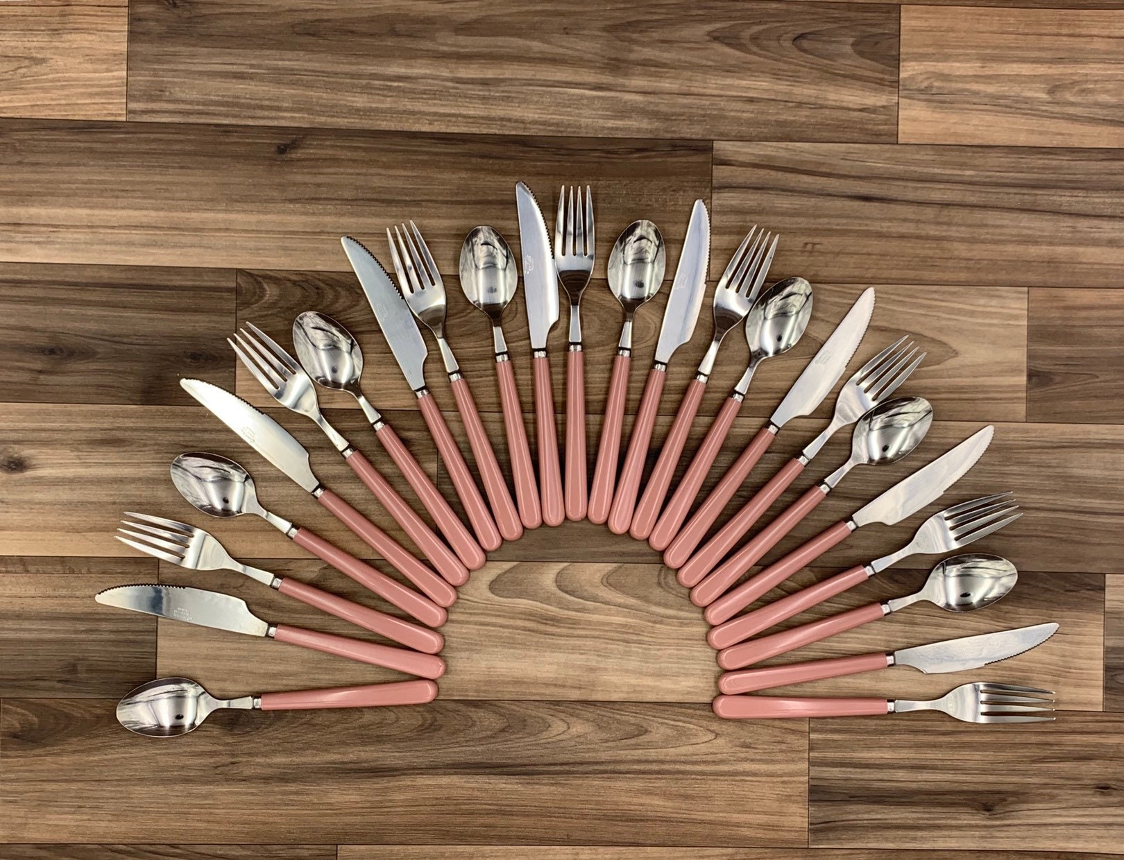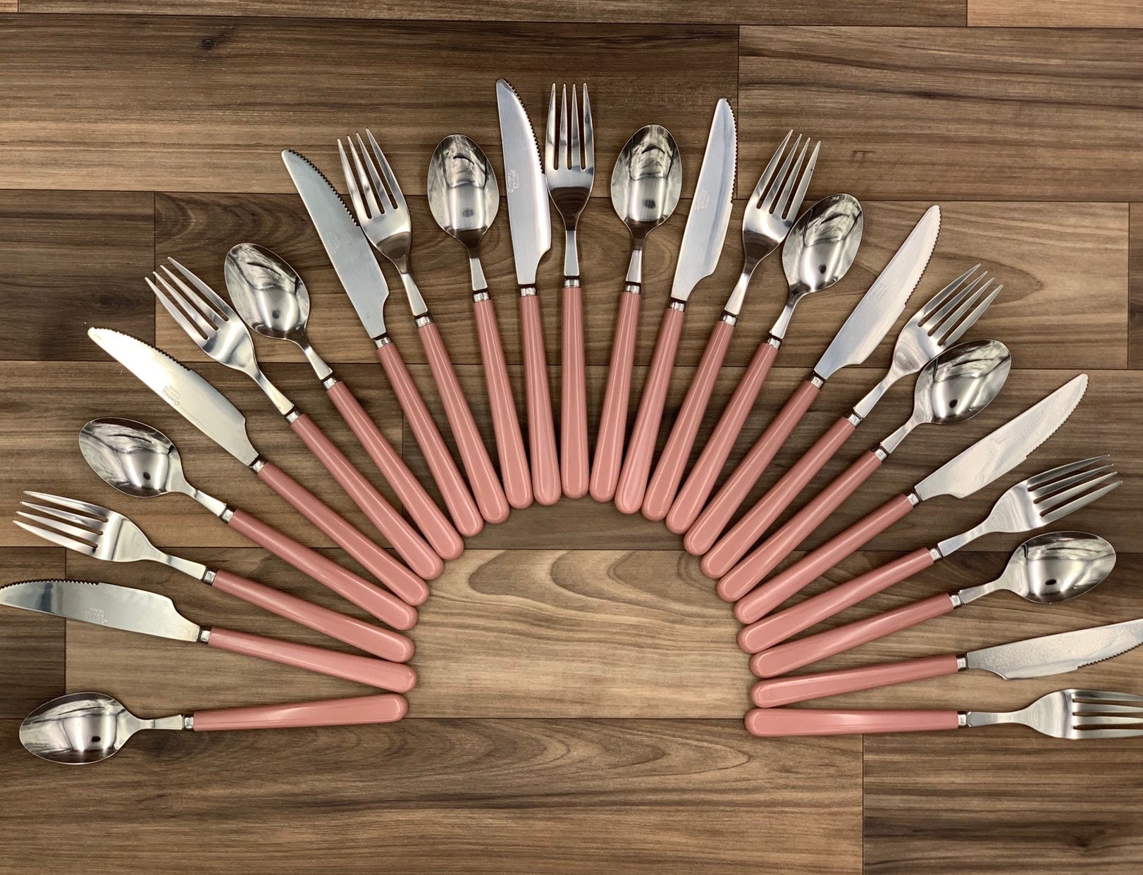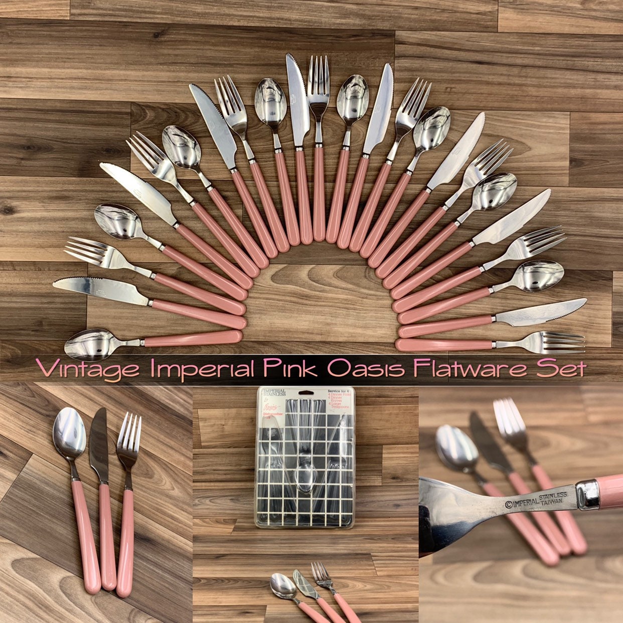 This is a New Vintage Set of Stainless flatware with Pink/Mauve colored Vinyl Handles. made by the Imperial Flatware Co. it is from the Oasis line.