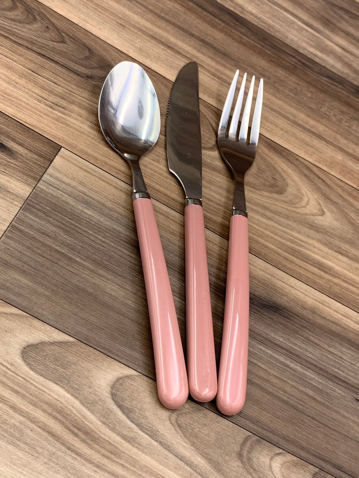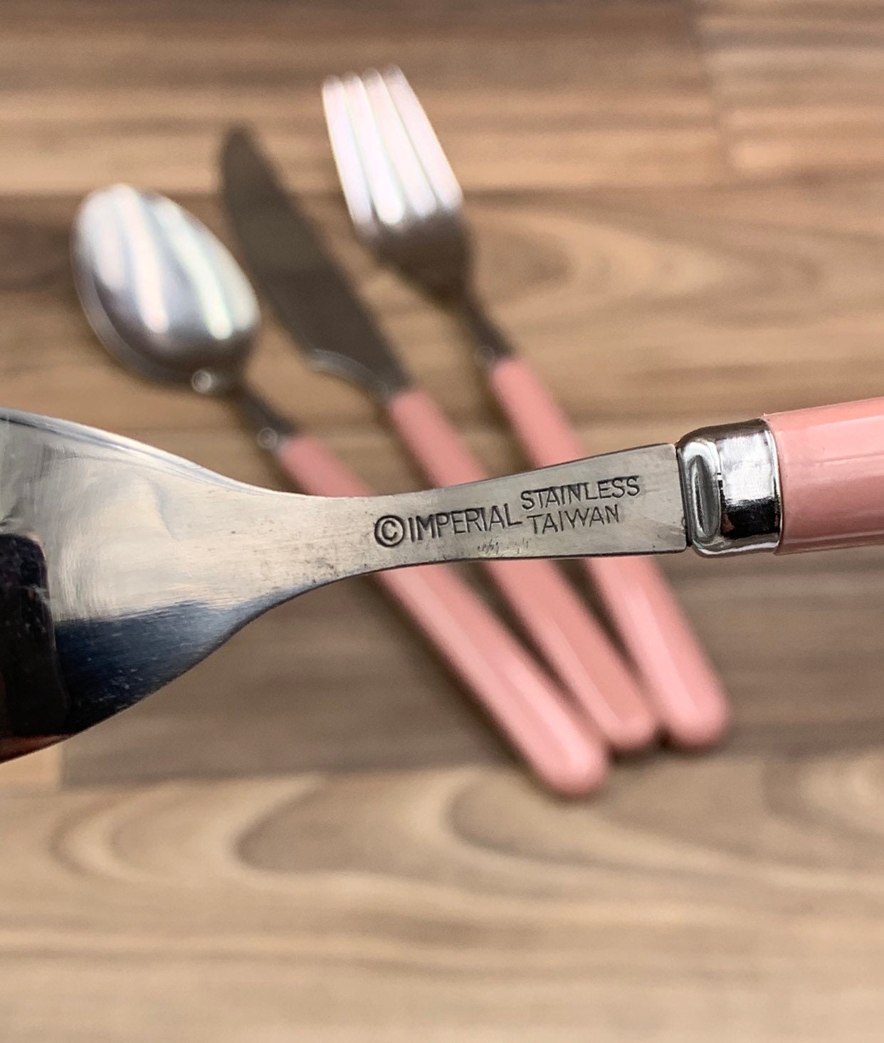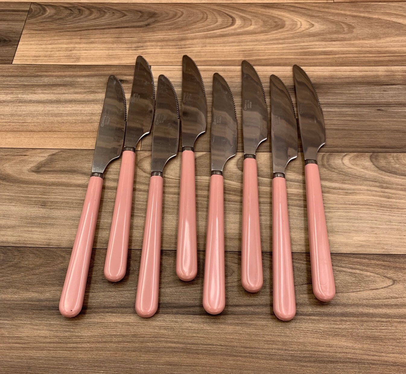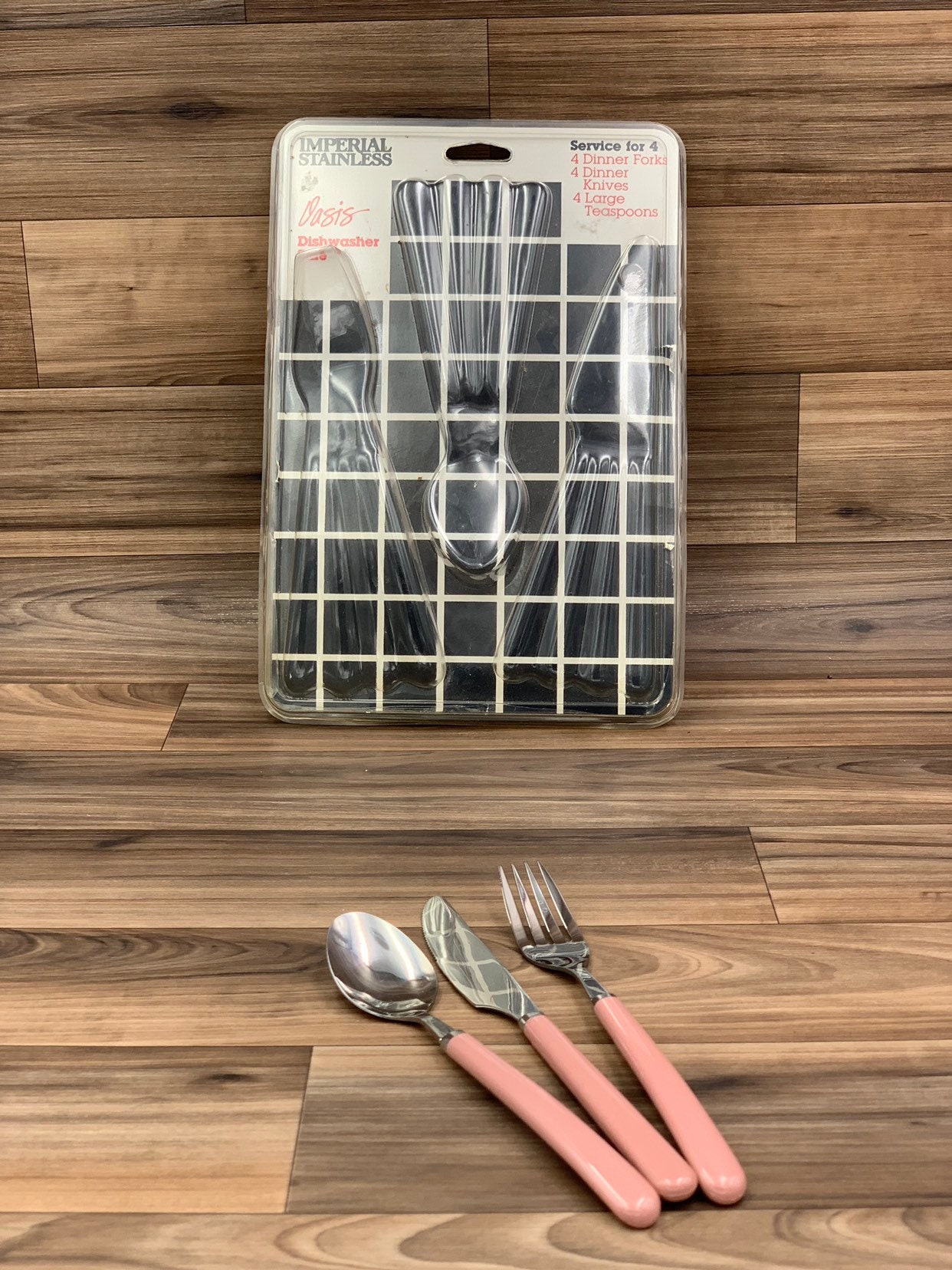This is a New Vintage Set of Stainless flatware with Pink/Mauve colored Vinyl Handles. made by the Imperial Flatware Co. it is from the Oasis line.