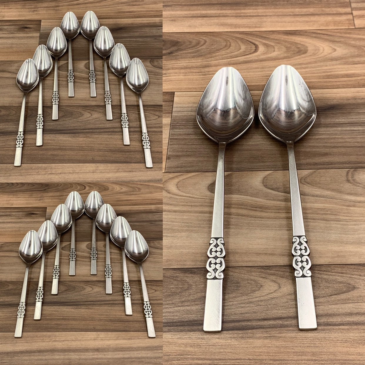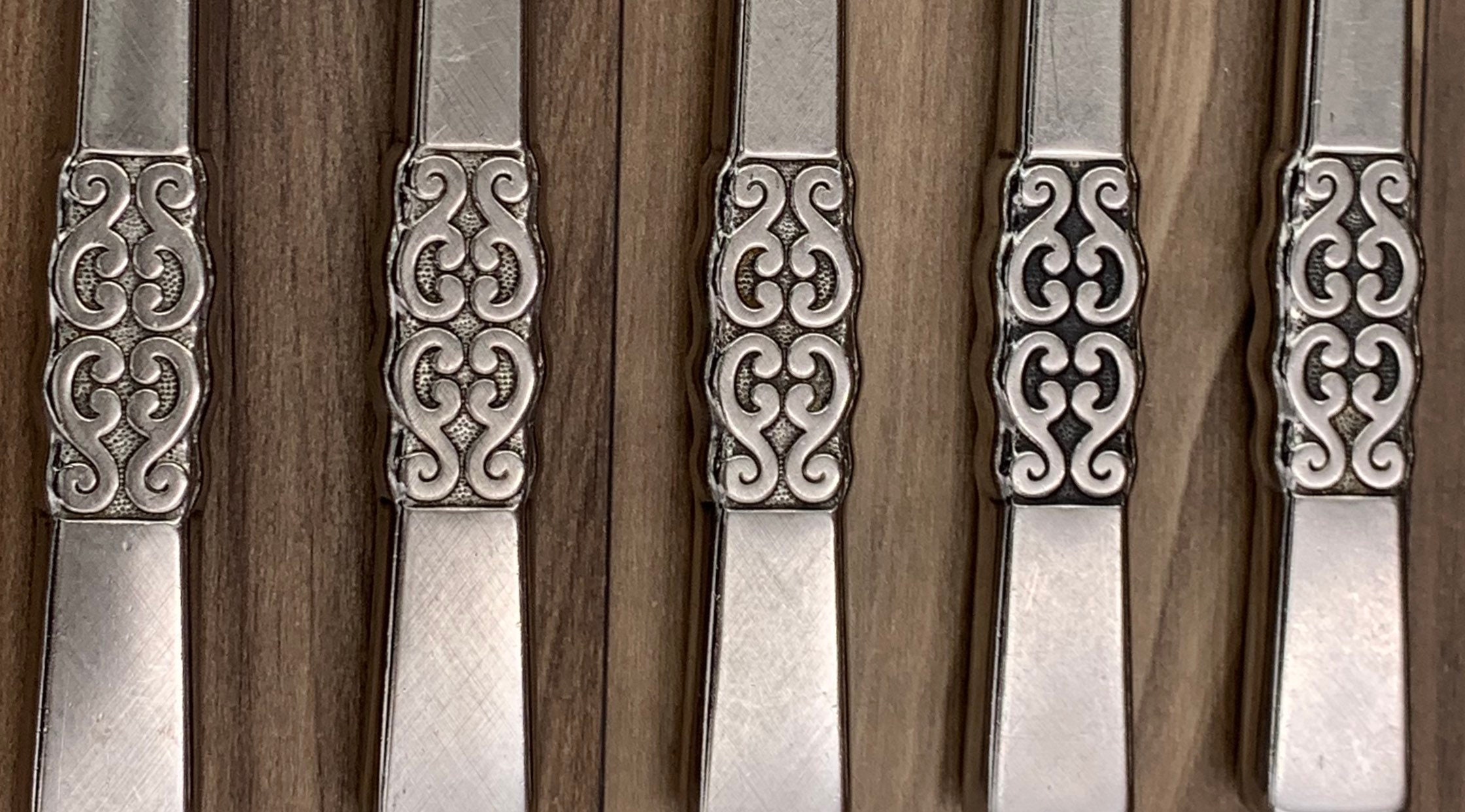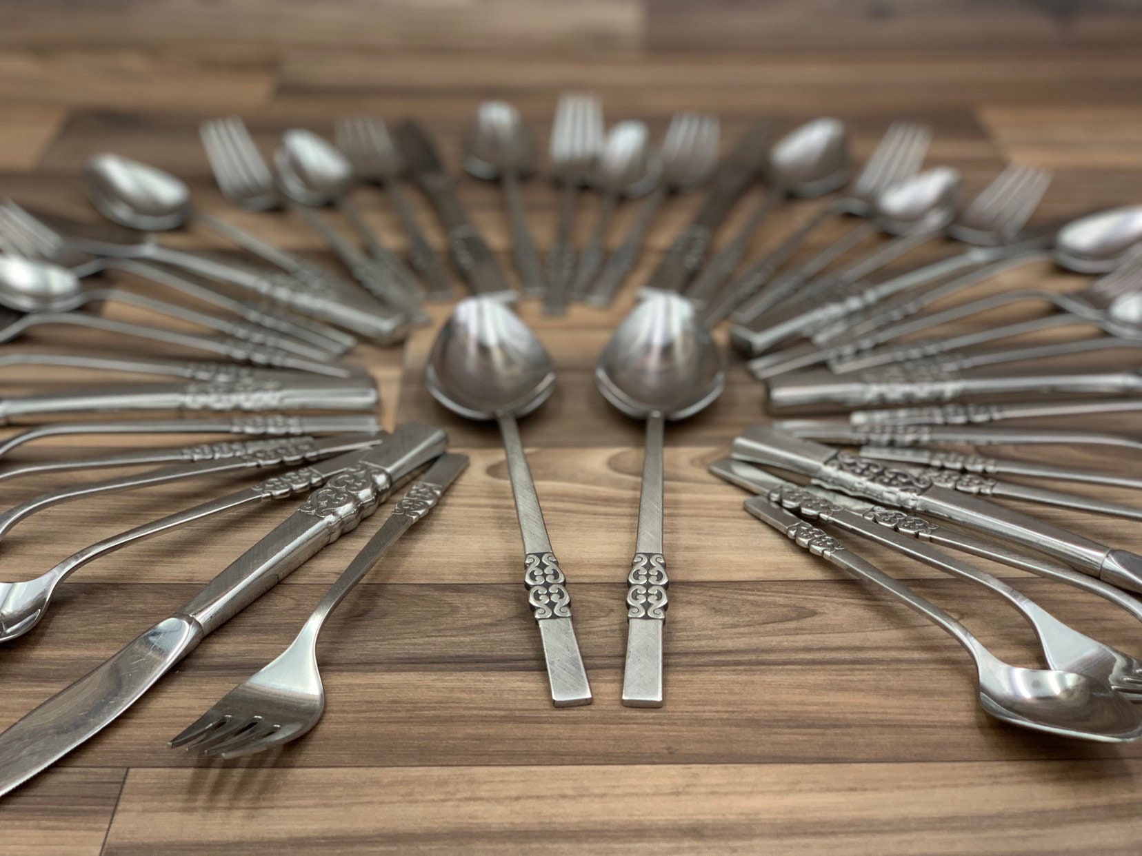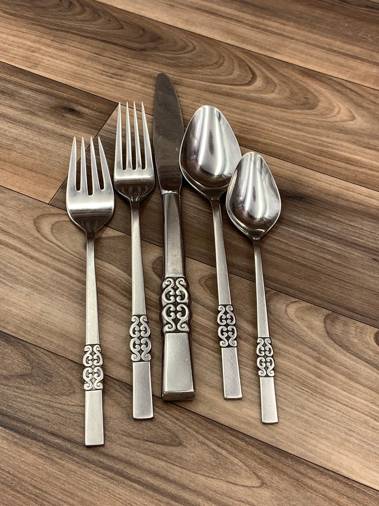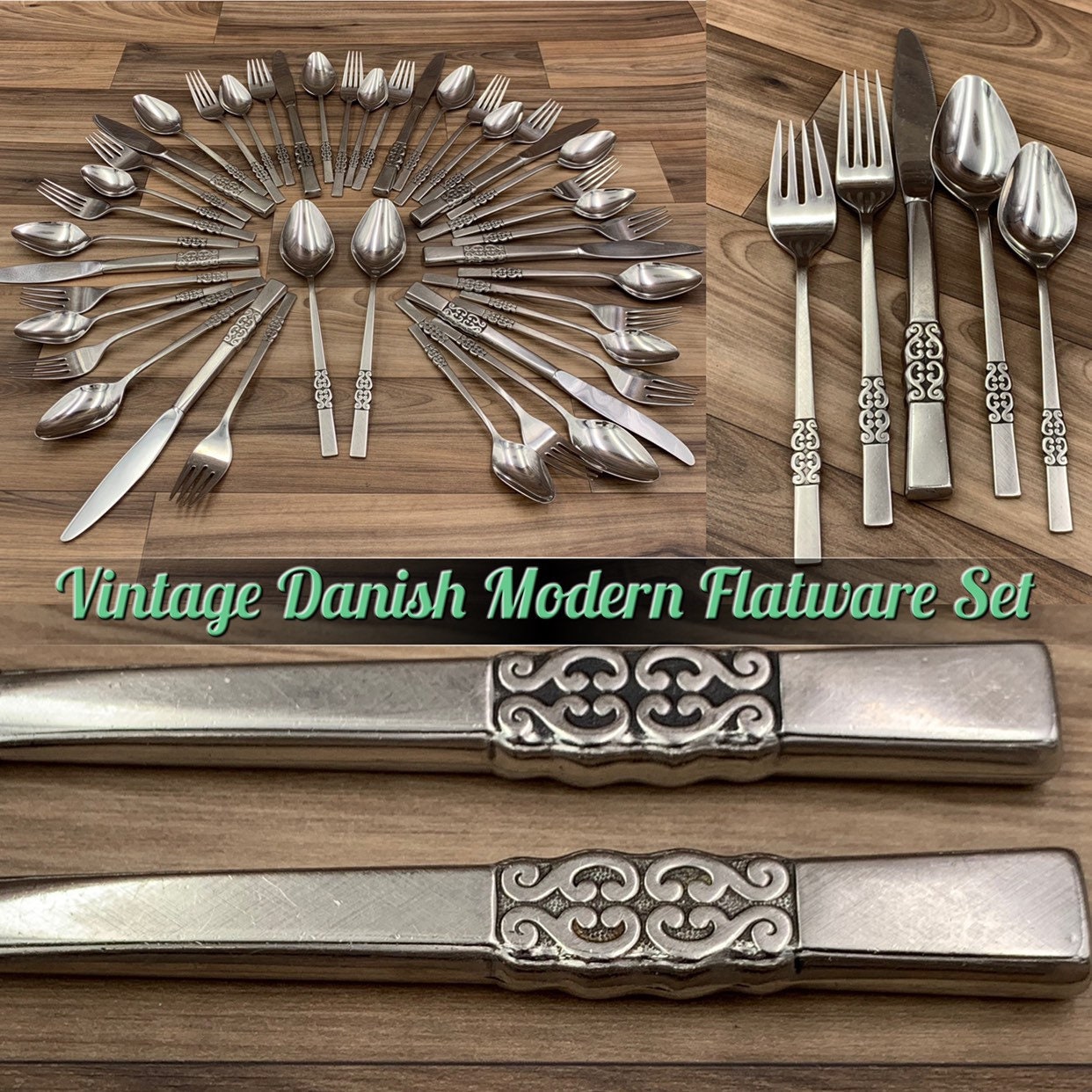 This is a Vintage set of Danish Modern style Stainless Flatware in a pattern called Danish scroll. This Gorgeous flatware has a sleek satin finish with a ornamental Danish scroll on the stainless steel handle.