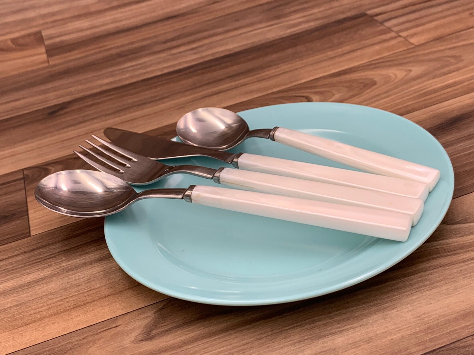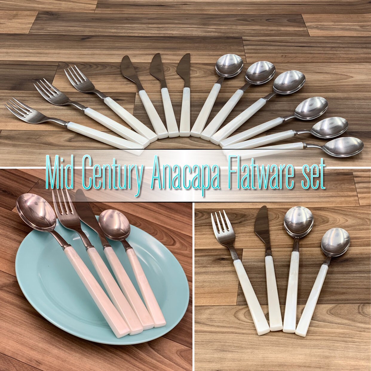 This is Small Set of Vintage Anacapa Stainless Flatware with White plastic Handles. Made by Anapaca. The white handles have a square shape with a pearlized appearance.