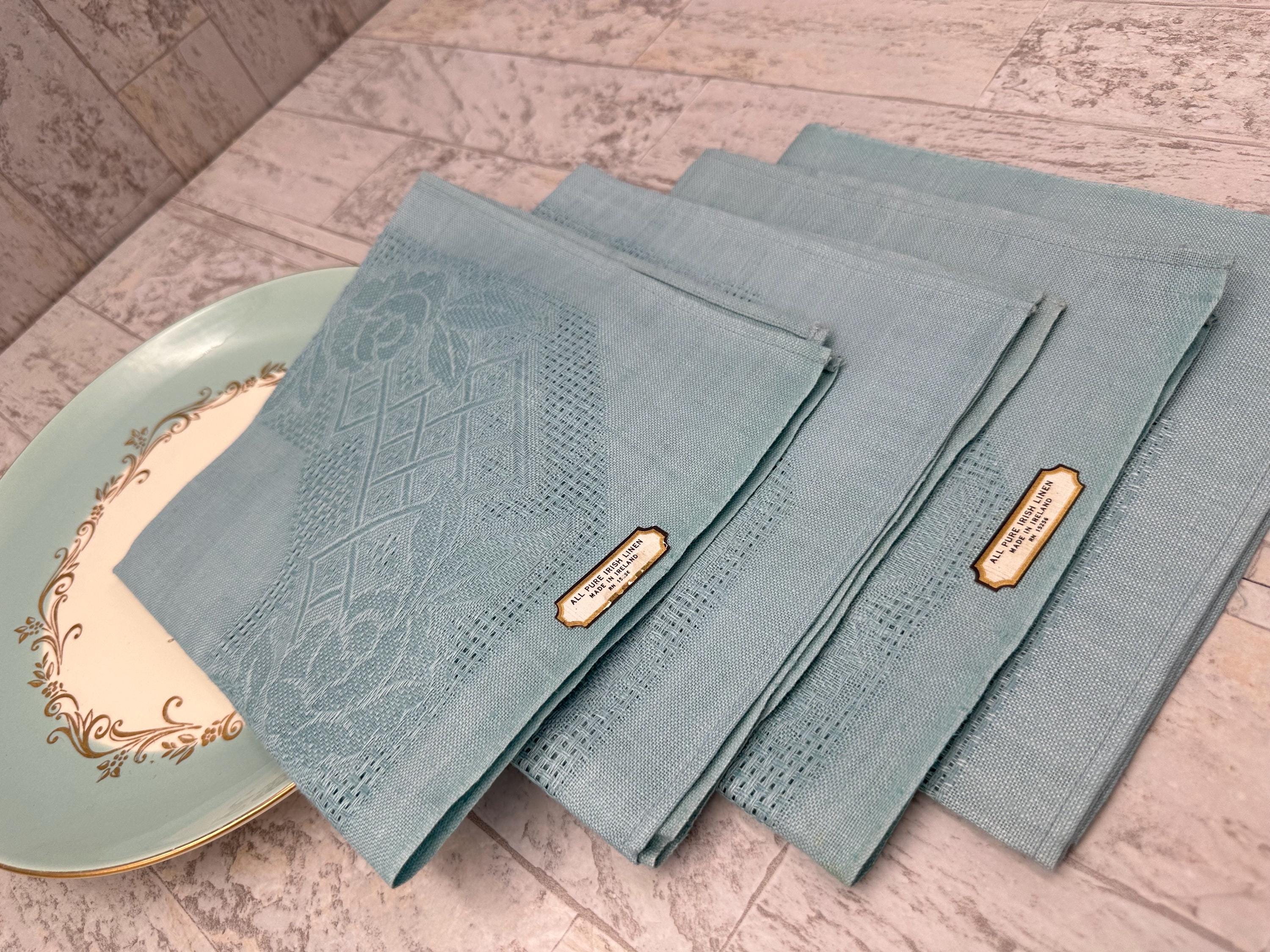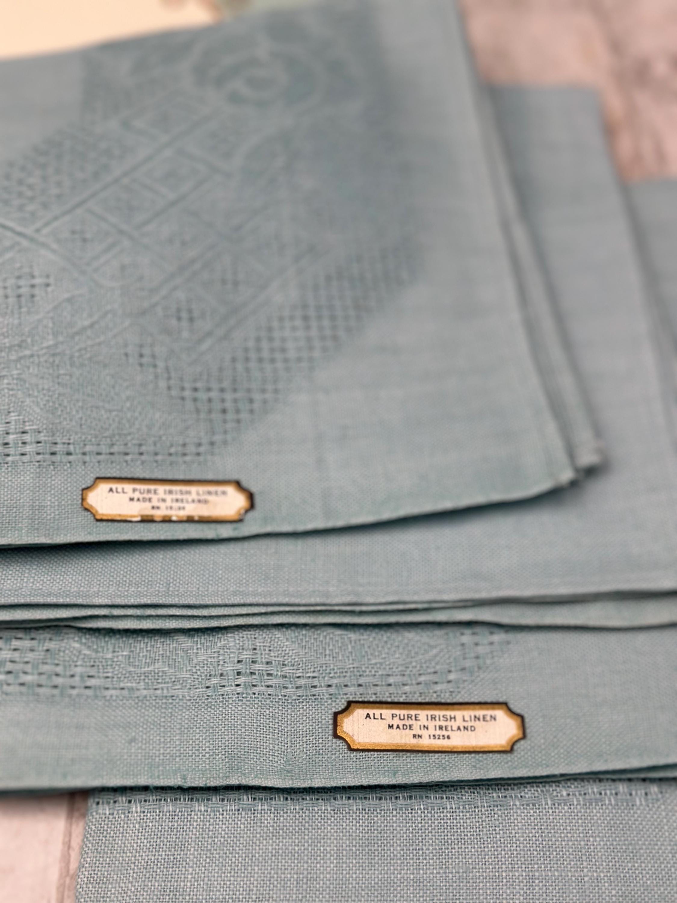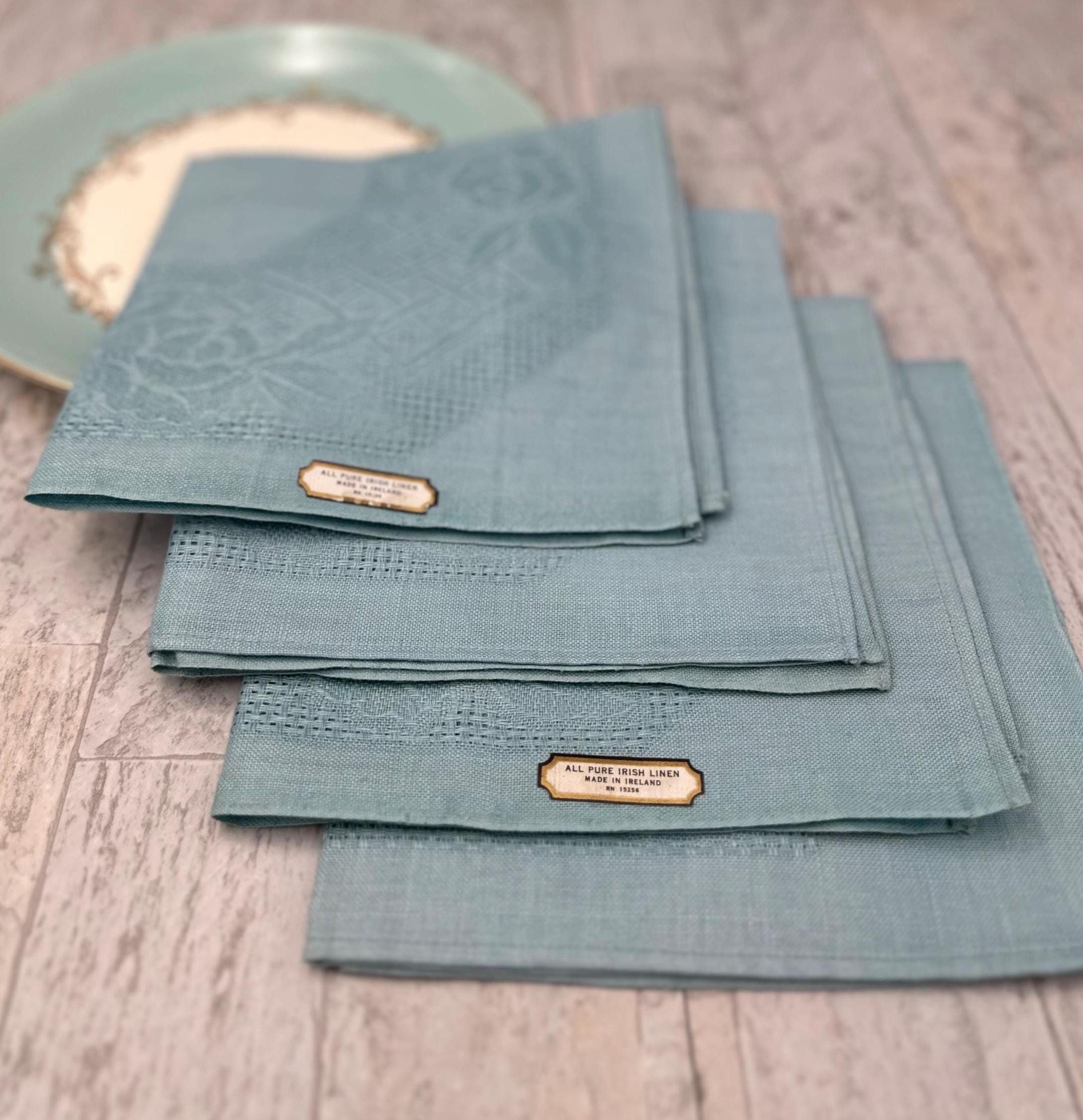 This is a gorgeous set of Vintage pure Irish linen cloth napkins. Perfect for use at a dinner party. These napkins are new and some still have the original tag. This set consists of 4 Dinner sized napkins in a beautiful robin’s egg blue.