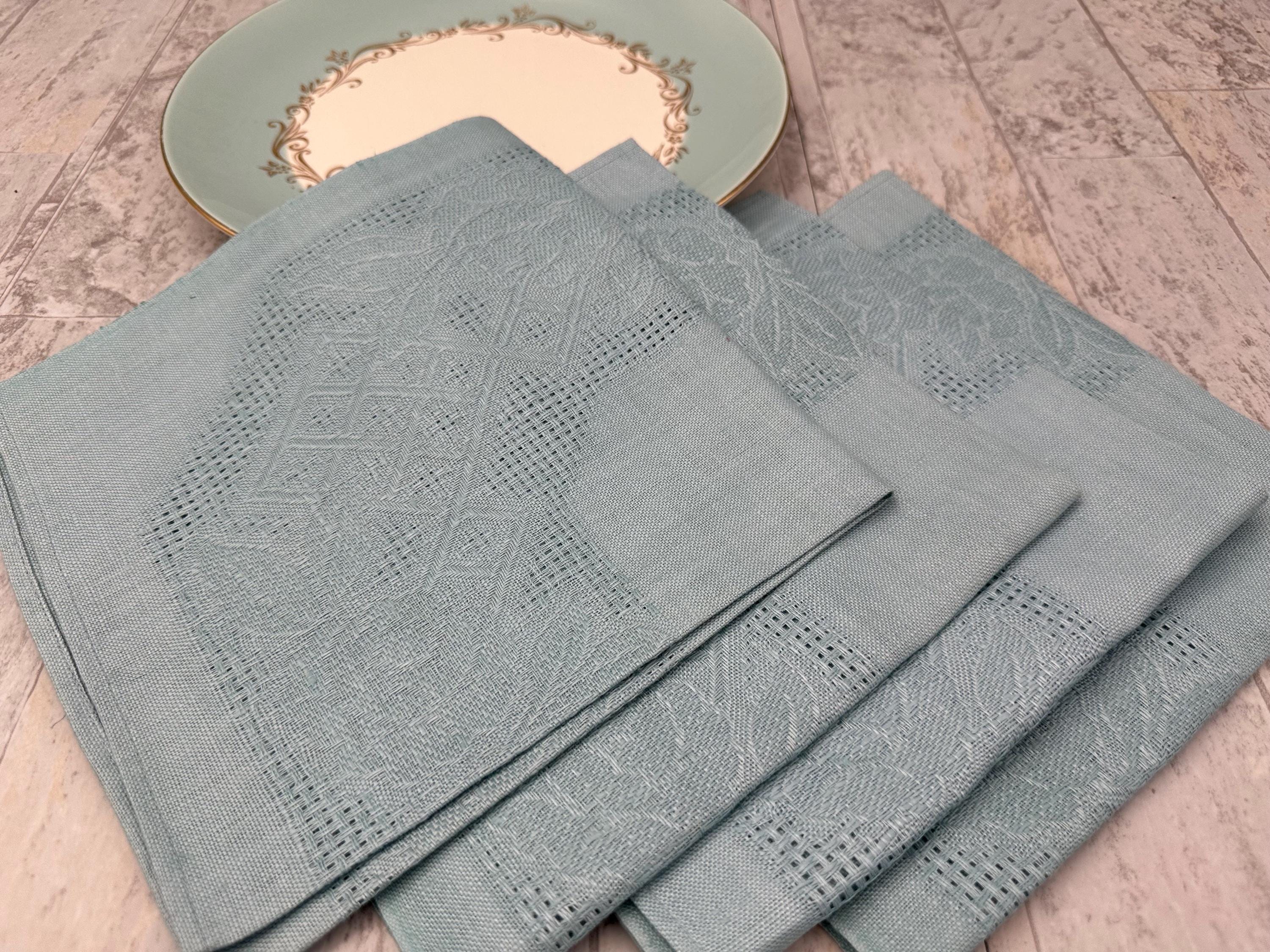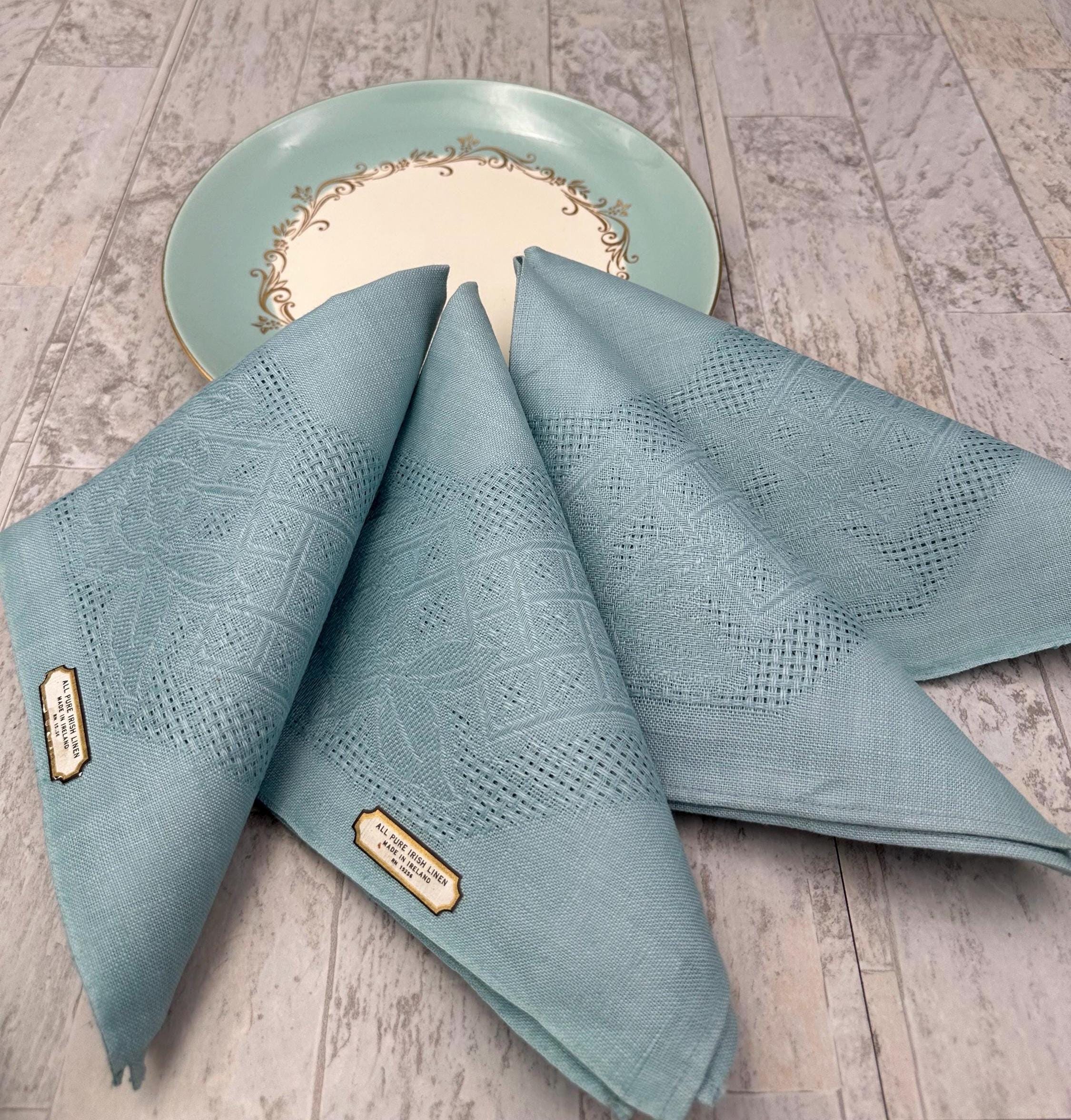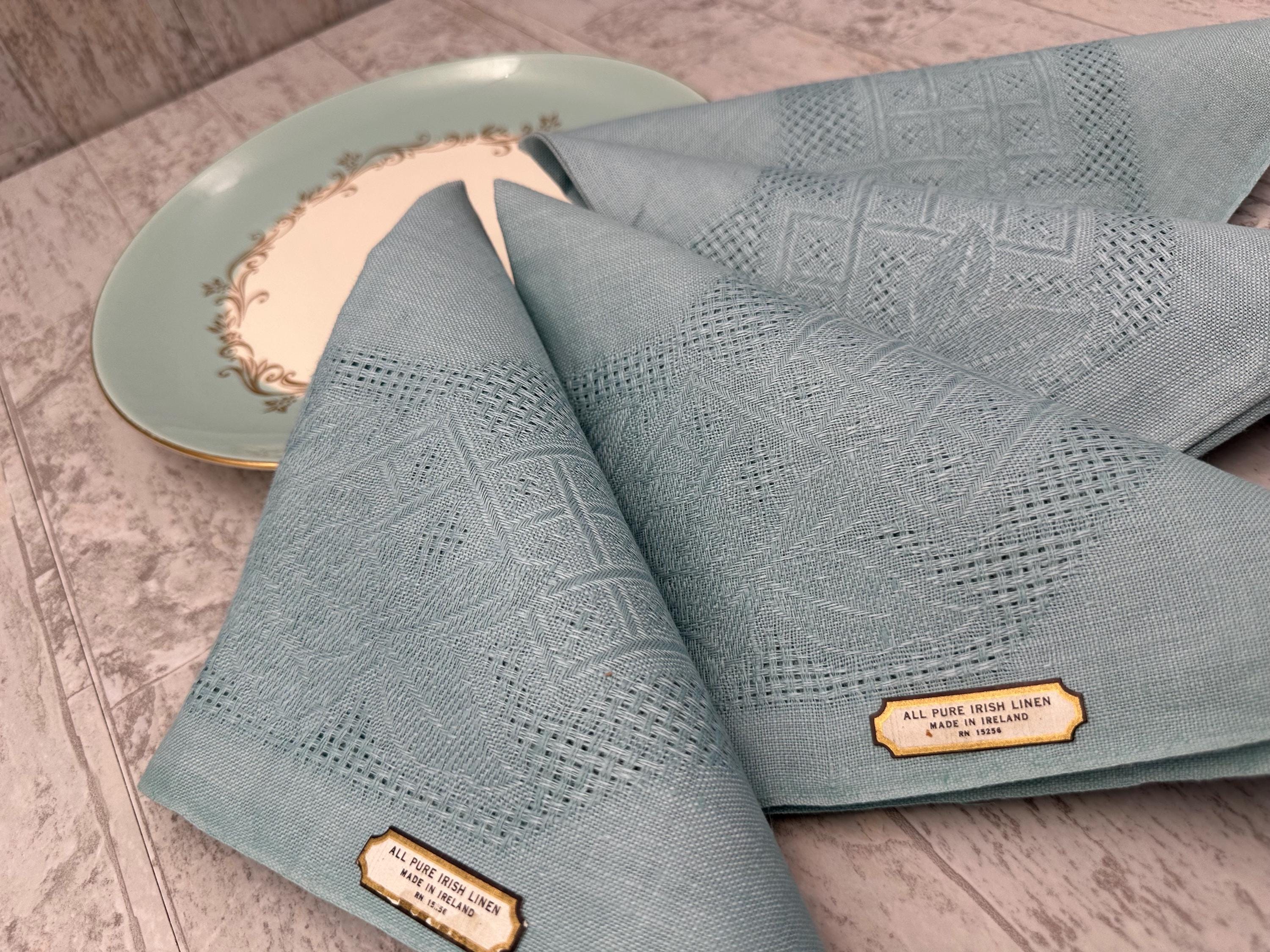 This is a gorgeous set of Vintage pure Irish linen cloth napkins. Perfect for use at a dinner party. These napkins are new and some still have the original tag. This set consists of 4 Dinner sized napkins in a beautiful robin’s egg blue.