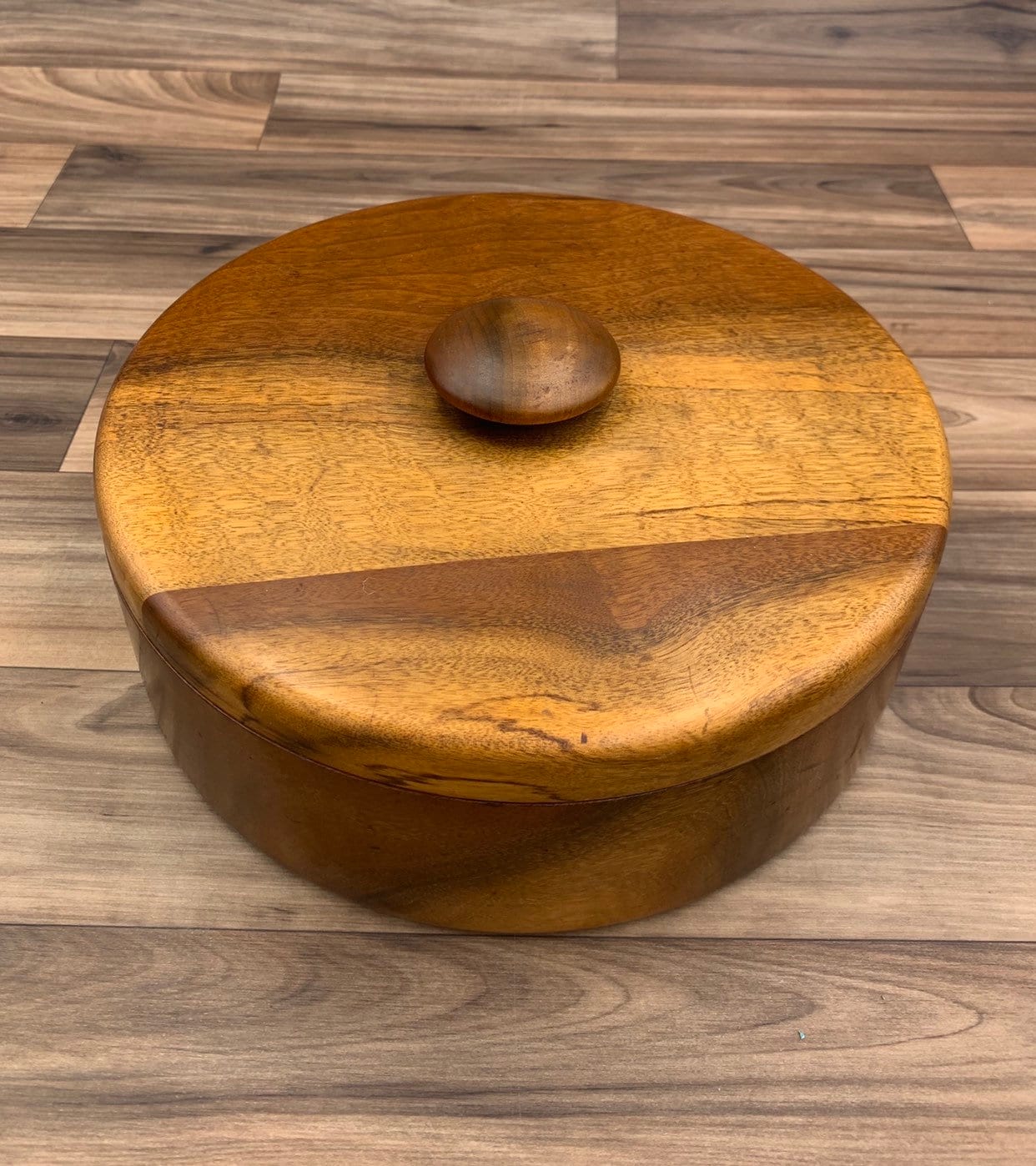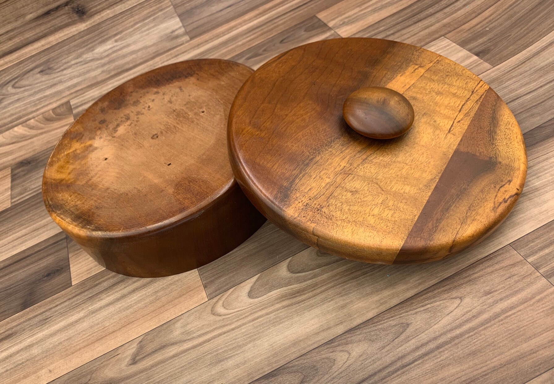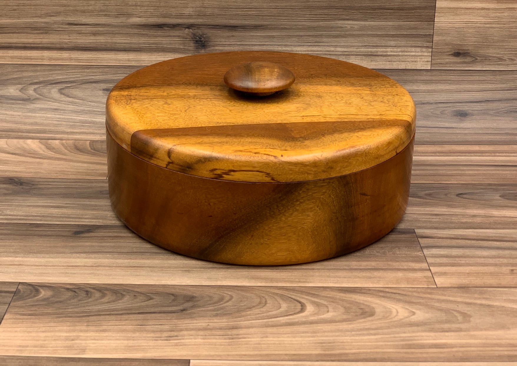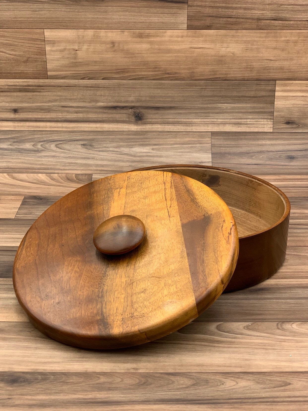 Vintage Handmade Round Wooden Storage Box with wooden knob. This is a wonderful old box with lots of history in its well constructed lines. With its firmly fitted lid, and softly rounded edges, this old box is wonderful work of art. It is sturdy and made of solid wood. I love the history its lovely aged patina suggests.