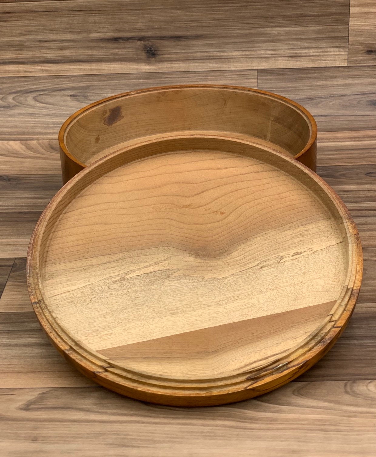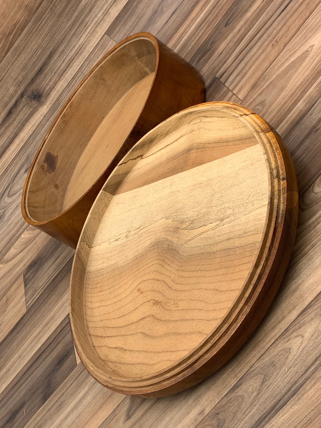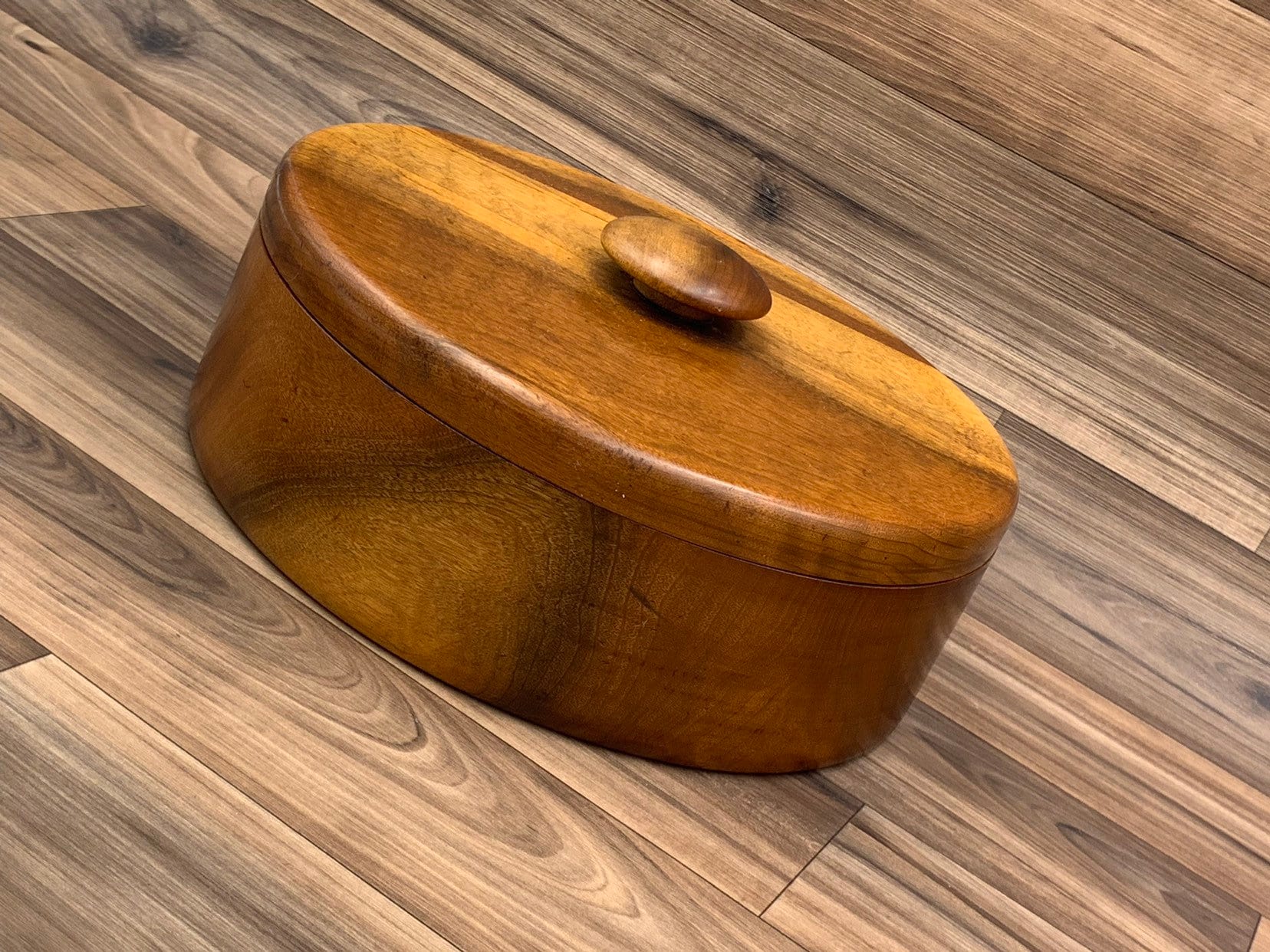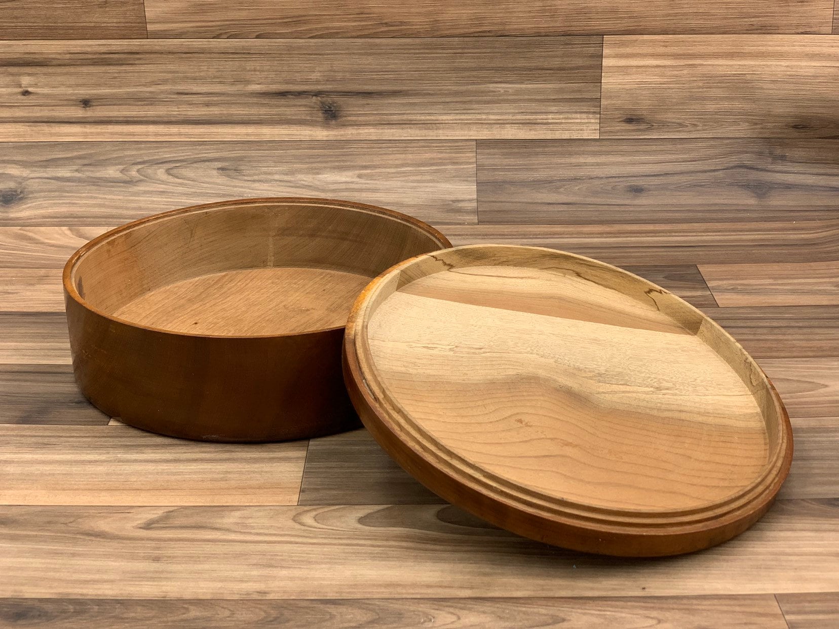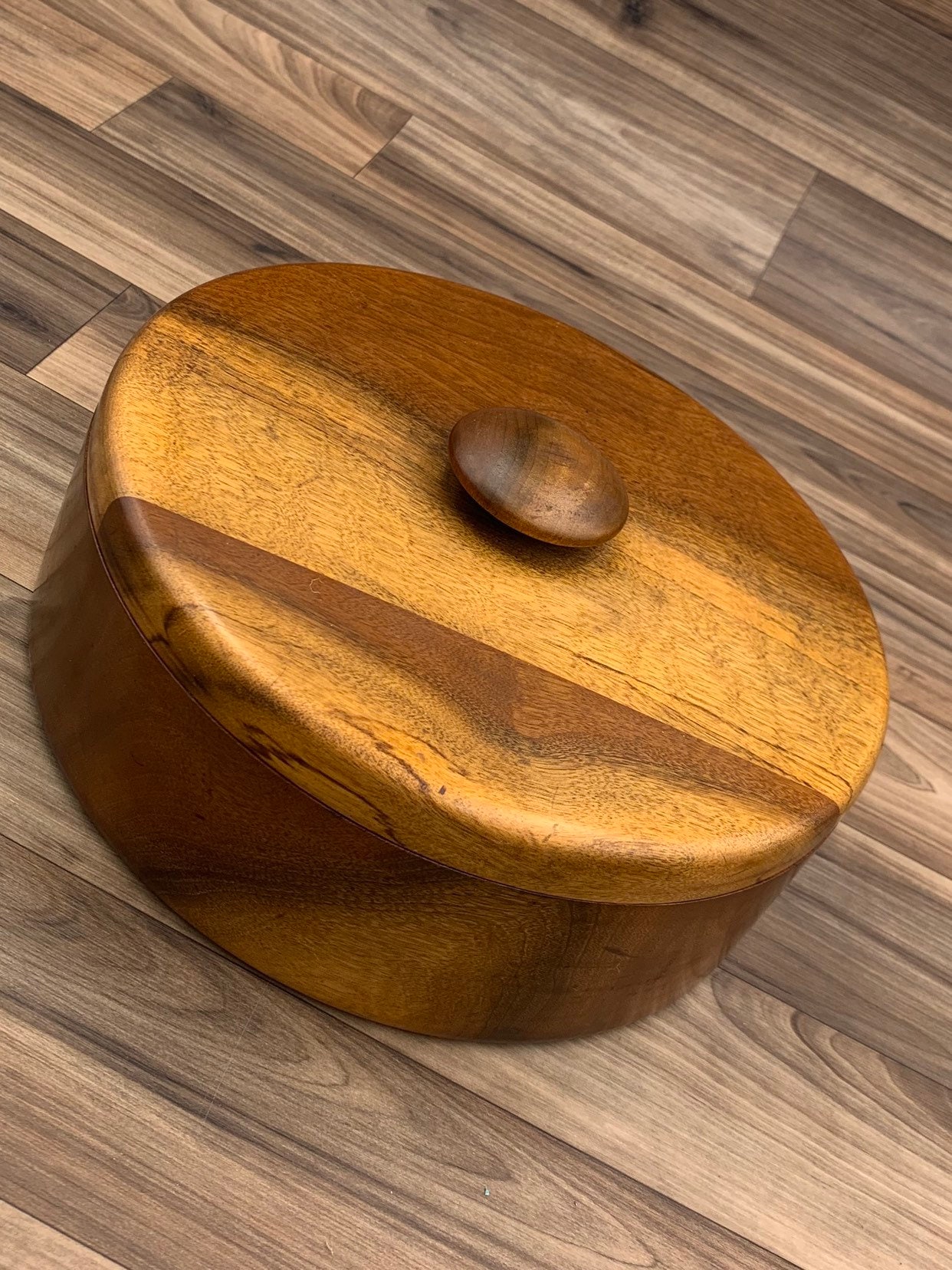 Vintage Handmade Round Wooden Storage Box with wooden knob. This is a wonderful old box with lots of history in its well constructed lines. With its firmly fitted lid, and softly rounded edges, this old box is wonderful work of art. It is sturdy and made of solid wood. I love the history its lovely aged patina suggests.