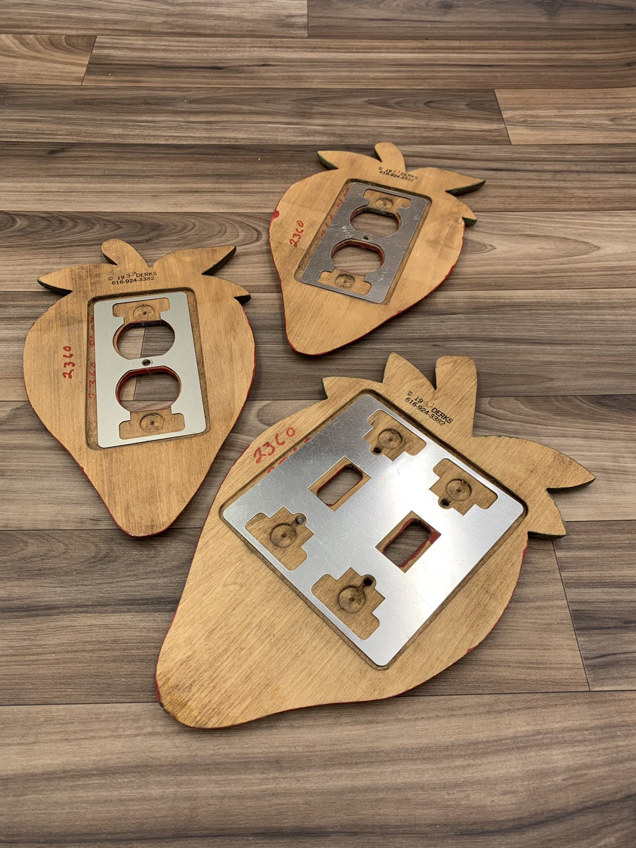 This is a set of Vintage handmade Strawberry shaped double switch plate cover and matching Outlet covers. They are handmade of wood and hand painted in Red and green .