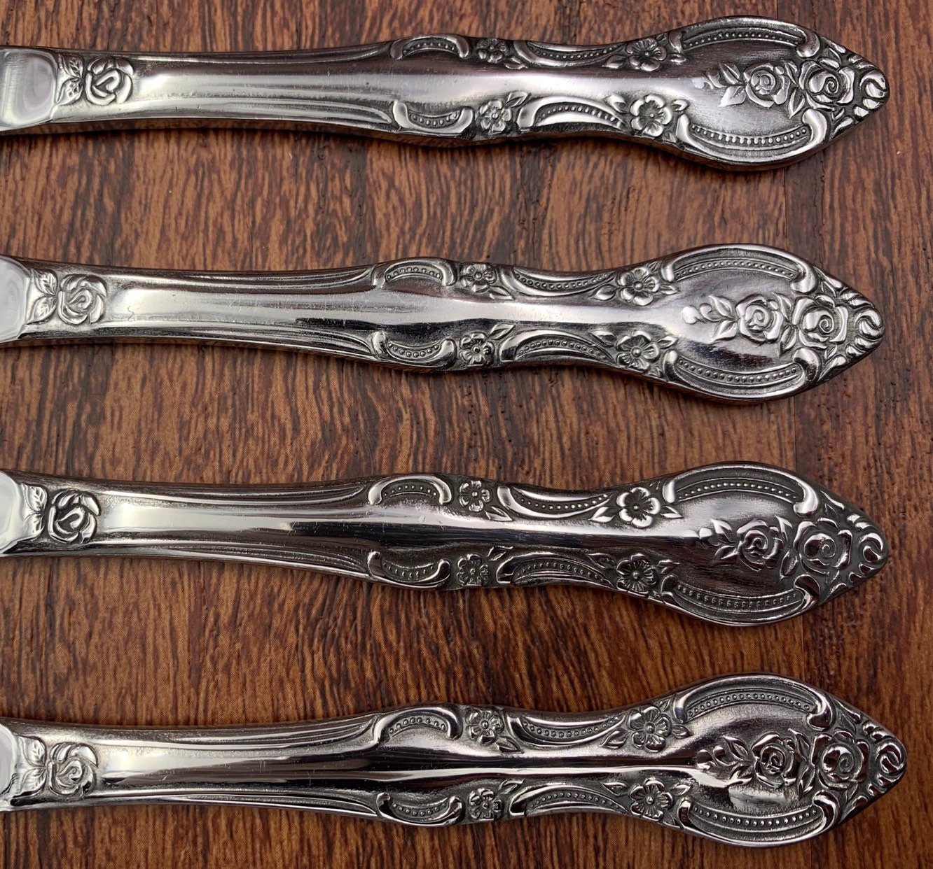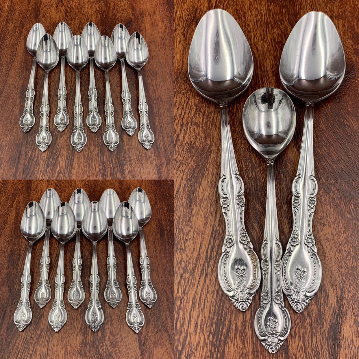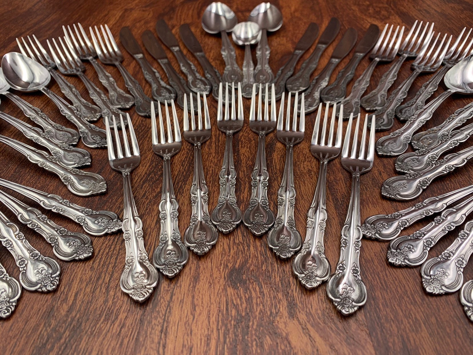 This is a complete set Vintage Stainless Steel Flatware in the Marseilles Pattern. It a complete set of 8 Place settings. This Lovely flatware is in an elegant embossed Floral Scroll pattern.