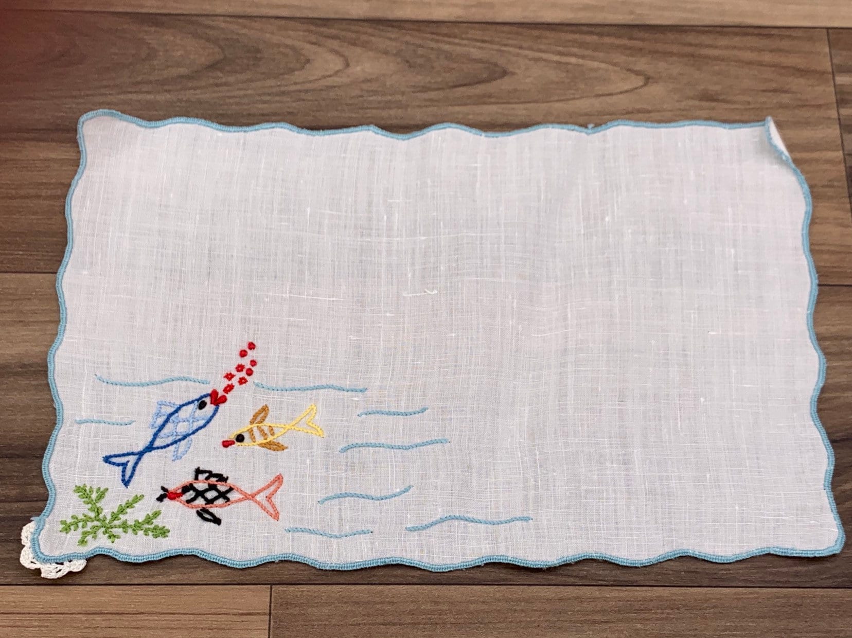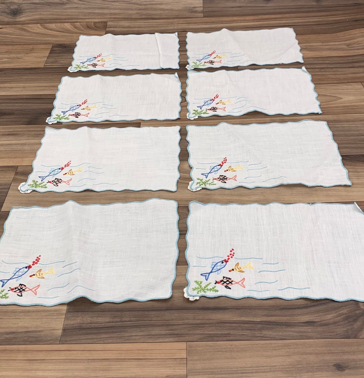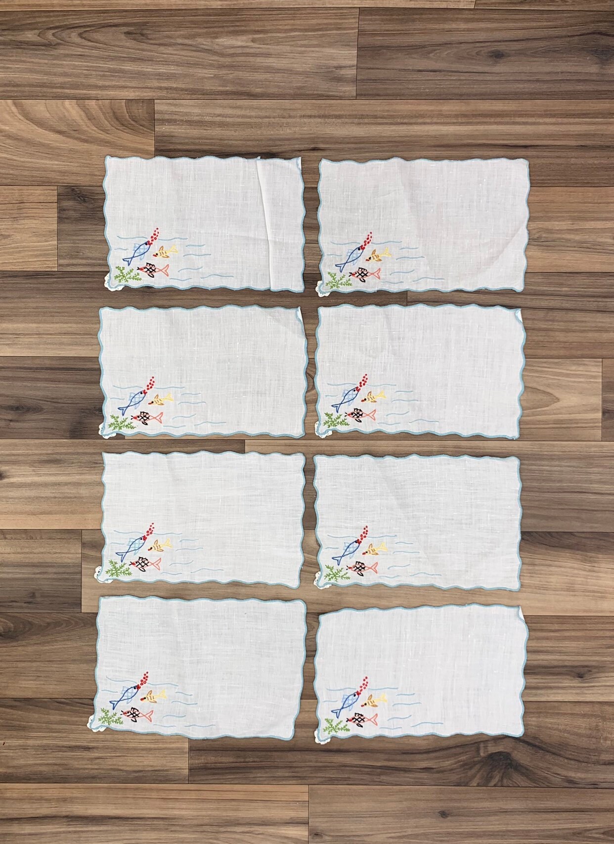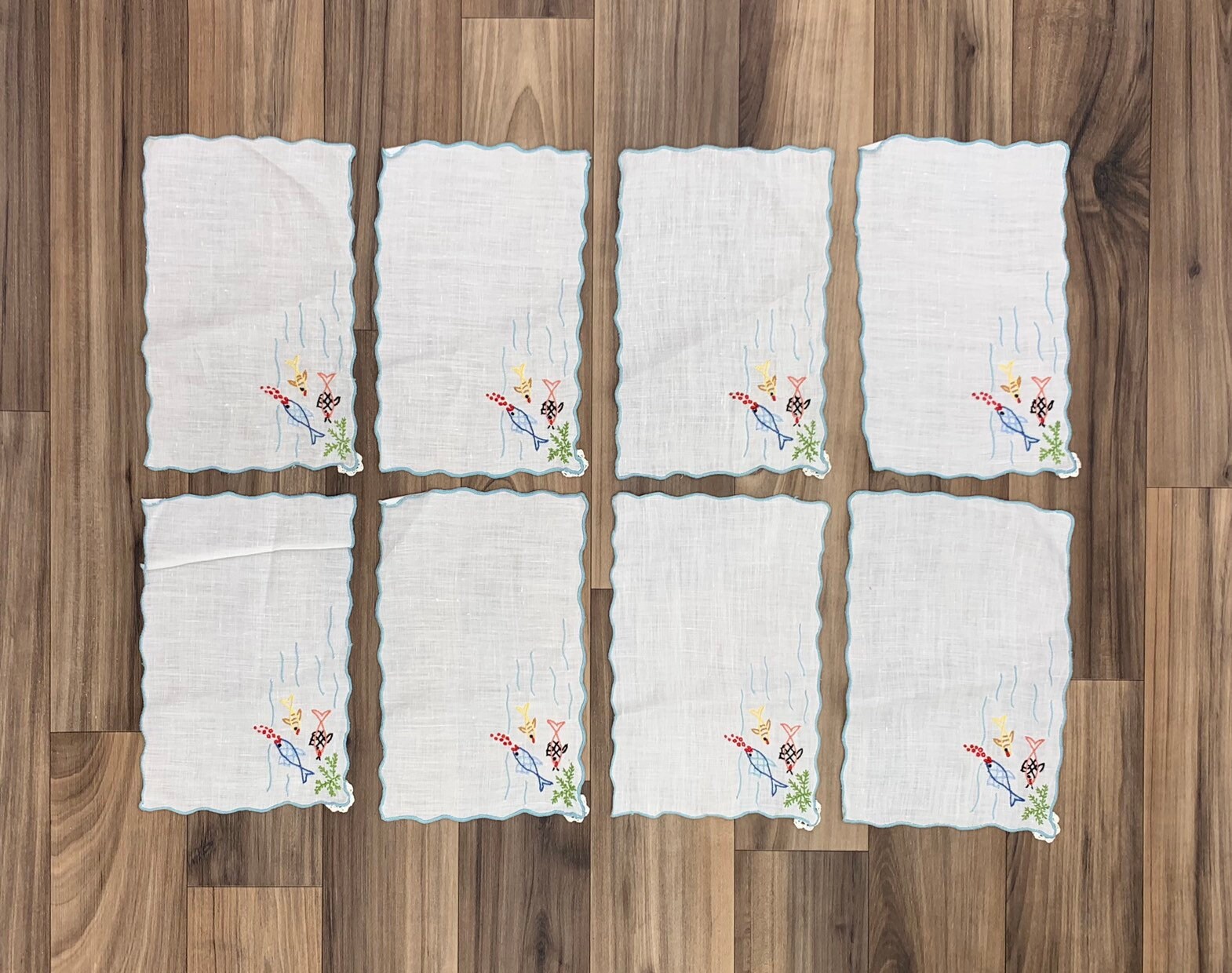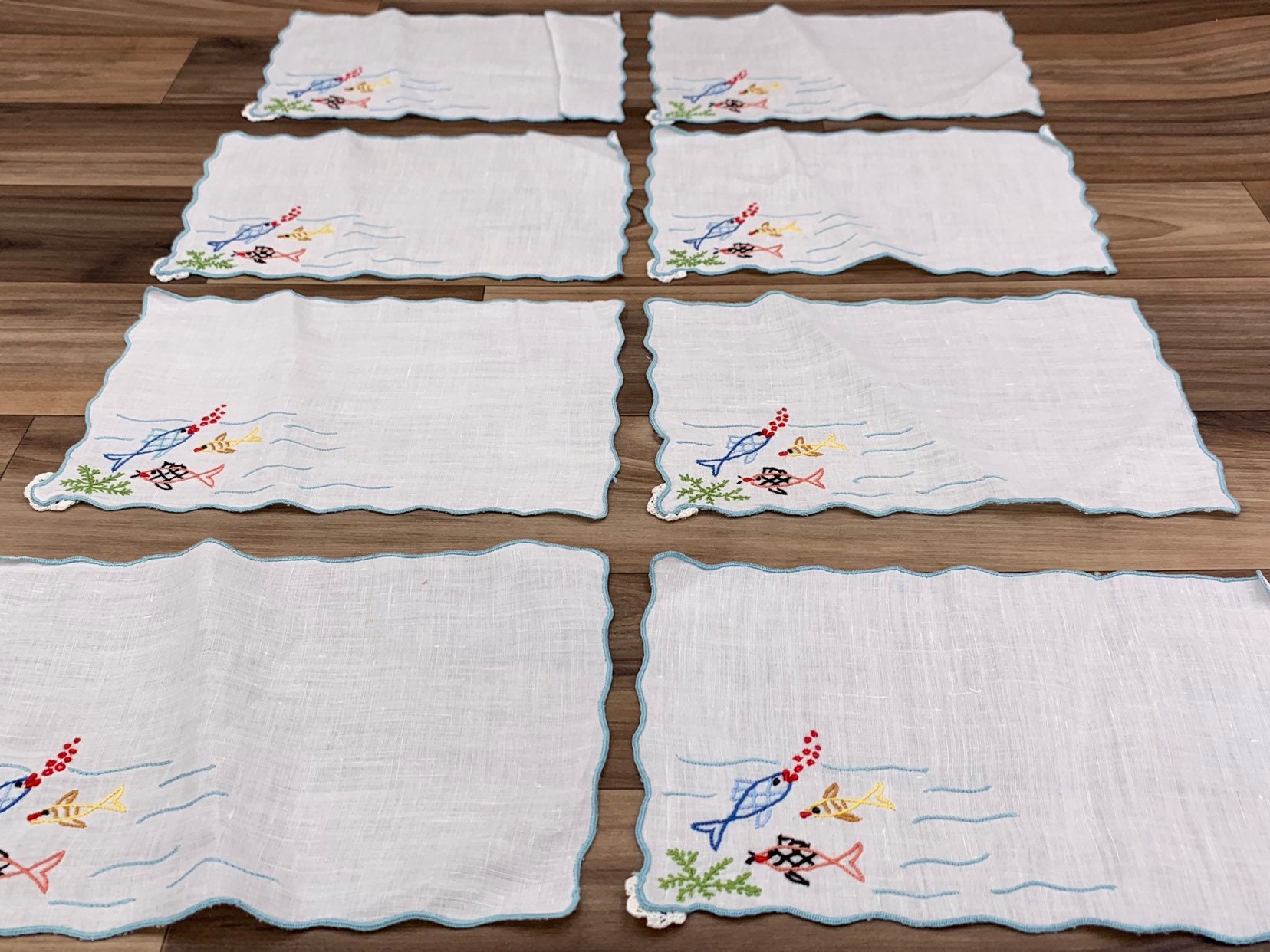 Vintage set of 8 cloth napkins Embroidered with a fun and colorful fish theme. Perfect for use at an outdoor party. These napkins were handmade.