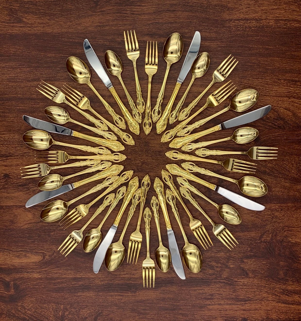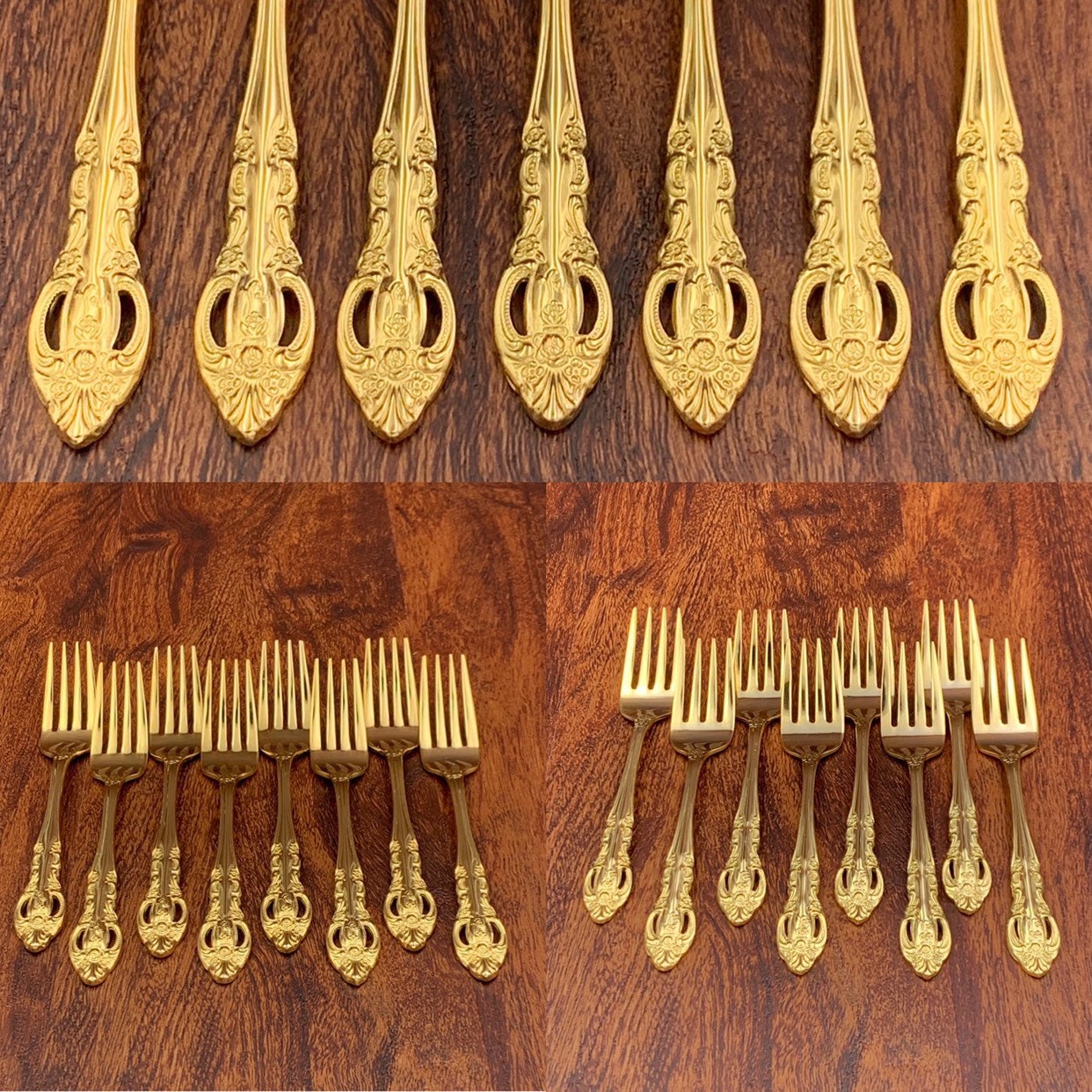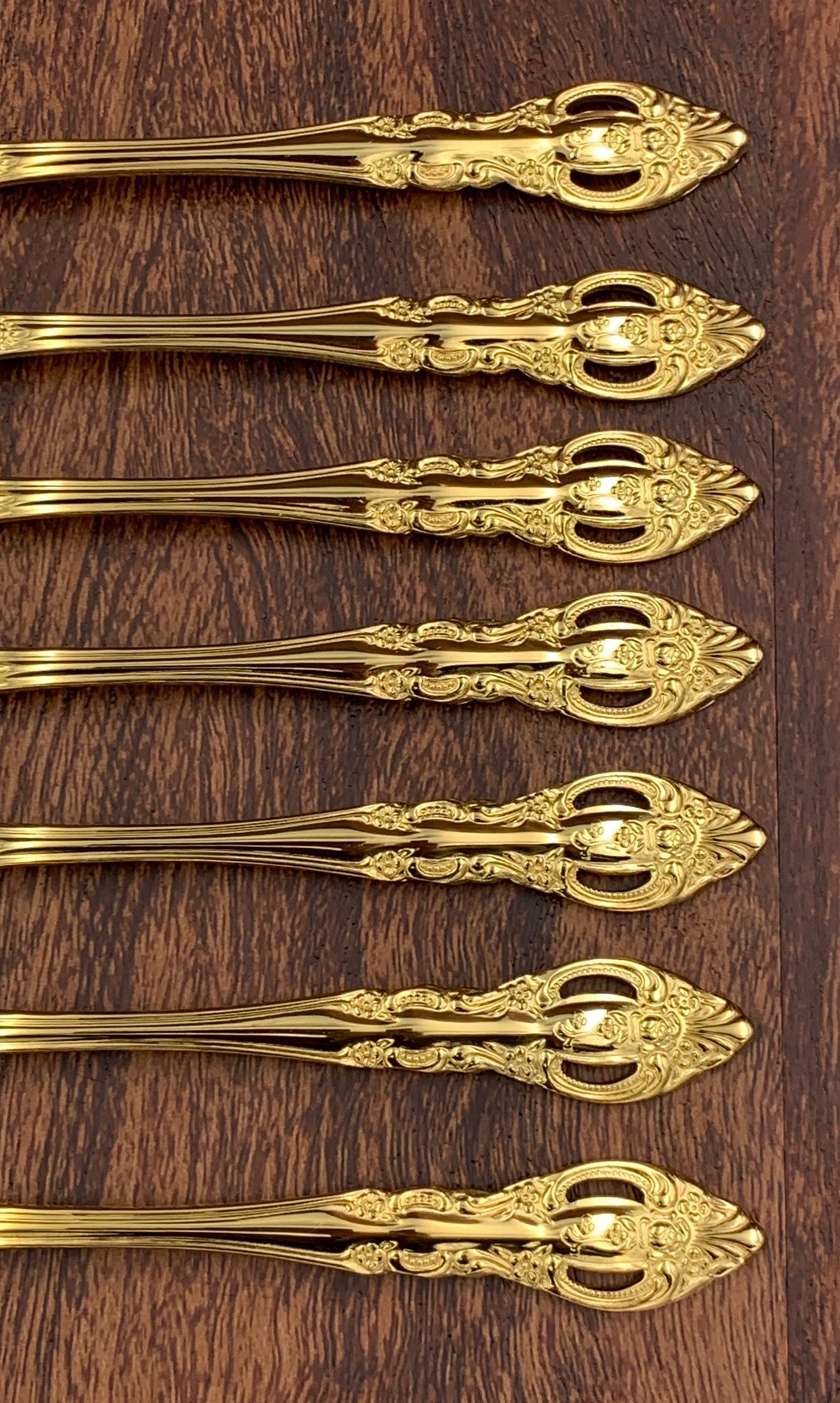 This is a lovey Gold Flatware set. This Gorgeous Stainless flatware is electroplated with Gold on an elegant Floral and scroll pattern. It is well made with a good balanced weight. The Handles have a wonderful pierced design.