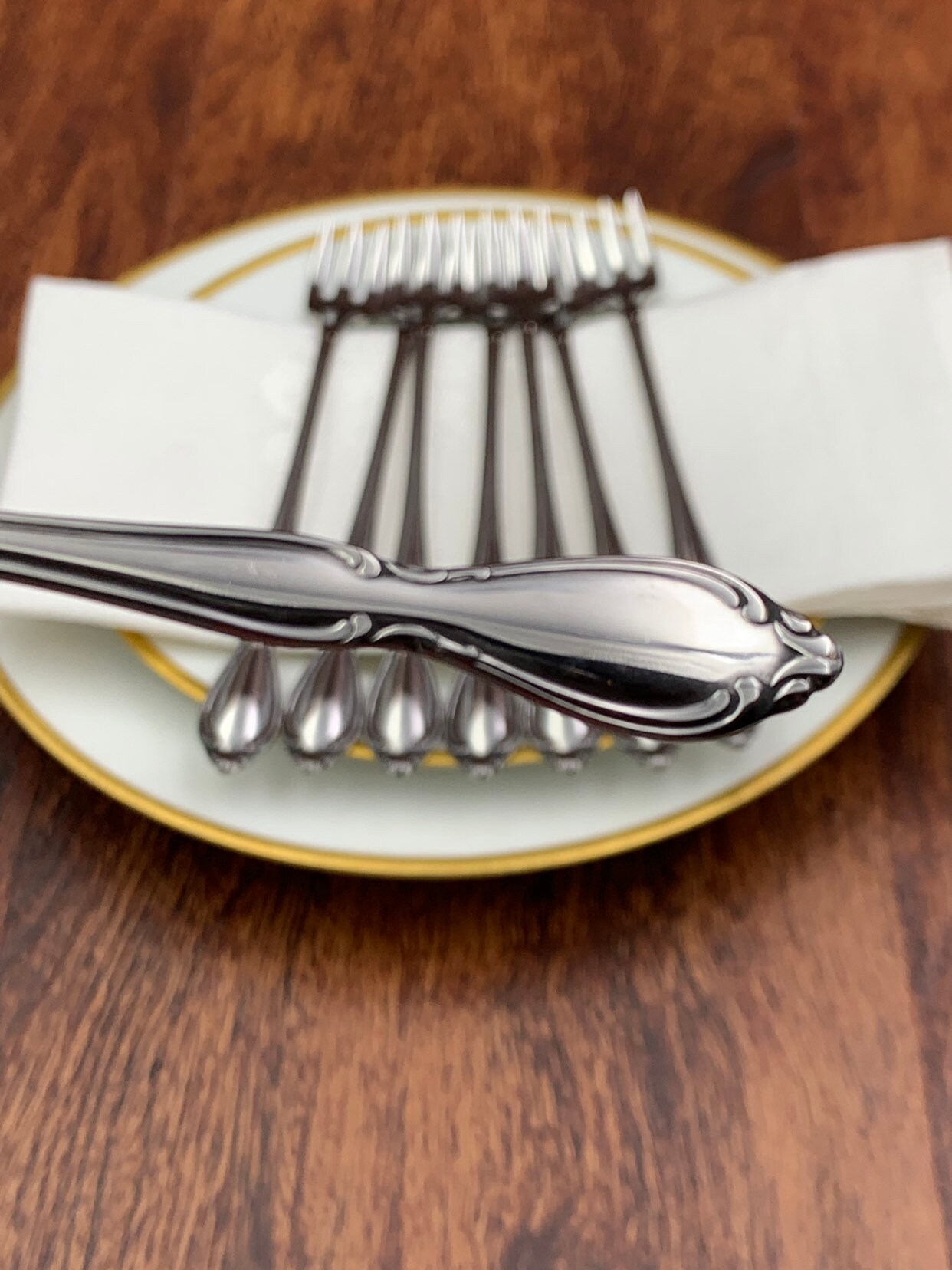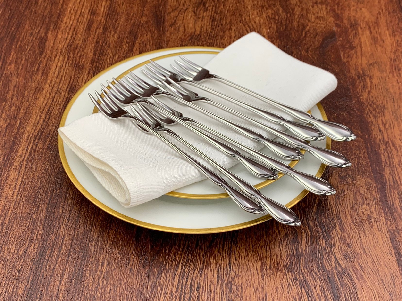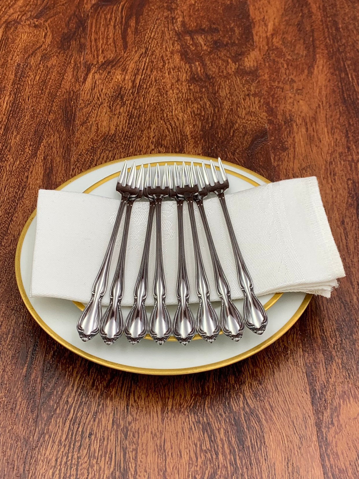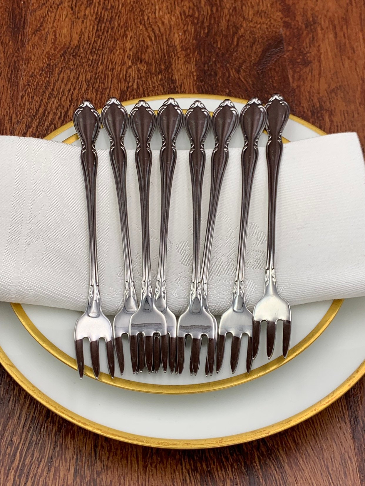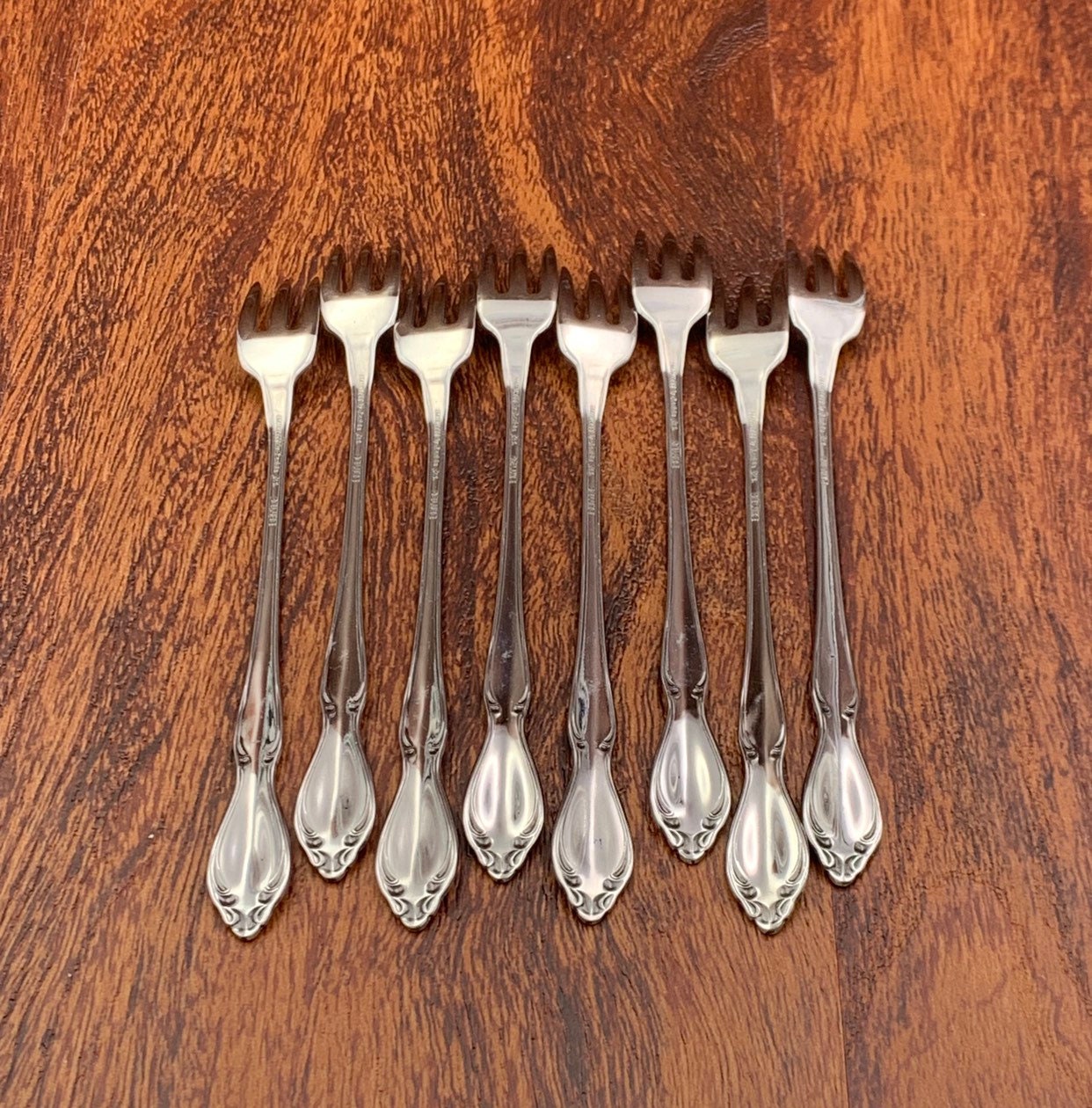 This is a Vintage set of 8 Stainless Steel appetizer forks. These precious little forks are so versatile! Can be used as seafood forks, cocktail forks or for appetizers. Each little fork has an ornate handle, decorated with classic Scrolls in the Oneida Deluxe pattern called Heritage (also called Royal York and Strathmore).