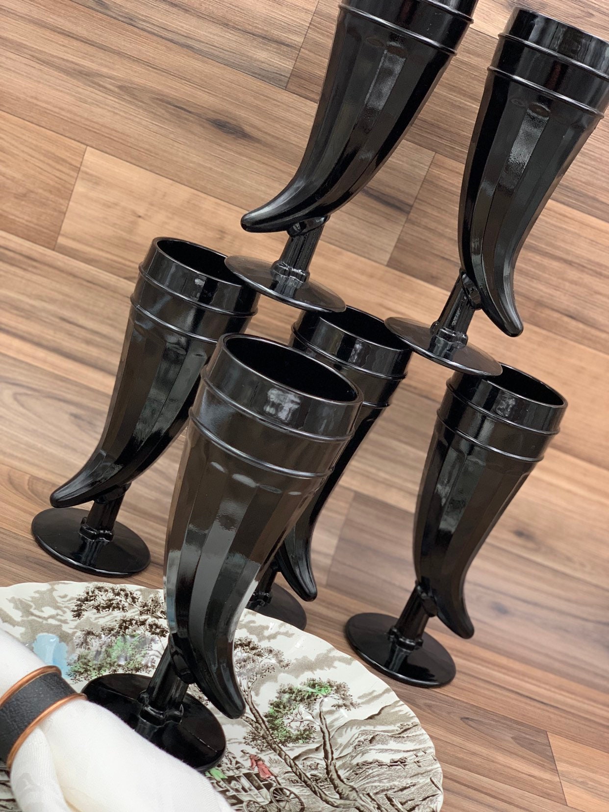 This is a gorgeous set of 6 Opaque Black Glasses in a Powder Horn Shape, on a pedestal base.