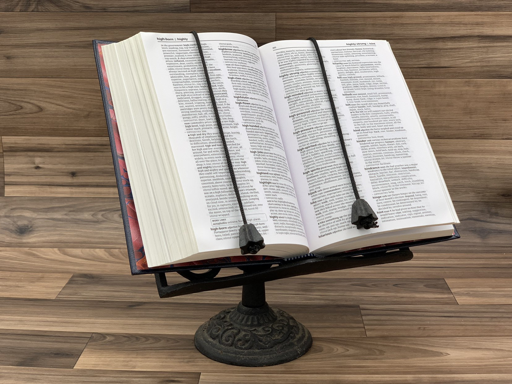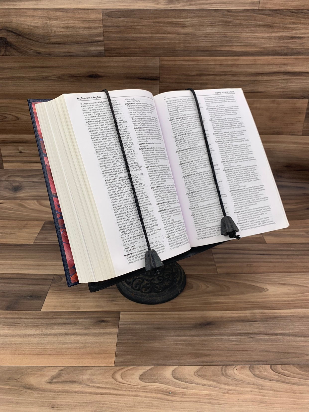 Stand measures 10" wide x 12" tall and 4 6/8" base diameter. Slant of shelf is adjustable from the back. It has weighted cords to hol pages open.