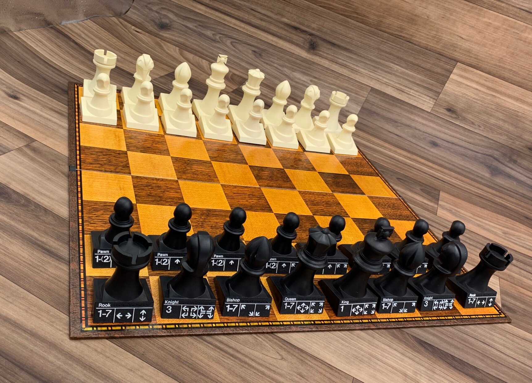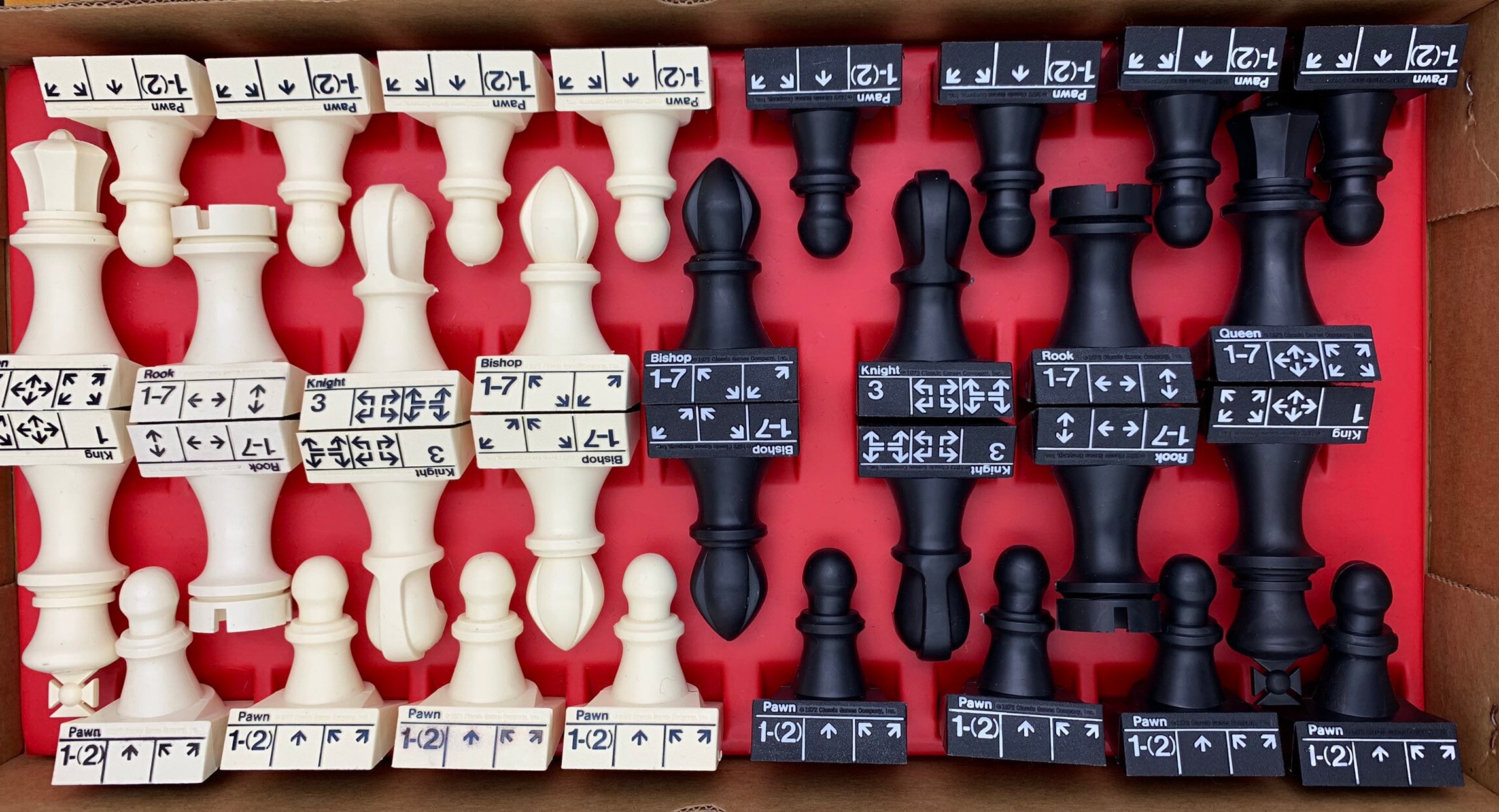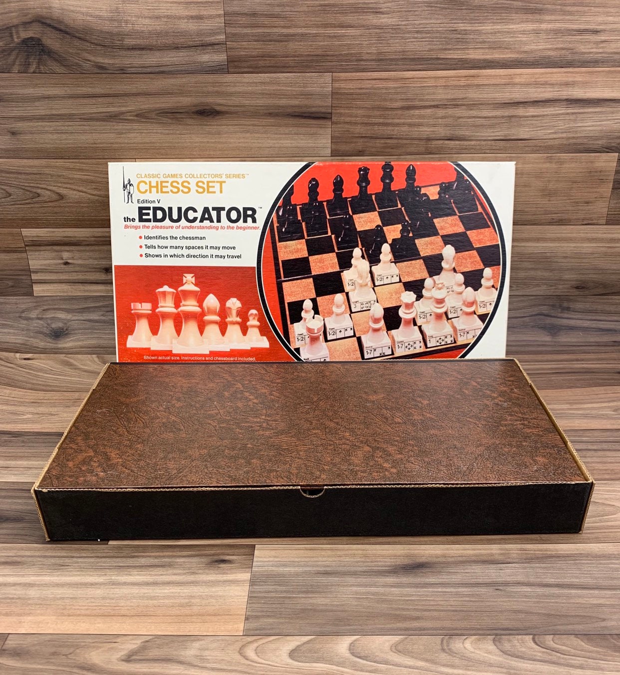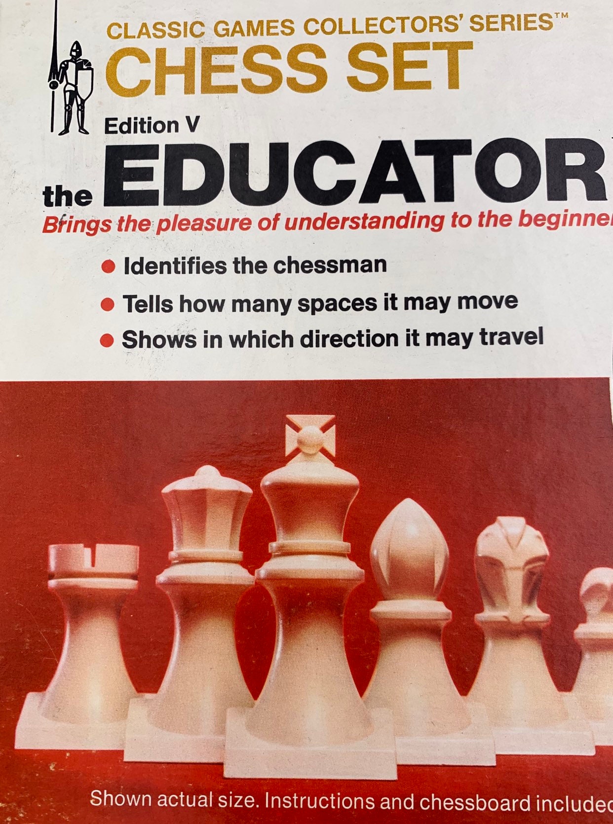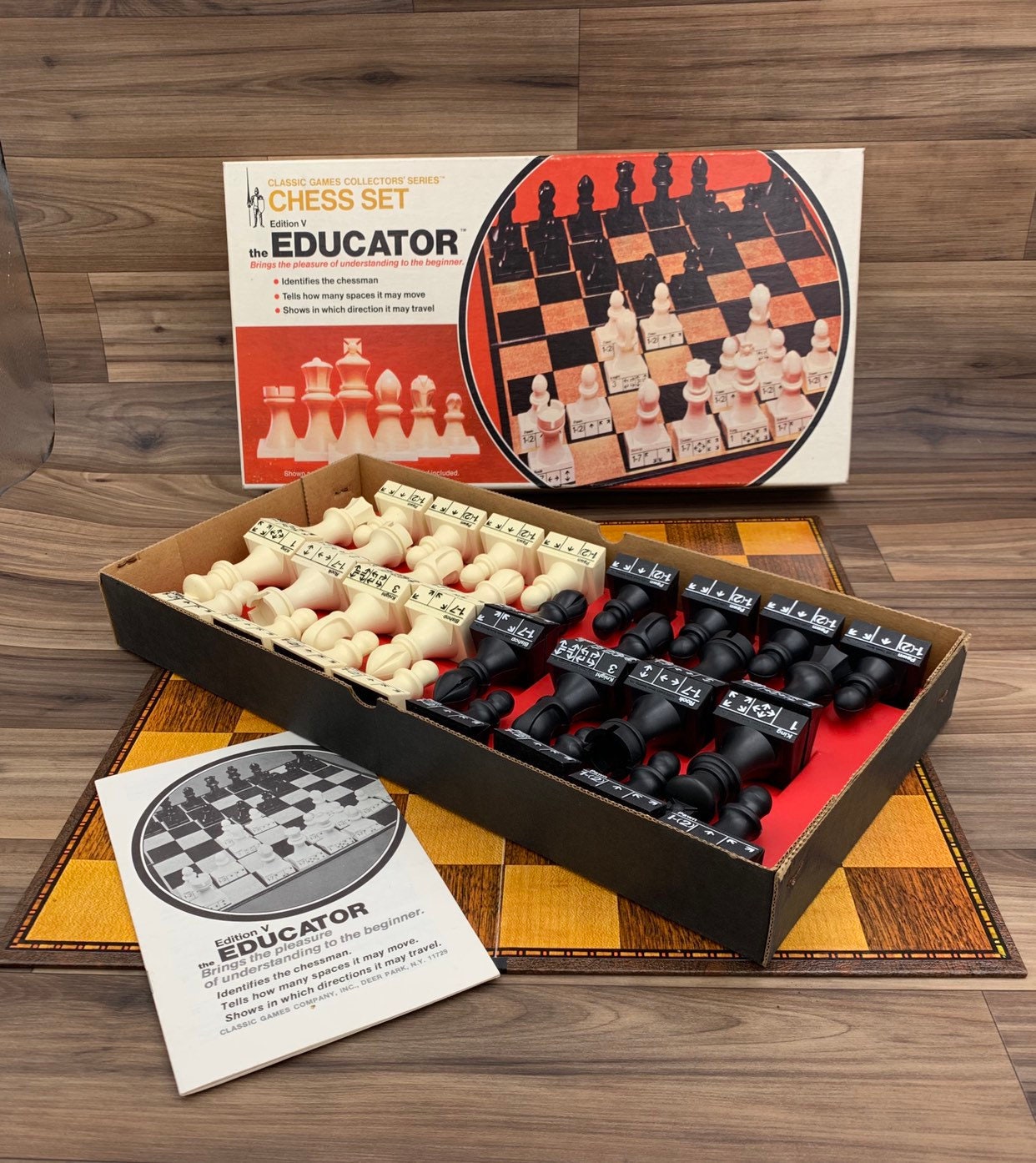 This is a Unique Beginners Chess set called the Educator. Part of the Classic Games Collectors Set, it has chess pieces made of molded plastic with felted bases. Each piece is marked with the identity of the piece, the direction it may move, and how many spaces it can move.