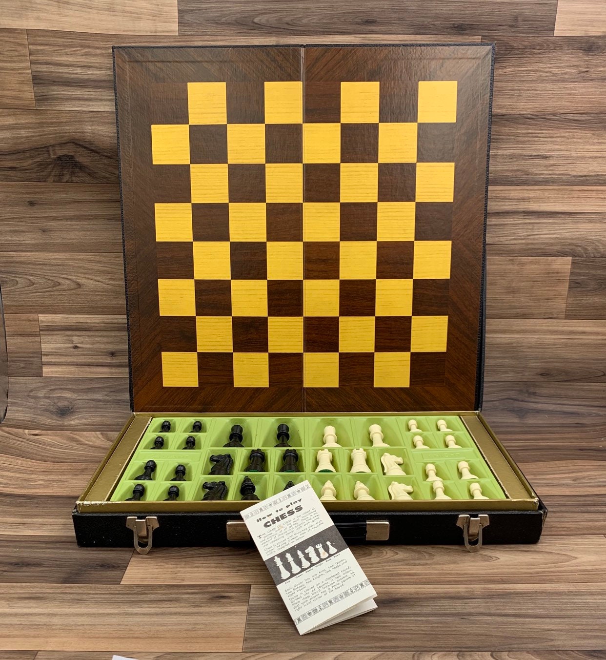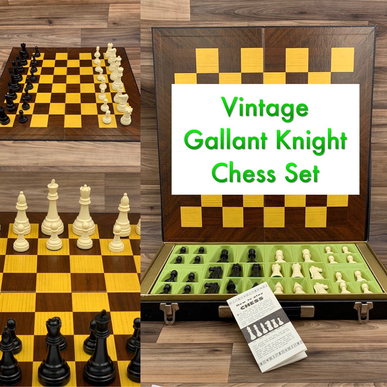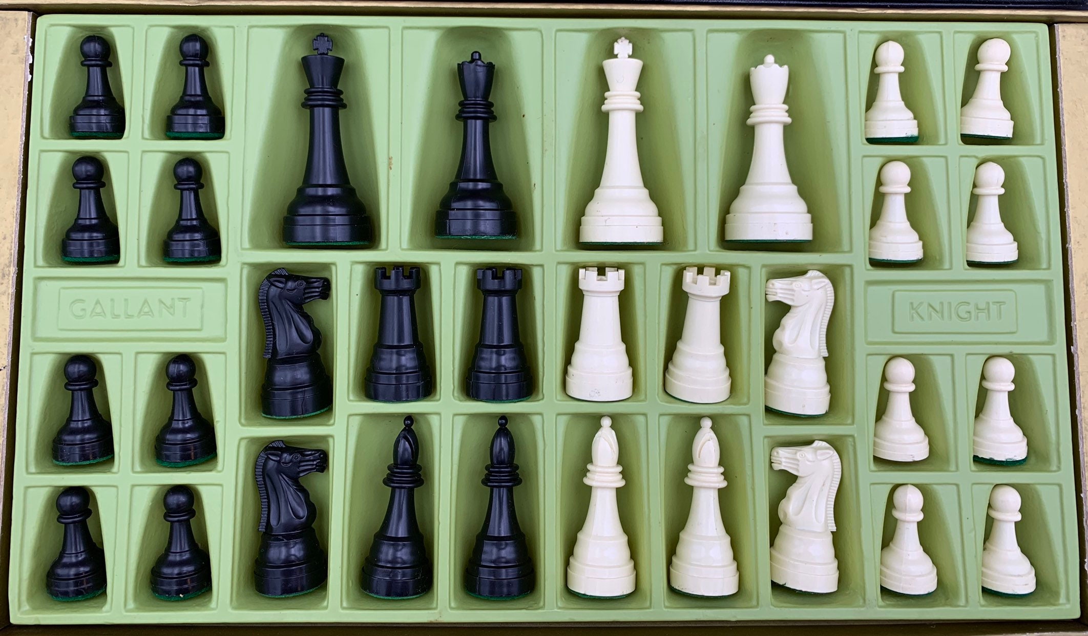 This is a Vintage Gallant Knight Chess Set. These chess pieces were made of molded plastic in Traditional colors with felted bases. The are contained in a paste board Storage case with plastic insert to organize the chessmen.